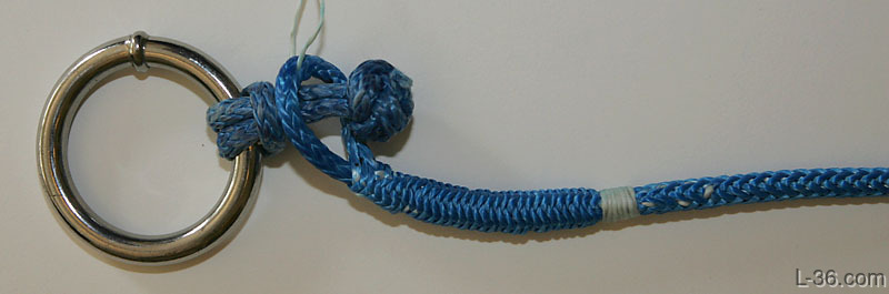 The second part is a loop with a locking stopper knot (a diamond knot). The loop goes on the halyard ring, loop, or headboard and does not come off. In use, the halyard loop is easily opened, put over the stationary loop knot, and secured by simply milking the extra loop out of the halyard. Different lengths of knot loops can be used for different applications. Note: I lock the diamond knot with considerable force using a bench vise to hold the tails and levers to pull on the loop before cutting the last inch off the tail of the knot. When the knot is set, it sounds like a rock when banged on a table. I had no slippage of the knot in my testing. Also, if for some reason you want full line strength, use the next size up line for this part. However, for many applications stretch is as important as strength and these are very strong. The stopper loop is attached to the sail using a larks head knot (luggage tag knot).