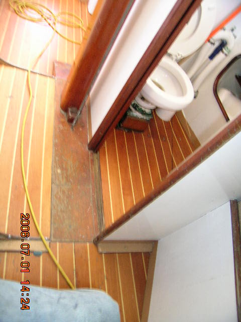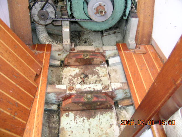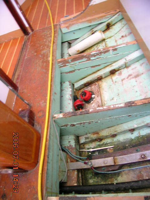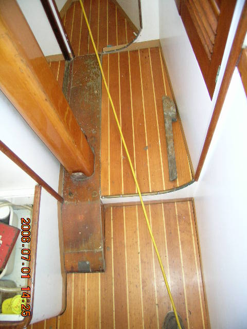 Shows the 3" wide laminated standoff frame under the 3 piece jockstrap. It was notched out for a through hull, no longer here, plug in hull visible. other things shown are the speed/log, toothbrush, green bonding wire, pvc pipe to allow limbering when anchor chain stowed in this frame bay, the taco preventer stay bolt, wedges at fore and aft mast heel, going down into step mortise, rusted 1/4" galv. floor to frame bolting.