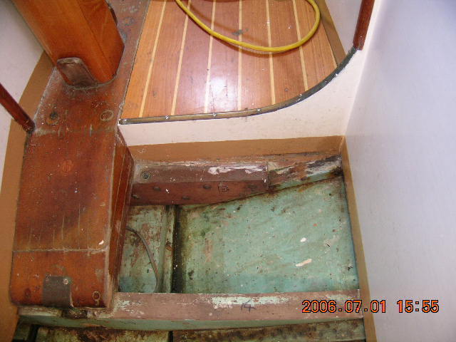 Shows bolted on sister floor, detail if aft end of step showing lamination lines, forwardmost ballast bolt top end covered with copper plate for access. Note sister floor and old floor sandwiches bulkhead, which is flush with upper surface of step Sister is atop frame.
