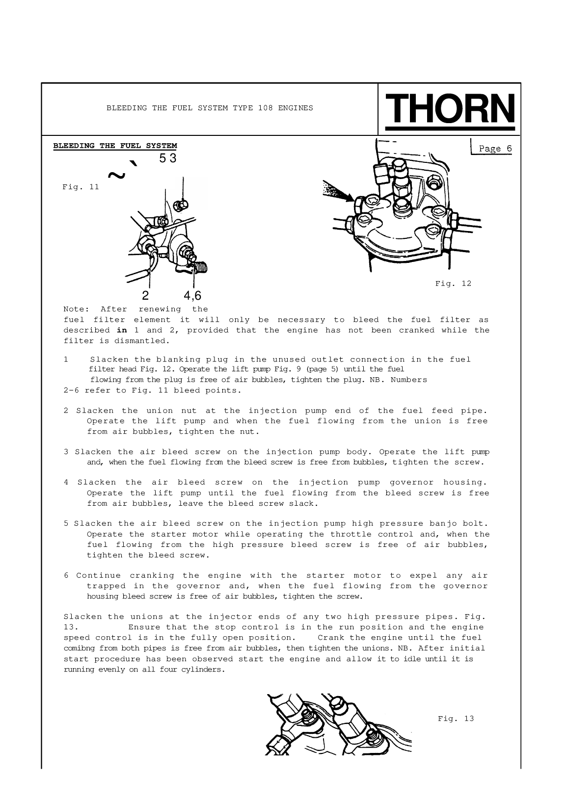 MARINE ENGINESThe Thornycroft 90 and 108 engines are both 4 cylinder 4 stroke high speed diesel units both engines having electrically operated heaterplugs to aid cold startingThe cast iro n crankcase with ri bbed sidewalls houses a forged steel crankshaft carried in three or five bearings respectivelyA full press ure wet sump lubric ation system is emplo yed with a full flowdetachable element type oil filter and integrated lubricating oil coolerThe cooling system is indirect and usually employs an engine mounted heatexchang er with a belt dr iven ra w wa ter pu mp This sy stem is known as I FWCinternal fresh water cooledAn optional system is EFWC external fresh water cooled This system utilizes theengine fresh water pump and usually employs skin tanks attached to the hull to serve as single belt driven alternator and fresh water pump drive include a manualbelt tensioning arrangement for low maintenance completes the package 904 Cylinder naturally aspirated 108 4 Cylinder naturally aspiratedPower intermittent at 3500rpm 36BHP Power intermittent at 3500rpm 47BHP continuous at 3000rpm 30BHP continuous at 3000rpm 38BHPMaximum torque at 2500rpm 531bf ft Maximum torque at 2400rpm 731bf ftIdle speed 570rpm Idle speed 570rpmMinimum full load speed 1500rpm Minimum full load speed 1500rpmENGINE RATINGSThe type 90 Engine may be set to develop continuous outputs from 135 to 30 BHP according type 108 Engine may be set to develop continuous outputs from 21 to 38 BHPaccording to special applications where full power will not be required for periods inexcess of 1 hour in any 12 hours consecutive running the engine can be supplied at anintermittent rating as shown aboveNOTE All horsepower ratings quoted are at the engine flywheel Due allowance mustbe made for transmission losses which will depend on the type of gearbox fittedFor tropical use it is necessary to derate the engine by 2 for each 5C 10Fabove 30C 85F air temperature at sea level In some parts of the wor ldfur the r de rat ing for h umi dity is n ece ssar y in acco rda nce withBS 55141 INITIAL STARTING OF ENGINEPAGE Engine mounting and dipstick marking Filling engine with oil 2 Lubricant specification for engine and gearbox Filling gearbox 3 inhibitor specification Filling cooling system 4 Priming the engine oil system 5 Bleeding the fuel system type 90 engines 6 Bleeding the fuel system type 108 engines 7 Initial start Normal start Running in 8 Operating guidelines 9 Operating guidelines MAINTENANCE Maintenance schedule Engine oil and filter change10 Engine oil and filter change11 Fuel filter change Cleaning Type 90 engines12 fuel lift pump Gearbox oil Type 108 engines13 change Cleaning air filter14 Alternator drive belt adjustment15 and replacement Raw water pump16 adjustment and replacement17 Checking and setting valve clearances Procedure for retorquing cylinder head nuts fuel injectors19 Changing coolant20 Draining raw water system21 External fresh water cooled engines22 Electrical system23 Fault finding24 Fault finding25 Laying up the engine26 Notes2829 CHECKING ENGINE MARKING DIPSTICK FILLING ENGINE WITH OILPage 1 CHECKING ENGINE MOUNTING The maximum installed angle of the engine is 15 engine types 902 108 and 1082 10 for engine type 90 This allows for a further rise of 4 when the craft is moving Check the angle of installation using the centreline of the mounting feet bolts as a datum Measure vertically on the centreline of the underside of the front mounting foot bolt to find the angle of installation Fig 1 Fig 1 Horizontal Line Type 90 Type 902 Type 108 A 93mm 10 A 138mm 150 A 136mm 15 46mm 5 93mm 10 91mm 10 46mm 5 46mm 5 MARKING DIPSTICK FILLING WITH OIL Your engine is despatched from the factory without engine or gearbox oil and with an unmarked engine dipstick After the boat is launched and is resting at its normal trim angle remove the oil filler cap from the rocker box Fig 2 and pour 39 litres for type 90 45 litres for type 902 or 48 litres for type 108 of specified lubricant through the filler hole Allow 5 minutes for the oil to drain into the sump withdraw the dipstick and mark it for maximum oil level Fig 3 Use a centre punch for marking as filing a notch can cause fatigue and eventual breakage while the engine is running Then mark dipstick using the same method 127mm below the maximum mark and this will be the minimum level LUBRICANT ENGINE AND GEARBOX THORNYCRO FT Page 2 ENGINE OILRUNNING IN OILSDo NOT use special runningin lubricating oils for new or rebuilt engines Use thelubricating oils specified for normal engine OIL VISCOSITY use of a multi graded lubric ating oil h as been fou nd to impro ve oilconsumption and improve engine cranking in cold temperatures while at high operating temperatures A multigrade oil conforming toMILL20104B is recommended with the viscosity grades shown in Fig 4 The use ofsingle grade lubricating oil is not recommended except for synthetic oils usedin arctic conditions Atmospheric Temperature Viscosity Above 10C 20W50 20C to 10C 1OW30 or 1OW40 Below 10C 5W30 or 5W40 Fig 4 GEARBOX OILBorg Warner Automatic Transmission Fluid T ype AHurth Automatic Trnamsission Fluid T ype ANewage PRM SAE 20 Engine Oil Minus 18C to 0C SAE 30 engine Oil Above 0C FILLING THE GEARBOXRemove the oil filler plug combined dipstick from the top of the gearbox This isin approximately the same position on Hurth Newage PRM and Borg Warner Usinga plastic bottle or funnel fill the gearbox up to the maximum mark on thedipstick There is one level mark on the Hurth dipstick the others have highand low marksFig 5THORNYCROFT COOLING SYSTEMPage 3 COOLANT Use antifreeze during all seasons to protect the engine cooling system from corrosion as well as freeze damage Using the following antifreeze solution 25 3 3 5 0 Solution Solution Solution Complete protection lOF12C 3F16C 4F20C Safe protection 1F17C 8F22C 18F28C In tropical climates where antifreeze availability may be limited corrosion inhibitor to protect the engine cooling syste