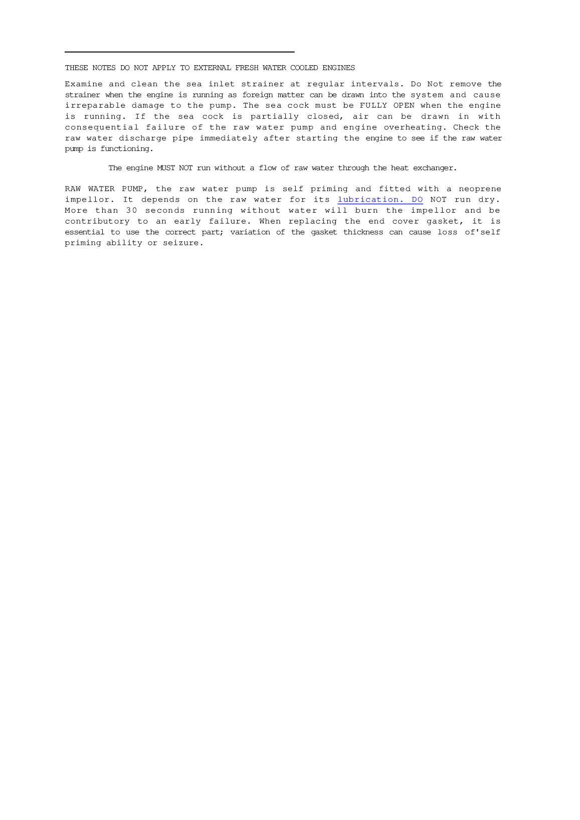 MARINE ENGINESThe Thornycroft 90 and 108 engines are both 4 cylinder 4 stroke high speed diesel units both engines having electrically operated heaterplugs to aid cold startingThe cast iro n crankcase with ri bbed sidewalls houses a forged steel crankshaft carried in three or five bearings respectivelyA full press ure wet sump lubric ation system is emplo yed with a full flowdetachable element type oil filter and integrated lubricating oil coolerThe cooling system is indirect and usually employs an engine mounted heatexchang er with a belt dr iven ra w wa ter pu mp This sy stem is known as I FWCinternal fresh water cooledAn optional system is EFWC external fresh water cooled This system utilizes theengine fresh water pump and usually employs skin tanks attached to the hull to serve as single belt driven alternator and fresh water pump drive include a manualbelt tensioning arrangement for low maintenance completes the package 904 Cylinder naturally aspirated 108 4 Cylinder naturally aspiratedPower intermittent at 3500rpm 36BHP Power intermittent at 3500rpm 47BHP continuous at 3000rpm 30BHP continuous at 3000rpm 38BHPMaximum torque at 2500rpm 531bf ft Maximum torque at 2400rpm 731bf ftIdle speed 570rpm Idle speed 570rpmMinimum full load speed 1500rpm Minimum full load speed 1500rpmENGINE RATINGSThe type 90 Engine may be set to develop continuous outputs from 135 to 30 BHP according type 108 Engine may be set to develop continuous outputs from 21 to 38 BHPaccording to special applications where full power will not be required for periods inexcess of 1 hour in any 12 hours consecutive running the engine can be supplied at anintermittent rating as shown aboveNOTE All horsepower ratings quoted are at the engine flywheel Due allowance mustbe made for transmission losses which will depend on the type of gearbox fittedFor tropical use it is necessary to derate the engine by 2 for each 5C 10Fabove 30C 85F air temperature at sea level In some parts of the wor ldfur the r de rat ing for h umi dity is n ece ssar y in acco rda nce withBS 55141 INITIAL STARTING OF ENGINEPAGE Engine mounting and dipstick marking Filling engine with oil 2 Lubricant specification for engine and gearbox Filling gearbox 3 inhibitor specification Filling cooling system 4 Priming the engine oil system 5 Bleeding the fuel system type 90 engines 6 Bleeding the fuel system type 108 engines 7 Initial start Normal start Running in 8 Operating guidelines 9 Operating guidelines MAINTENANCE Maintenance schedule Engine oil and filter change10 Engine oil and filter change11 Fuel filter change Cleaning Type 90 engines12 fuel lift pump Gearbox oil Type 108 engines13 change Cleaning air filter14 Alternator drive belt adjustment15 and replacement Raw water pump16 adjustment and replacement17 Checking and setting valve clearances Procedure for retorquing cylinder head nuts fuel injectors19 Changing coolant20 Draining raw water system21 External fresh water cooled engines22 Electrical system23 Fault finding24 Fault finding25 Laying up the engine26 Notes2829 CHECKING ENGINE MARKING DIPSTICK FILLING ENGINE WITH OILPage 1 CHECKING ENGINE MOUNTING The maximum installed angle of the engine is 15 engine types 902 108 and 1082 10 for engine type 90 This allows for a further rise of 4 when the craft is moving Check the angle of installation using the centreline of the mounting feet bolts as a datum Measure vertically on the centreline of the underside of the front mounting foot bolt to find the angle of installation Fig 1 Fig 1 Horizontal Line Type 90 Type 902 Type 108 A 93mm 10 A 138mm 150 A 136mm 15 46mm 5 93mm 10 91mm 10 46mm 5 46mm 5 MARKING DIPSTICK FILLING WITH OIL Your engine is despatched from the factory without engine or gearbox oil and with an unmarked engine dipstick After the boat is launched and is resting at its normal trim angle remove the oil filler cap from the rocker box Fig 2 and pour 39 litres for type 90 45 litres for type 902 or 48 litres for type 108 of specified lubricant through the filler hole Allow 5 minutes for the oil to drain into the sump withdraw the dipstick and mark it for maximum oil level Fig 3 Use a centre punch for marking as filing a notch can cause fatigue and eventual breakage while the engine is running Then mark dipstick using the same method 127mm below the maximum mark and this will be the minimum level LUBRICANT ENGINE AND GEARBOX THORNYCRO FT Page 2 ENGINE OILRUNNING IN OILSDo NOT use special runningin lubricating oils for new or rebuilt engines Use thelubricating oils specified for normal engine OIL VISCOSITY use of a multi graded lubric ating oil h as been fou nd to impro ve oilconsumption and improve engine cranking in cold temperatures while at high operating temperatures A multigrade oil conforming toMILL20104B is recommended with the viscosity grades shown in Fig 4 The use ofsingle grade lubricating oil is not recommended except for synthetic oils usedin arctic conditions Atmospheric Temperature Viscosity Above 10C 20W50 20C to 10C 1OW30 or 1OW40 Below 10C 5W30 or 5W40 Fig 4 GEARBOX OILBorg Warner Automatic Transmission Fluid T ype AHurth Automatic Trnamsission Fluid T ype ANewage PRM SAE 20 Engine Oil Minus 18C to 0C SAE 30 engine Oil Above 0C FILLING THE GEARBOXRemove the oil filler plug combined dipstick from the top of the gearbox This isin approximately the same position on Hurth Newage PRM and Borg Warner Usinga plastic bottle or funnel fill the gearbox up to the maximum mark on thedipstick There is one level mark on the Hurth dipstick the others have highand low marksFig 5THORNYCROFT COOLING SYSTEMPage 3 COOLANT Use antifreeze during all seasons to protect the engine cooling system from corrosion as well as freeze damage Using the following antifreeze solution 25 3 3 5 0 Solution Solution Solution Complete protection lOF12C 3F16C 4F20C Safe protection 1F17C 8F22C 18F28C In tropical climates where antifreeze availability may be limited corrosion inhibitor to protect the engine cooling syste