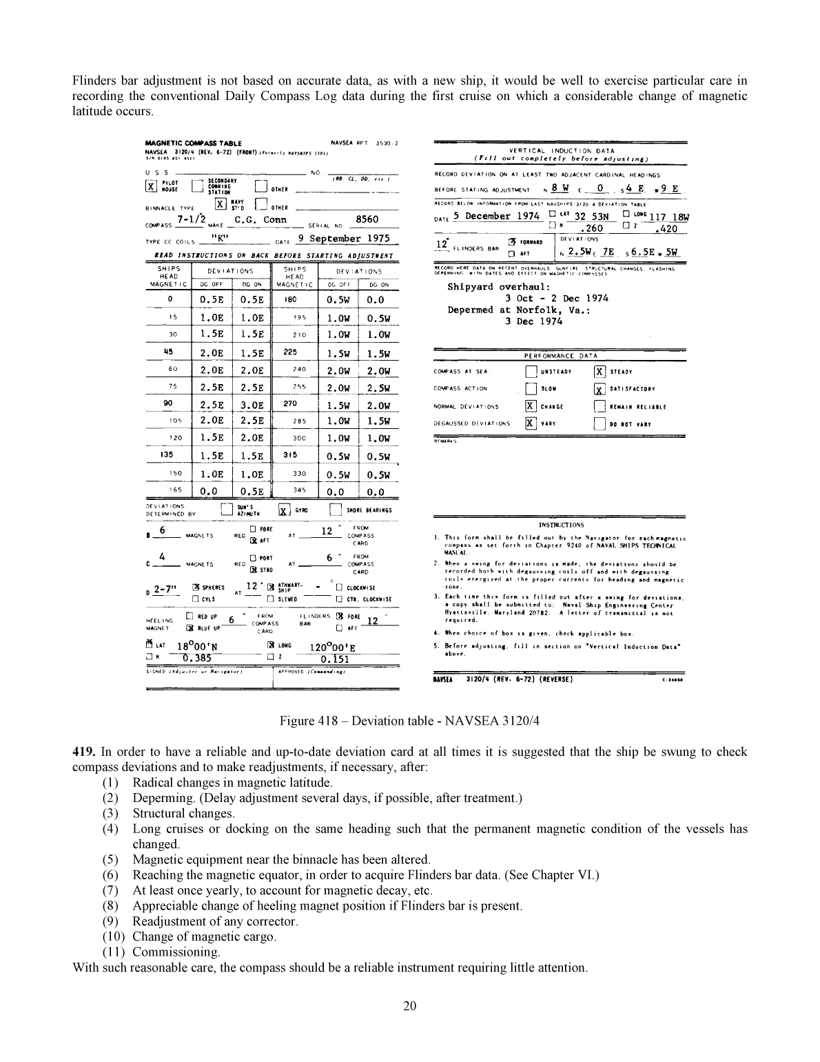 HANDBOOK OF MAGNETIC COMPASS ADJUSTMENT AGENCY BETHESDA MD 2004 Formerly PubNo 226 AS ORIGINALLY PUBLISHED BY DEFENSE MAPPING AGENCY CENTER WASHINGTON DC 1980 INTRODUCTION This document has been prepared in order to present all pertinent information regarding the practical procedures ofmagnetic compass adjustment in one text As such it treats of the basic principles of compass deviations and their correctionand not of the details of particular compass equipment Although this text is presented as a systematic treatise on compass adjustment ships personnel who are inexperienced withcompass correction will find sufficient information in Chapters I and XIV to eliminate compass errors satisfactorily study of the entire text Reference should also be made to figure 318 for condensed information regarding thevarious compass errors and their correction In this handbook the term compass adjustment refers to any changes of permanent magnet of soft iron correctors wherebynormal compass errors are reduced The term compass compensation refers to any change in the current supplied to coils whereby the errors due to degaussing are reduced The basic text is the outgrowth of lecture notes prepared by Nye S Spencer and George F Kucera while presenting coursesof instruction in adjustment and compensation during World War II at the Magnetic Compass Demonstration Station NavalOperating Base Norfolk Virginia CHAPTER I PROCEDURES FOR MAGNETIC COMPASS ADJUSTMENT CHECKOFF LISTNOTE If the magnetic adjustment necessitates a movement of degaussing compensating coils or b a change of Flindersbar length the coil compensation must be checked Refer to Chapter XIV101 Dockside tests and adjustments 1 Physical checks on the compass and binnacle a Remove any bubbles in compass bowl article 402 b Test for moment and sensibility of compass needles article 403 c Remove any slack in gimbal arrangement d Magnetization check of spheres and Flinders bar article 404 e Alignment of compass with foreandaft line of ship article 405 f Alignment of magnets in binnacle g Alignment of heeling magnet tube under pivot point of compass h See that corrector magnets are available 2 Physical checks of gyro azimuth circle and peloruses a Alignment of all gyro repeater peloruses or dial peloruses with foreandaft line of ship article 405 b Synchronize gyro repeaters with master gyro c Make sure azimuth circle and peloruses are in good operating condition 3 Necessary data a Past history or log data which might establish length of Flinders bar articles 407 and 607 b Azimuths for given date and observers position Chapter VIII c Ranges or distant objects in vicinity local charts d Correct variation local charts e Degaussing coil current settings for swing for residual deviations after adjustment and compensation ships Degaussing Folder 4 Precautions a Determine transient deviations of compass from gyro repeaters doors guns etc Chapter X b Secure all effective magnetic gear in normal seagoing position before beginning adjustments c Make sure degaussing coils are secured before beginning adjustments Use reversal sequence if necessary d Whenever possible correctors should be placed symmetrically with respect to the compass articles 318 and 613 5 Adjustments a Place Flinders bar according to best available information articles 407 608 and 609 b Set spheres at midposition or as indicated by last deviation table c Adjust heeling magnet using balanced dip needle if available Chapter XI Applies when system other than gyro is used as heading reference 1102 Adjustments at sea These adjustments are made with the ship on an even keel and after steadying on each headingWhen using the gyro swing from heading to heading slowly and check gyro error by suns azimuth or ranges on each headingif desired to ensure a greater degree of accuracy article 706 Be sure gyro is set for the mean speed and latitude of thevessel Note all precautions in article 1014 above OSCAR QUEBEC international code signal should be flown toindicate such work is in progress Chapter VII discusses methods for placing the ship on desired headings 1 Adjust the heeling magnet while the ship is rolling on north and south magnetic heading until the oscillations of the compass card have been reduced to an average minimum This step is not required if prior adjustment has been made using a dip needle to indicate proper placement of the heeling magnet 2 Come to an east 090 cardinal magnetic heading Insert foreandaft B magnets or move the existing B magnets in such a manner as to remove all deviation 3 Come to a south 180 magnetic heading Insert athwartship C magnets or move the existing C magnets in such a manner as to remove all deviation 4 Come to a west 270 magnetic heading Correct half of any observed deviation by moving the B magnets 5 Come to a north 000 magnetic heading Correct half of any observed deviation by moving the C magnets The cardinal heading adjustments should now be complete 6 Come to any intercardinal magnetic heading eg northeast 045 Correct any observed deviation by moving the spheres in or out 7 Come to the next intercardinal magnetic heading eg southeast 135 Correct half of any observed deviation by moving the spheres The intercardinal heading adjustments should now be complete although more accurate results might be obtained by correcting the D error determined from the deviations on all four intercardinal heading as discussed in article 501 8 Secure all correctors before swinging for residual deviations 9 Swing for residual undegaussed deviations on as many headings as desired although the eight cardinal and intercardinal headings should be sufficient 10 Should there still be any large deviations analyze the deviation curve to determine the necessary corrections and repeat as necessary steps 1 through 9 above Chapter V 11 Record deviations and the details of corrector positions on standard Navy Form NAVSEA 31204 and in the Magnetic Compass Record NAVSEA 31203 article 901 12 Swing f