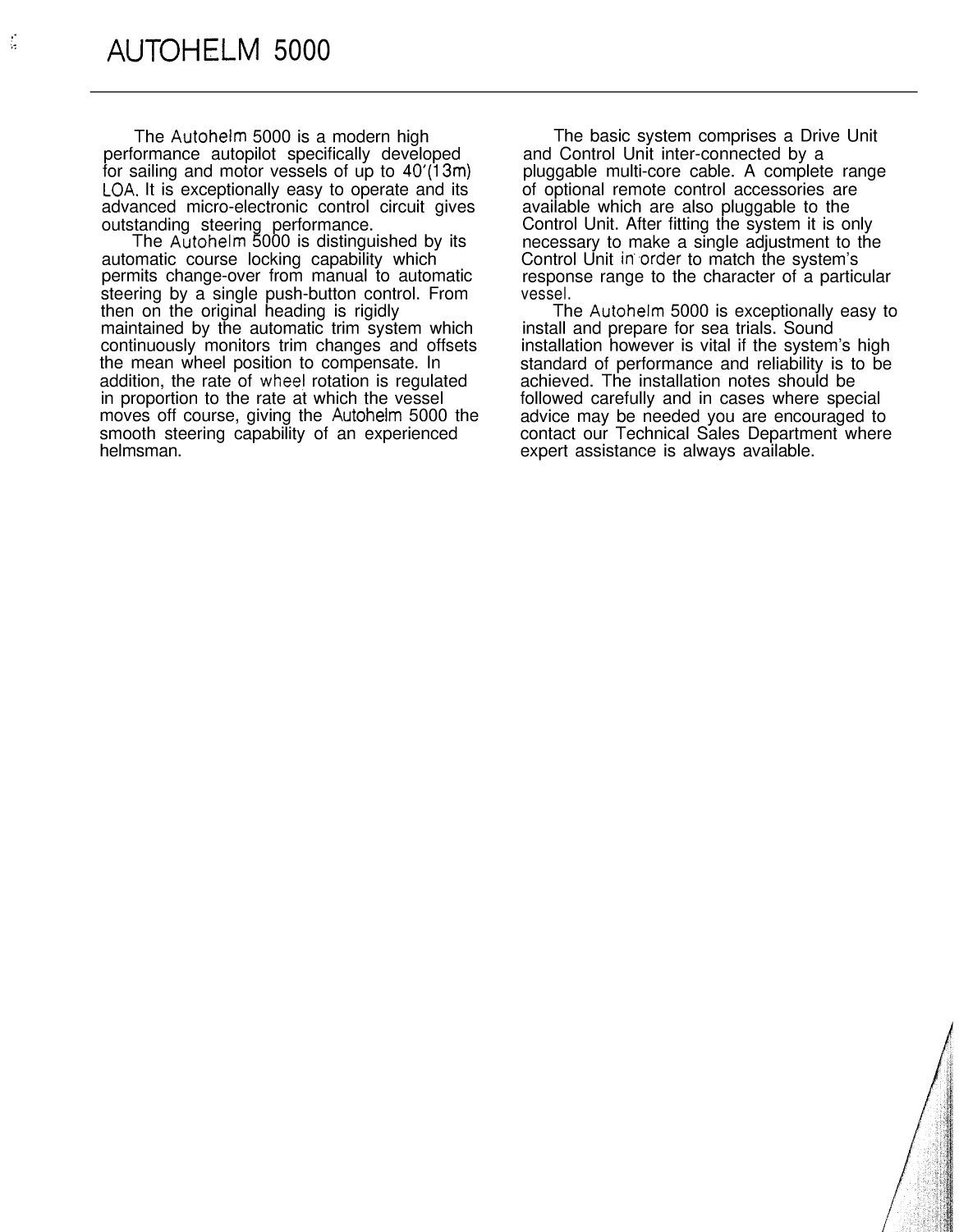 Distributed by Any reference to Raytheon orRTN in this manual should be interpreted as RaymarineThe names Raytheon and RTN are owned by the Raytheon Company Installation and Operating Handbook AUTOHELM 5000 The Autohelm 5000 is a modern high The basic system comprises a Drive Unit performance autopilot specifically developed and Control Unit interconnected by a for sailing and motor vessels of up to 4013m pluggable multicore cable A complete range LOA It is exceptionally easy to operate and its of optional remote control accessories are advanced control circuit gives available which are also pluggable to the outstanding steering performance Control Unit After fitting the system it is only The Autohelm 5000 is distinguished by its necessary to make a single adjustment to the automatic course locking capability which Control Unit inorder to match the systems permits changeover from manual to automatic response range to the character of a particular steering by a single pushbutton control From vessel then on the original heading is rigidly The Autohelm 5000 is exceptionally easy to maintained by the automatic trim system which install and prepare for sea trials Sound continuously monitors trim changes and offsets installation however is vital if the systems high the mean wheel position to compensate In standard of performance and reliability is to be addition the rate of wheel rotation is regulated achieved The installation notes should be in proportion to the rate at which the vessel followed carefully and in cases where special moves off course giving the Autohelm 5000 the advice may be needed you are encouraged to smooth steering capability of an experienced contact our Technical Sales Department where helmsman expert assistance is always available I O SYSTEM DESCRIPTION The Autohelm 5000 is a modular system A simple remote control installation is that can be built up from a minimum number of illustrated in Fig 2 The auxiliary control units to match the individual repeats the basic working controls of the of a wide range of sailing and control unit and is suitable for extendingpower vessels The rudder drive system may be autopilot control to a secondary steeringchosen from a range of rotary linear and position Alternatively in the case of a drive units to best suit the vessels yacht for example the auxiliary control unitparticular steering system provides a watertight cockpit control enabling The most basic installation Fig 1 consists the control unit to be mounted in a protectedof a control unit interconnected by a pluggable position below deckcable system to a drive unit This installation The full remote control system Fig 3would be suitable for a motor vessel with a provides the addition of a handheld remotesingle enclosed steering position and where no control exists for remote control remote control unit type DO73 maybe plugged directly into the Control Unitauxiliary socket DIRECT REMOTE DRIVE UNIT CONTROL D073 CONTROL UNIT OPTION 20 AMP FUSE DC SUPPLYFig 1 Basic System DRIVE UNIT 20 AMP FUSE DC SUPPLYFig 2 Basic Remote Control System DRIVE UNIT f CONTROL UNIT 20 AMP FUSE J 1 HAND HELD REMOTE CONTROL 0093 REMOTE SOCKET mD C SUPPLY Ef AUXILIARY CONTROL UNITFig 3 Full Remote Contrd System1 l CONTROL SYSTEM 11 l CONTROL UNITThe control unit is common to all installations Rotary controls for course alteration rudderand is provided with six metres of multicore response and sea state are grouped on thecable with preconnected plugs and sockets to control unit facia together with the to the drive unit It houses the main primary working controls A secondary gaincontrol circuit PCB together with the automatic control is inset into the rear case to allowcourse following compass system The control adjustment of the systems rudder responseunit case is splash proof but not watertight and range to match the widely differing steeringis therefore intended for mounting in a dry and of both planing andprotected position Two sockets are provided displacement vessels The control unit ison the rear case for connecting the drive unit suitable for use on 12 volt systemsand remote control system I 1 r i 142mm 5 VI 1 12 REMOTE CONTROL ACCESSORIES 1 I 3 AUXILIARY CONTROL UN IT Autopilot control may be transferred to the auxiliary control unit by depressing the Remote pushbutton on the main control unit facia The auxiliary control unit is watertight and designed for flush mounting in severely exposed positions 32 81 mm It is provided with six metres of cable terminated in a waterproof plug for direct r 1 OOmm 3 9U connection to the control unit A connector is situated on the rear case for connecting hand held remote control deck socket 1 14 REMOTE CONTROL UNITSThe remote control is a handheld unit that ienables the autopilot to be overriden and the Auxiliary control Unit DO69 86mm 3 38vessel to be power steered from anywhere onboard The unit is fitted with a sixmetre flyinglead Type DO73 is suitable for to the Control Unit auxiliary socket 35mm 56mm 22Type DO93 is fitted with a waterproof plug for I1 38connection to a waterproof deck socket I 115 REMOTE SOCKET The remote socket provides a watertight socket for the handheld remote control The socket is supplied with 6 metres of 3 core in a plugfor direct connection to the Auxiliary Control Unit 1 16 CABLE EXTENSIONThe cable extension facilitates the lengtheningof all multicore cables in sixmetre incrementsThe extension cable is terminated withcompatible waterproof connectors for insertioninto the cable harness in the positions shown inFig 3 Hand Held Remote Control Unit D093t Direct Remote Control 00731 I 7 CATALOGUE NUMBERSCONTROL SYSTEMSControl Unit 2068Auxiliary Control Unit DO69Remote Control DO93Direct Remote Control DO73Remote Socket DO91Cable Extension DO59DRIVE SYSTEMS 12v onlyRotary Z069Linear 2070 Remote Socket DO91Hydraulic 2071 012 DRIVE SYSTEMS 121 ROTARY DRIVE UNIT Mechanical steering systems may be driven by The output shaft is driven by a contin