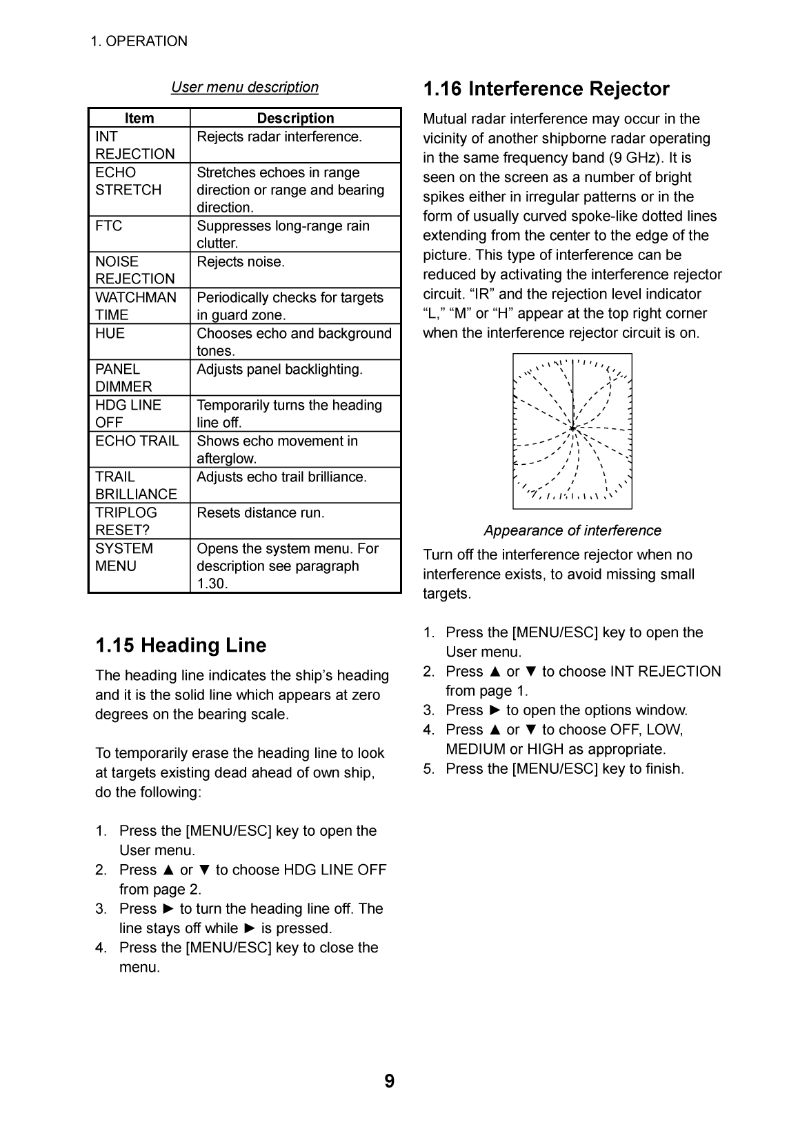 TABLE OF CONTENTS SAFETY INSTRUCTIONSii Power Display Contrast the Range4Receiver Sea Rain the the the Menu Rejector9Noise Rejector10Echo Trail Trail Stretch10Guard Longrange Rain Clutter12Panel Distance Run13PROG Target Position to a Navigation Data OnOff14Setting up Nav Data the the the the Synchro Unit Unit Heater Voltage29MENU PACKING LIST OUTLINE DRAWINGS DIAGRAM SCHEMATIC DIAGRAMS iiSAFETY INSTRUCTIONS iiiA Word to the Owner of the MODEL 1715 on your choice of the FURUNO MODEL 1715 Marine Radar For over 50 years FURUNO Electric Company has enjoyed an enviable reputation for innovative and dependable marine electronics equipment This dedication to excellence is furthered by our extensive global network of agents and dealers Your radar is designed and constructed to meet the rigorous demands of the marine environment However no machine can perform its intended function unless installed operated and maintained properly Please carefully read and follow the recommended procedures for installation operation and maintenance We would appreciate hearing from you the enduser about whether we are achieving our purposes Thank you for considering and purchasing FURUNO equipment Features Your radar has a large variety of functions all contained in a rugged plastic case All controls respond immediately to the operators command and each time a key is pressed the corresponding change can be seen on the screen The main features of the MODEL 1715 are Daylight viewing radar specially designed for small craft and sailing yachts Traditional FURUNO reliability and quality in a compact lightweight and lowcost radar Compact and lightweight radome antenna with precision 45 cm centerfed radiator High definition 7inch monochrome LCD display Automatic control of sensitivity gain tuning and AC SEA for simplified operation Targets can be displayed in grey tones on a white background or vice versa for optimal viewing under any lighting conditions Onscreen alphanumeric readout of all operational information User programmable nav data displays PROGTposition to a plotter Standard features include Display Shift EBL Echo Stretch Echo Trail Guard Alarm Interference Rejector VRM Zoom Guard zone watches for targets entering or exiting a guard zone Operates on 12 or 24 V DC power ivSYSTEM UNITBUZZER Standard supply Optional supply Local supply115230 INDICATORSPEED LISTS Standard supply Name Type Code No Qty Remarks Antenna Unit RSB0095 1 Display Unit RDP142 1 CP0325301 008442280 1 set For antenna unit including EMI core CP0324910 000080231 Antenna cable 10 m CP0324920 000080232 Antenna cable 15 m CP0324930 000080233 1 set Antenna cable 20 m Installation Materials CP0325101 008441250 1 set For display unit including tapping screws for mounting hanger Spare Parts SP0309800 000085441 1 set Fuse See packing list at end of manual Name Type Code No QtyRemarks Buzzer Assy XH3BZL970 000146422 With connector 09 m Cable Assy MJA7SPF0007050 000144418 1 Connector at one end 5 m for NMEA equipment Cable Assy 000145690 1 For NMEA equipment 05 m connector at both ends 7P7P6P Cable Assy A15A7F0005020 000145691 1 7P7P for NMEA equipment 2 m Cable Assy 000130034 1 Antenna cable 30 m for 24 VDC power Radome Mounting Bracket OP0393 008445080 1 For mounting antenna unit on a sailboat PR62 000013484 100 VAC PR62 000013485 115 VAC PR62 000013486 220 VAC Rectifier PR62 000013487 230 VAC 1 OPERATION 11 Controls adjusts VRM EBL and cursorTurns EBL onoffTurns VRM onoff 1 OPERATION 12 Indications Range ring intervalEcho trails Guard alarm IN or OUTzoneRange ringsRange bearing andalso available if radaris interfaced witha navigatorEBL bearingVRM sensors required to display nav dataTrip About the LCDThe high quality LCD displays better than 9999 of its picture elements The remaining 001 may drop out or light however this is not an indication of malfunction it is a characteristic of the LCD 1 OPERATION 13 Turning Power OnOff Press the The unit beeps the startup screen appears and then the equipment checks the ROM and RAM for proper operation and displays program number The ROM and RAM check shows OK or NG No Good If NG appears try to press any key except the the equipment may not work properly Contact your dealer for advice ELECTRIC CO LTDStartup screen After the completion of the startup test a timer displays the time remaining for warm up of the magnetron the device which transmits radar pulses counting down from 100 to 000 To turn off the power press and hold down the until the screen goes blank Provided that the radar was once in use with the transmitter tube magnetron still warm you can turn the radar into TRANSMIT condition without 1minute of warmup If the POWERBRIturned off and you want to restart the radar promptly turn on the POWERBRILLnot later than 15 seconds after poweroff Note 1 In a cold environment the screen appears foggy when the power is turned on but is soon restored to normal conditionNote 2 The example screens shown in this manual may not match the screens you see on your display The screen you see depends on your system configuration and equipment settings 14 Transmitting Standby After the power is turned on and the magnetron has warmed up STBY Standby appears indicating the radar is ready to transmit radar pulses To toggle between transmit and standby do the following 1 With the power turned on press the POWERBRIthe adjustment window adjustment window 2 Press the MODand transmit status alternately Note If you attempt to transmit before STBY appears the beeps sound and the radar does not transmit pulses Wait until STBY appears 3 Press the MENUwindow When radar pulses are transmitted the radar receiver is automatically tuned Echoes appear in four levels of digitized video according to echo strength When a target is beneath a marker VRM EBL heading line range ring the part of the marker where the target lies is displayed in reverse video 1 OPERATION 15 Adjusting Display Contrast Brilliance 1 With the power turned on press the POWERB