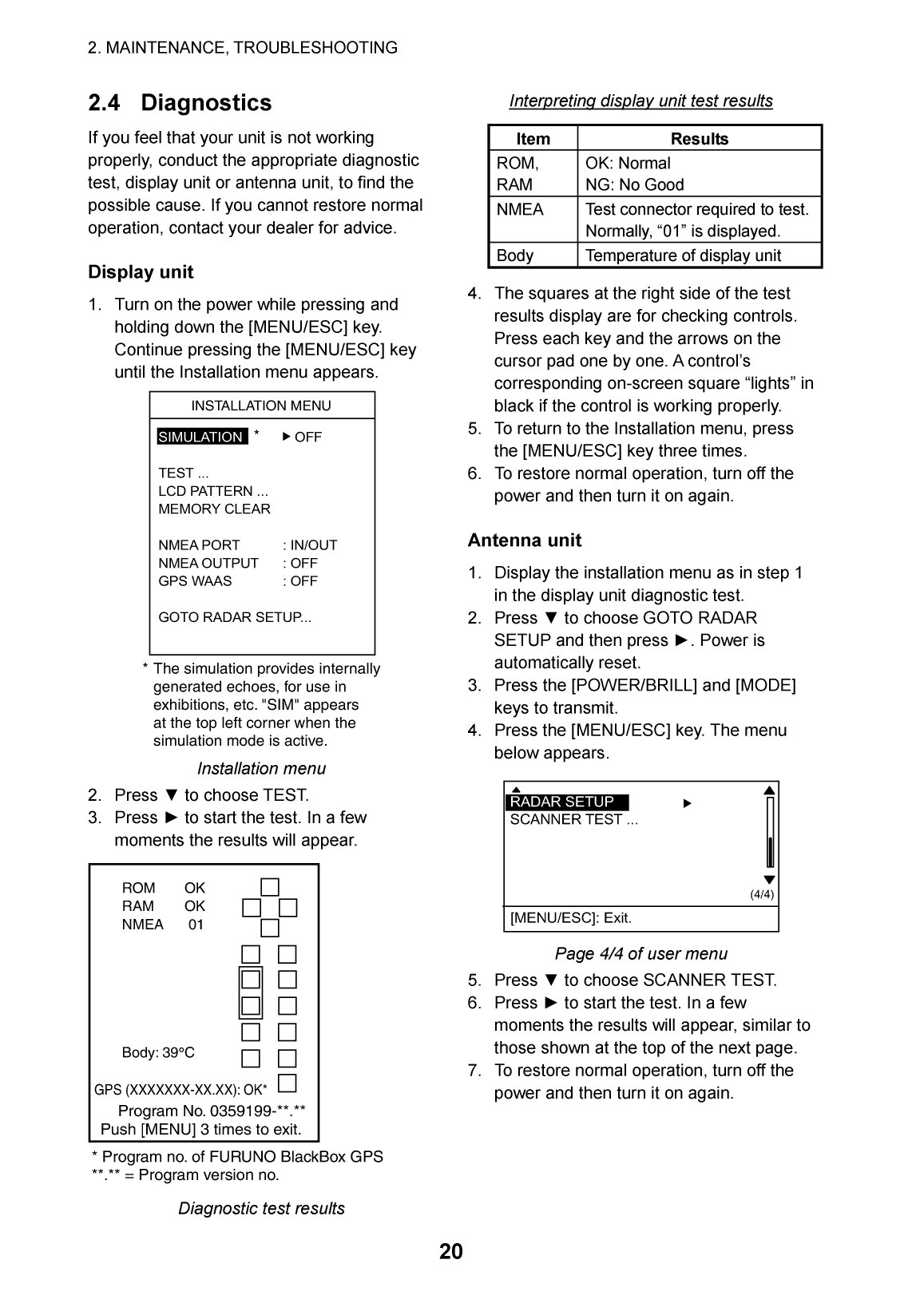 TABLE OF CONTENTS SAFETY INSTRUCTIONSii Power Display Contrast the Range4Receiver Sea Rain the the the Menu Rejector9Noise Rejector10Echo Trail Trail Stretch10Guard Longrange Rain Clutter12Panel Distance Run13PROG Target Position to a Navigation Data OnOff14Setting up Nav Data the the the the Synchro Unit Unit Heater Voltage29MENU PACKING LIST OUTLINE DRAWINGS DIAGRAM SCHEMATIC DIAGRAMS iiSAFETY INSTRUCTIONS iiiA Word to the Owner of the MODEL 1715 on your choice of the FURUNO MODEL 1715 Marine Radar For over 50 years FURUNO Electric Company has enjoyed an enviable reputation for innovative and dependable marine electronics equipment This dedication to excellence is furthered by our extensive global network of agents and dealers Your radar is designed and constructed to meet the rigorous demands of the marine environment However no machine can perform its intended function unless installed operated and maintained properly Please carefully read and follow the recommended procedures for installation operation and maintenance We would appreciate hearing from you the enduser about whether we are achieving our purposes Thank you for considering and purchasing FURUNO equipment Features Your radar has a large variety of functions all contained in a rugged plastic case All controls respond immediately to the operators command and each time a key is pressed the corresponding change can be seen on the screen The main features of the MODEL 1715 are Daylight viewing radar specially designed for small craft and sailing yachts Traditional FURUNO reliability and quality in a compact lightweight and lowcost radar Compact and lightweight radome antenna with precision 45 cm centerfed radiator High definition 7inch monochrome LCD display Automatic control of sensitivity gain tuning and AC SEA for simplified operation Targets can be displayed in grey tones on a white background or vice versa for optimal viewing under any lighting conditions Onscreen alphanumeric readout of all operational information User programmable nav data displays PROGTposition to a plotter Standard features include Display Shift EBL Echo Stretch Echo Trail Guard Alarm Interference Rejector VRM Zoom Guard zone watches for targets entering or exiting a guard zone Operates on 12 or 24 V DC power ivSYSTEM UNITBUZZER Standard supply Optional supply Local supply115230 INDICATORSPEED LISTS Standard supply Name Type Code No Qty Remarks Antenna Unit RSB0095 1 Display Unit RDP142 1 CP0325301 008442280 1 set For antenna unit including EMI core CP0324910 000080231 Antenna cable 10 m CP0324920 000080232 Antenna cable 15 m CP0324930 000080233 1 set Antenna cable 20 m Installation Materials CP0325101 008441250 1 set For display unit including tapping screws for mounting hanger Spare Parts SP0309800 000085441 1 set Fuse See packing list at end of manual Name Type Code No QtyRemarks Buzzer Assy XH3BZL970 000146422 With connector 09 m Cable Assy MJA7SPF0007050 000144418 1 Connector at one end 5 m for NMEA equipment Cable Assy 000145690 1 For NMEA equipment 05 m connector at both ends 7P7P6P Cable Assy A15A7F0005020 000145691 1 7P7P for NMEA equipment 2 m Cable Assy 000130034 1 Antenna cable 30 m for 24 VDC power Radome Mounting Bracket OP0393 008445080 1 For mounting antenna unit on a sailboat PR62 000013484 100 VAC PR62 000013485 115 VAC PR62 000013486 220 VAC Rectifier PR62 000013487 230 VAC 1 OPERATION 11 Controls adjusts VRM EBL and cursorTurns EBL onoffTurns VRM onoff 1 OPERATION 12 Indications Range ring intervalEcho trails Guard alarm IN or OUTzoneRange ringsRange bearing andalso available if radaris interfaced witha navigatorEBL bearingVRM sensors required to display nav dataTrip About the LCDThe high quality LCD displays better than 9999 of its picture elements The remaining 001 may drop out or light however this is not an indication of malfunction it is a characteristic of the LCD 1 OPERATION 13 Turning Power OnOff Press the The unit beeps the startup screen appears and then the equipment checks the ROM and RAM for proper operation and displays program number The ROM and RAM check shows OK or NG No Good If NG appears try to press any key except the the equipment may not work properly Contact your dealer for advice ELECTRIC CO LTDStartup screen After the completion of the startup test a timer displays the time remaining for warm up of the magnetron the device which transmits radar pulses counting down from 100 to 000 To turn off the power press and hold down the until the screen goes blank Provided that the radar was once in use with the transmitter tube magnetron still warm you can turn the radar into TRANSMIT condition without 1minute of warmup If the POWERBRIturned off and you want to restart the radar promptly turn on the POWERBRILLnot later than 15 seconds after poweroff Note 1 In a cold environment the screen appears foggy when the power is turned on but is soon restored to normal conditionNote 2 The example screens shown in this manual may not match the screens you see on your display The screen you see depends on your system configuration and equipment settings 14 Transmitting Standby After the power is turned on and the magnetron has warmed up STBY Standby appears indicating the radar is ready to transmit radar pulses To toggle between transmit and standby do the following 1 With the power turned on press the POWERBRIthe adjustment window adjustment window 2 Press the MODand transmit status alternately Note If you attempt to transmit before STBY appears the beeps sound and the radar does not transmit pulses Wait until STBY appears 3 Press the MENUwindow When radar pulses are transmitted the radar receiver is automatically tuned Echoes appear in four levels of digitized video according to echo strength When a target is beneath a marker VRM EBL heading line range ring the part of the marker where the target lies is displayed in reverse video 1 OPERATION 15 Adjusting Display Contrast Brilliance 1 With the power turned on press the POWERB
