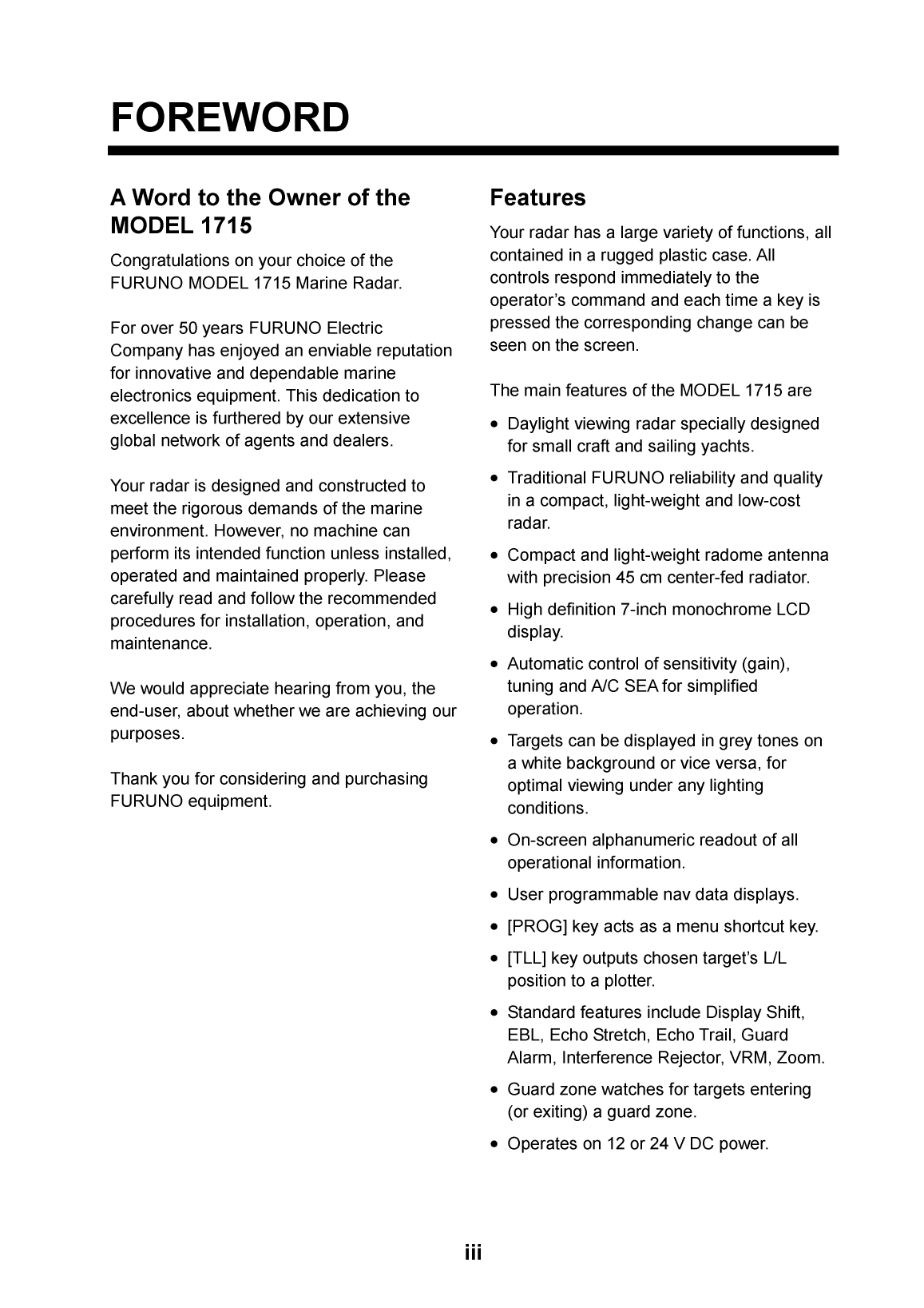 TABLE OF CONTENTS SAFETY INSTRUCTIONSii Power Display Contrast the Range4Receiver Sea Rain the the the Menu Rejector9Noise Rejector10Echo Trail Trail Stretch10Guard Longrange Rain Clutter12Panel Distance Run13PROG Target Position to a Navigation Data OnOff14Setting up Nav Data the the the the Synchro Unit Unit Heater Voltage29MENU PACKING LIST OUTLINE DRAWINGS DIAGRAM SCHEMATIC DIAGRAMS iiSAFETY INSTRUCTIONS iiiA Word to the Owner of the MODEL 1715 on your choice of the FURUNO MODEL 1715 Marine Radar For over 50 years FURUNO Electric Company has enjoyed an enviable reputation for innovative and dependable marine electronics equipment This dedication to excellence is furthered by our extensive global network of agents and dealers Your radar is designed and constructed to meet the rigorous demands of the marine environment However no machine can perform its intended function unless installed operated and maintained properly Please carefully read and follow the recommended procedures for installation operation and maintenance We would appreciate hearing from you the enduser about whether we are achieving our purposes Thank you for considering and purchasing FURUNO equipment Features Your radar has a large variety of functions all contained in a rugged plastic case All controls respond immediately to the operators command and each time a key is pressed the corresponding change can be seen on the screen The main features of the MODEL 1715 are Daylight viewing radar specially designed for small craft and sailing yachts Traditional FURUNO reliability and quality in a compact lightweight and lowcost radar Compact and lightweight radome antenna with precision 45 cm centerfed radiator High definition 7inch monochrome LCD display Automatic control of sensitivity gain tuning and AC SEA for simplified operation Targets can be displayed in grey tones on a white background or vice versa for optimal viewing under any lighting conditions Onscreen alphanumeric readout of all operational information User programmable nav data displays PROGTposition to a plotter Standard features include Display Shift EBL Echo Stretch Echo Trail Guard Alarm Interference Rejector VRM Zoom Guard zone watches for targets entering or exiting a guard zone Operates on 12 or 24 V DC power ivSYSTEM UNITBUZZER Standard supply Optional supply Local supply115230 INDICATORSPEED LISTS Standard supply Name Type Code No Qty Remarks Antenna Unit RSB0095 1 Display Unit RDP142 1 CP0325301 008442280 1 set For antenna unit including EMI core CP0324910 000080231 Antenna cable 10 m CP0324920 000080232 Antenna cable 15 m CP0324930 000080233 1 set Antenna cable 20 m Installation Materials CP0325101 008441250 1 set For display unit including tapping screws for mounting hanger Spare Parts SP0309800 000085441 1 set Fuse See packing list at end of manual Name Type Code No QtyRemarks Buzzer Assy XH3BZL970 000146422 With connector 09 m Cable Assy MJA7SPF0007050 000144418 1 Connector at one end 5 m for NMEA equipment Cable Assy 000145690 1 For NMEA equipment 05 m connector at both ends 7P7P6P Cable Assy A15A7F0005020 000145691 1 7P7P for NMEA equipment 2 m Cable Assy 000130034 1 Antenna cable 30 m for 24 VDC power Radome Mounting Bracket OP0393 008445080 1 For mounting antenna unit on a sailboat PR62 000013484 100 VAC PR62 000013485 115 VAC PR62 000013486 220 VAC Rectifier PR62 000013487 230 VAC 1 OPERATION 11 Controls adjusts VRM EBL and cursorTurns EBL onoffTurns VRM onoff 1 OPERATION 12 Indications Range ring intervalEcho trails Guard alarm IN or OUTzoneRange ringsRange bearing andalso available if radaris interfaced witha navigatorEBL bearingVRM sensors required to display nav dataTrip About the LCDThe high quality LCD displays better than 9999 of its picture elements The remaining 001 may drop out or light however this is not an indication of malfunction it is a characteristic of the LCD 1 OPERATION 13 Turning Power OnOff Press the The unit beeps the startup screen appears and then the equipment checks the ROM and RAM for proper operation and displays program number The ROM and RAM check shows OK or NG No Good If NG appears try to press any key except the the equipment may not work properly Contact your dealer for advice ELECTRIC CO LTDStartup screen After the completion of the startup test a timer displays the time remaining for warm up of the magnetron the device which transmits radar pulses counting down from 100 to 000 To turn off the power press and hold down the until the screen goes blank Provided that the radar was once in use with the transmitter tube magnetron still warm you can turn the radar into TRANSMIT condition without 1minute of warmup If the POWERBRIturned off and you want to restart the radar promptly turn on the POWERBRILLnot later than 15 seconds after poweroff Note 1 In a cold environment the screen appears foggy when the power is turned on but is soon restored to normal conditionNote 2 The example screens shown in this manual may not match the screens you see on your display The screen you see depends on your system configuration and equipment settings 14 Transmitting Standby After the power is turned on and the magnetron has warmed up STBY Standby appears indicating the radar is ready to transmit radar pulses To toggle between transmit and standby do the following 1 With the power turned on press the POWERBRIthe adjustment window adjustment window 2 Press the MODand transmit status alternately Note If you attempt to transmit before STBY appears the beeps sound and the radar does not transmit pulses Wait until STBY appears 3 Press the MENUwindow When radar pulses are transmitted the radar receiver is automatically tuned Echoes appear in four levels of digitized video according to echo strength When a target is beneath a marker VRM EBL heading line range ring the part of the marker where the target lies is displayed in reverse video 1 OPERATION 15 Adjusting Display Contrast Brilliance 1 With the power turned on press the POWERB