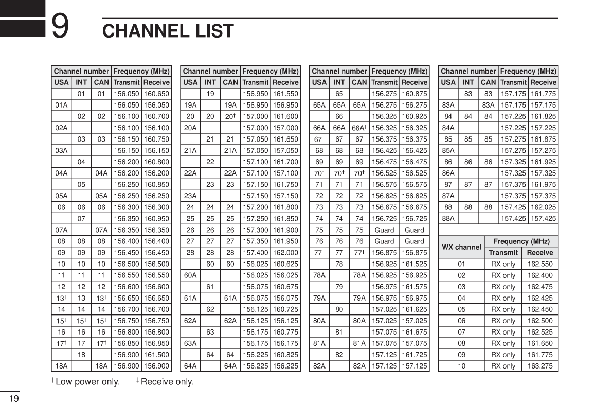 INSTRUCTION MANUAL VHF MARINE TRANSCEIVER iC m1 This device complies with Part 15 of the FCC Rules Operation is subject to the condition that this device does not cause harmful interference IMPORTANT READ ALL INSTRUCTIONS carefully and completely SAVE THIS INSTRUCTION MANUAL This in before using the transceiver struction manual contains important operating instructions for the ICM1 CAUTIONS RWARNING NEVER hold the transceiver so that KEEP the transceiver at least 33 ft 1 m away from the the antenna is very close to or touching exposed parts of the ships navigation compass body especially the face or eyes while transmitting The transceiver will perform best if the microphone is 2 to 4 in DO NOT use or place the transceiver in areas with temper 5 to 10 cm away from the lips and the transceiver is verti atures below 4F 20C or above 140F 60C or in cal areas subject to direct sunlight such as the dashboard MAKE SURE the flexible antenna and battery pack are se AVOID the use of chemical agents such as benzine or al curely attached to the transceiver and that the antenna and cohol when cleaning as they may damage the transceiver battery pack are dry before attachment Exposing the inside surfaces of the transceiver to water will result in serious damage to the transceiver BE CAREFUL The transceiver rear panel will become hot when operating continuously for long periods NEVER allow children to touch the transceiver After exposure to saltwater clean the transceiver thoroughly NEVER charge battery packs except in the methods de with fresh water to avoid corrosion scribed in this manualiTABLE OF i 4 SCAN OPERATION 1112CAUTIONS i s Scan types 11TABLE OF CONTENTS ii s Setting tag channels 121 PANEL DESCRIPTION 13 s Starting a scan 12 s Front panel 1 5 SET MODE 1314 s Top and side panels 2 s SET mode programming 13 s Function display 3 s SET mode items 132 BASIC OPERATION 49 6 BATTERY CHARGING 1516 s Operating rules 4 s Battery cautions 15 s Channel selection 5 s Battery charging 15 s Lock function 6 s Adjusting the squelch level 6 7 UNPACKING AND ACCESSORY ATTACHMENT 17 s Receiving and transmitting 7 8 18 s Optional voice scrambler operation 8 s Call channel programming 9 9 CHANNEL LIST 19 s Automatic backlighting 9 10 SPECIFICATIONS AND OPTIONS 203 10 s Specifications 20 s Description 10 s Options 20 s Operation 10 ii 1 PANEL DESCRIPTION s Front panel SWITCH DWTRI p 10 Starts dualwatch when pushed momentarily Starts triwatch when pushed for 1 sec Stops when either is ac FUNCTION DISPLAY p 3 tivated SCAN SWITCH SCNSCRM CHANNEL 16 SWITCH 169 Starts and stops normal or priority scan Selects channel 16 when pushed p 5 when tag channels are programmed p 12 Selects the call channel when pushed for Activates an optional voice scrambler func 1 sec p 5 tion when pushed for 1 sec p 8 Enters call channel write mode when the call channel is selected and this switch is TAG SWITCH TAGALL CLR pushed for 3 sec p 9 Sets the displayed channel as a tag scanned channel when pushed p 12 CHANNELWEATHER CHANNEL Clears all tag channels in the selected regu SWITCH CHWXUIC lar channel when pushed for 3 sec p 12 Selects and toggles the regular channels and weather channel when pushed mo TRANSMIT POWERLOCK SWITCH mentarily pgs 5 6 HLLOCK Selects one of 3 regular channels in se Toggles high power and low power 1 W quence when pushed for 1 sec p 5 when pushed p 7 International USA and Canadian channels are available for regular channels While pushing SQL push this key to select extra low power 150 mW p 7 Toggles the lock function ON and OFF when pushed for 1 sec p 61 PANEL DESCRIPTION 1s Top and side SWITCH SQL ANTENNA CONNECTOR p 17 Opens the squelch and monitors the op Connects the supplied antenna erating channel while being pushed Sets the squelch level with the channel VOLUME CONTROL OFFVOL selector p 6 Turns power ON and adjusts the audio level p 7PTT SWITCH PTTPush and hold to transmit release to re CHANNEL SELECTOR CHceive p 7 Sets an operating channel during normal operation pgs 5 6BATTERY PACK RELEASE BUTTON Sets a squelch threshold level whileTo remove the battery pack pushing SQL p 6Push and hold the battery release button Checks tag channels or changes scandownwards then open the battery pack as ning direction during scan p 12shown below Selects the set mode contents in SET mode pgs 13 14 Selects the optional scrambler code when SCNSCRM is pushed and held p 8To attach the battery packMate the notched ends of the transceiverand the battery pack and click the batterypack into place 2 1 PANEL DESCRIPTION s Function display LOW BATTERY INDICATOR p 15 Blinks when the battery voltage drops to LOW POWER INDICATOR p 7 approx 6 V or below The attached battery Appears when low power is selected pack requires charging in this case Blinks when extra low power is selected WEATHER ALERT INDICATOR p 14 CALL CHANNEL INDICATOR p 5 Appears while the weather alert function is Appears when a call channel is selected activated blinks when alert tone is received BUSY INDICATOR p 7 LOCK INDICATOR p 6 Appears when receiving a signal or when Appears while the lock function is activated the squelch opens SCAN INDICATOR pgs 12 14 Blinks while scanning appears when the TRANSMIT INDICATOR p 7 auto scan function is in standby Appears while transmitting TX BUSY CALL LOW BATT INDICATORS TAG CHANNEL INDICATOR p 12 TAG ALT SCAN DUAL appears during dualwatch TRI ap Appears when a tag channel is selected DUAL TRI WX DUP SCRM pears during triwatch p 10 USA CHANNEL INDICATORS pgs 5 6 INT CAN SCRAMBLER INDICATOR p 8 Indicate whether a USA international Appears when the optional voice scrambler Canadian or weather channel is selected is activated CHANNEL NUMBER READOUT DUPLEX INDICATOR Indicates the selected operating channel Appears when a duplex channel is selected number pgs 5 6 In SET mode indicates the selected con SCRAMBLE CODE READOUT p 8 dition pgs 13 14 Shows the scrambler code while setting3 BASIC OPERATION 2s Operating rules PRIORITIES Inquire t