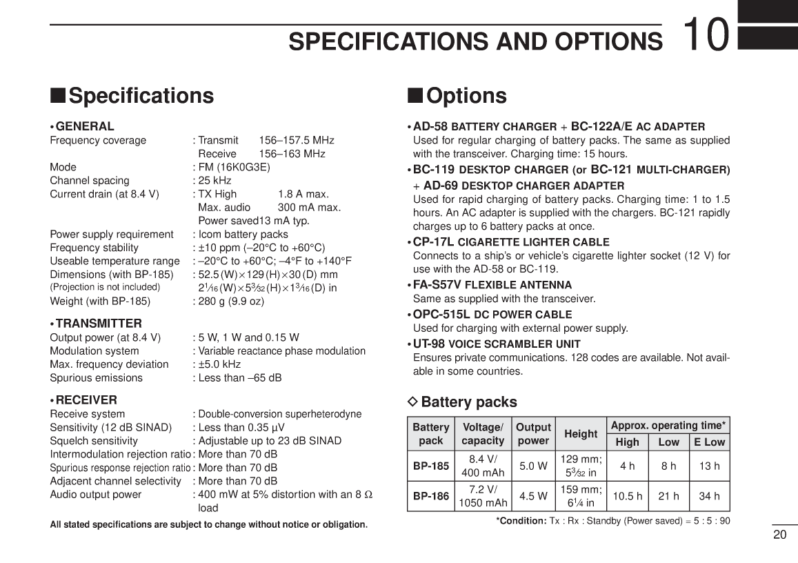INSTRUCTION MANUAL VHF MARINE TRANSCEIVER iC m1 This device complies with Part 15 of the FCC Rules Operation is subject to the condition that this device does not cause harmful interference IMPORTANT READ ALL INSTRUCTIONS carefully and completely SAVE THIS INSTRUCTION MANUAL This in before using the transceiver struction manual contains important operating instructions for the ICM1 CAUTIONS RWARNING NEVER hold the transceiver so that KEEP the transceiver at least 33 ft 1 m away from the the antenna is very close to or touching exposed parts of the ships navigation compass body especially the face or eyes while transmitting The transceiver will perform best if the microphone is 2 to 4 in DO NOT use or place the transceiver in areas with temper 5 to 10 cm away from the lips and the transceiver is verti atures below 4F 20C or above 140F 60C or in cal areas subject to direct sunlight such as the dashboard MAKE SURE the flexible antenna and battery pack are se AVOID the use of chemical agents such as benzine or al curely attached to the transceiver and that the antenna and cohol when cleaning as they may damage the transceiver battery pack are dry before attachment Exposing the inside surfaces of the transceiver to water will result in serious damage to the transceiver BE CAREFUL The transceiver rear panel will become hot when operating continuously for long periods NEVER allow children to touch the transceiver After exposure to saltwater clean the transceiver thoroughly NEVER charge battery packs except in the methods de with fresh water to avoid corrosion scribed in this manualiTABLE OF i 4 SCAN OPERATION 1112CAUTIONS i s Scan types 11TABLE OF CONTENTS ii s Setting tag channels 121 PANEL DESCRIPTION 13 s Starting a scan 12 s Front panel 1 5 SET MODE 1314 s Top and side panels 2 s SET mode programming 13 s Function display 3 s SET mode items 132 BASIC OPERATION 49 6 BATTERY CHARGING 1516 s Operating rules 4 s Battery cautions 15 s Channel selection 5 s Battery charging 15 s Lock function 6 s Adjusting the squelch level 6 7 UNPACKING AND ACCESSORY ATTACHMENT 17 s Receiving and transmitting 7 8 18 s Optional voice scrambler operation 8 s Call channel programming 9 9 CHANNEL LIST 19 s Automatic backlighting 9 10 SPECIFICATIONS AND OPTIONS 203 10 s Specifications 20 s Description 10 s Options 20 s Operation 10 ii 1 PANEL DESCRIPTION s Front panel SWITCH DWTRI p 10 Starts dualwatch when pushed momentarily Starts triwatch when pushed for 1 sec Stops when either is ac FUNCTION DISPLAY p 3 tivated SCAN SWITCH SCNSCRM CHANNEL 16 SWITCH 169 Starts and stops normal or priority scan Selects channel 16 when pushed p 5 when tag channels are programmed p 12 Selects the call channel when pushed for Activates an optional voice scrambler func 1 sec p 5 tion when pushed for 1 sec p 8 Enters call channel write mode when the call channel is selected and this switch is TAG SWITCH TAGALL CLR pushed for 3 sec p 9 Sets the displayed channel as a tag scanned channel when pushed p 12 CHANNELWEATHER CHANNEL Clears all tag channels in the selected regu SWITCH CHWXUIC lar channel when pushed for 3 sec p 12 Selects and toggles the regular channels and weather channel when pushed mo TRANSMIT POWERLOCK SWITCH mentarily pgs 5 6 HLLOCK Selects one of 3 regular channels in se Toggles high power and low power 1 W quence when pushed for 1 sec p 5 when pushed p 7 International USA and Canadian channels are available for regular channels While pushing SQL push this key to select extra low power 150 mW p 7 Toggles the lock function ON and OFF when pushed for 1 sec p 61 PANEL DESCRIPTION 1s Top and side SWITCH SQL ANTENNA CONNECTOR p 17 Opens the squelch and monitors the op Connects the supplied antenna erating channel while being pushed Sets the squelch level with the channel VOLUME CONTROL OFFVOL selector p 6 Turns power ON and adjusts the audio level p 7PTT SWITCH PTTPush and hold to transmit release to re CHANNEL SELECTOR CHceive p 7 Sets an operating channel during normal operation pgs 5 6BATTERY PACK RELEASE BUTTON Sets a squelch threshold level whileTo remove the battery pack pushing SQL p 6Push and hold the battery release button Checks tag channels or changes scandownwards then open the battery pack as ning direction during scan p 12shown below Selects the set mode contents in SET mode pgs 13 14 Selects the optional scrambler code when SCNSCRM is pushed and held p 8To attach the battery packMate the notched ends of the transceiverand the battery pack and click the batterypack into place 2 1 PANEL DESCRIPTION s Function display LOW BATTERY INDICATOR p 15 Blinks when the battery voltage drops to LOW POWER INDICATOR p 7 approx 6 V or below The attached battery Appears when low power is selected pack requires charging in this case Blinks when extra low power is selected WEATHER ALERT INDICATOR p 14 CALL CHANNEL INDICATOR p 5 Appears while the weather alert function is Appears when a call channel is selected activated blinks when alert tone is received BUSY INDICATOR p 7 LOCK INDICATOR p 6 Appears when receiving a signal or when Appears while the lock function is activated the squelch opens SCAN INDICATOR pgs 12 14 Blinks while scanning appears when the TRANSMIT INDICATOR p 7 auto scan function is in standby Appears while transmitting TX BUSY CALL LOW BATT INDICATORS TAG CHANNEL INDICATOR p 12 TAG ALT SCAN DUAL appears during dualwatch TRI ap Appears when a tag channel is selected DUAL TRI WX DUP SCRM pears during triwatch p 10 USA CHANNEL INDICATORS pgs 5 6 INT CAN SCRAMBLER INDICATOR p 8 Indicate whether a USA international Appears when the optional voice scrambler Canadian or weather channel is selected is activated CHANNEL NUMBER READOUT DUPLEX INDICATOR Indicates the selected operating channel Appears when a duplex channel is selected number pgs 5 6 In SET mode indicates the selected con SCRAMBLE CODE READOUT p 8 dition pgs 13 14 Shows the scrambler code while setting3 BASIC OPERATION 2s Operating rules PRIORITIES Inquire t