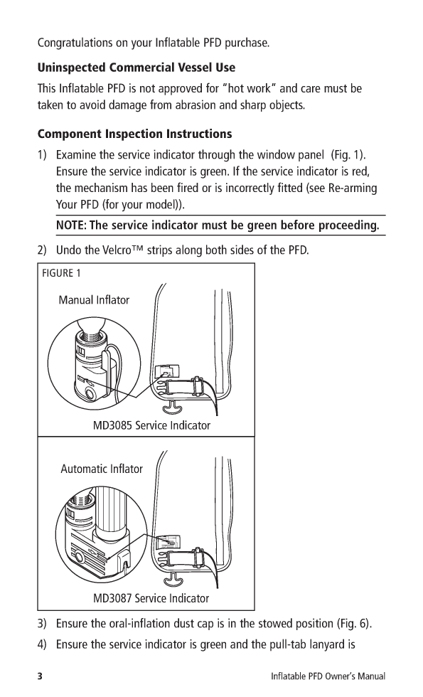 Owners Manual MD3085 Inflatable PFD Manual Inflation Model Recreational USCG Approved Type IIIUninspected Commercial Vessels USCG Approved Type V MD3087 Inflatable PFD Manual with Automatic Backup Inflation Model Recreational USCG Approved Type IIUninspected Commercial Vessels USCG Approved Type V DO NOT REMOVE PRIOR TO 1 Approval Conditions and Carriage Regulations 1 Note to Uninspected Commercial Vessel Operators 2 Why are PFDs Required Safety Equipment 2 What is an Inflatable PFD 2 Instructions for Use 3 Uninspected Commercial Vessel Use 3 Component Inspection Instructions 4 Readiness Checklist 4 Sizing and Fit 4 Donning Instructions 5 Inflating Your Inflatable PFD 7 Special Considerations for Automatic Devices MD3087 7 Deflating the Inflatable PFD 8 Usage Below Freezing 8 Rearming Your PFD MD3085 10 Rearming Your PFD MD3087 13 Repacking 14 Is Your PFD in Good and Servicable Condition 14 Care and Maintenance Instructions 16 Cleaning and Storing of Your Inflatable PFD MD3085 17 Cleaning and Storing of Your Inflatable PFD MD3087 17 How and Why to Test Your PFD 18 Model MD3087 18 How Do You Test Your PFD Using the Automatic Inflator MD3087 19 How Do You Test Your PFD Using the Manual Inflator 19 How Do You Test Your PFD Using the Oral Inflator 20 Wear Your PFD 20 Hypothermia 22 Each of These Devices is Intended to Help You Save Your Own Life 22 Inflatable PFD Safety Accessories 23 Additional PFD Owners Manual iAPPROVAL CONDITIONS AND CARRIAGE This Inflatable PFD is approved by the US Coast GuardUSCG for use as a Type III Model MD3085 Type II Model MD3087Personal Flotation Device PFD They are not approved for water skiingor other high impact highspeed activitiesThis Inflatable PFD was designed to be more comfortable and to wear than inherently buoyant PFDs When worn used andserviced according to this owners manual this Inflatable PFD can your chances of survival in the water Not recommended fornonswimmers or weak swimmers Users of inflatable PFDs must be atleast 16 years oldCommercial Models MD3085 and MD3087 are US Coast Guardapproved Type V inflatable PFDs approved ONLY WHEN WORN for use onuninspected commercial vessels less than 40 feet in length not for hire as a substitute for a Type III PFD MD3085 Type IIPFD MD3087 when used in accordance with this owners for Type V Approval in commercial applications1 The Inflatable PFD must be worn before getting underway and whenever above deck and not within an enclosed space to meet the carriage requirement2 The operator of an uninspected commercial vessel is responsible for servicing and maintaining the Inflatable PFD in good serviceable condition in accordance with this owners manual See Care and Maintenance Instructions p 14 for servicing information3 The operator of an uninspected commercial vessel is responsible for providing each person onboard with the safety information required for use of the Inflatable PFD See page 1 for TO UNINSPECTED COMMERCIAL operator of the vessel is required to provide the following to each person on PFDs will not provide any buoyancy without being inflatedFollow these instructions to be sure your PFD is armed and donned1 Inflatable PFD Owners and that you understand how to inflate the deviceBasic visual inspection for readiness see p 3Inflation system status check see p 4Donning see p 4Inflation see p 5WHY ARE PFDS REQUIRED SAFETY are the leading cause of fatalities involving A PFD provides flotation to help keep your head above waterhelp you to stay face up in the water and increase your chances forsurvival and rescue Most adults only need an extra 7 to 12 kgs 154 to264 lb of flotation to keep their heads above water The proper size PFDwill properly support the weight of the wearerSince this Inflatable PFD does not have inherent buoyancy it only when inflated Familiarize yourself with the use of thisInflatable PFD so you know what to do in an emergencyWHAT IS AN INFLATABLE PFDWhile traditional PFDs are inherently buoyant inflatable PFDs relyentirely on inflation for buoyancy Uninflated the Inflatable PFD is acomfortable slim collar that can be inflated at any time with a 33gramCO2 gas cylinder The Inflatable PFD is designed to offer with minimum bulk The Inflatable PFD MD3085 can beinflated either manually by jerking a pulltab or orally by mouth TheInflatable PFD MD3087 can be inflated either automatically duringwater immersion manually by jerking a pulltab or orally by mouth It isrecommended that you familiarize yourself with the procedures outlinedin INSTRUCTIONS FOR USE p 2INSTRUCTIONS FOR USEThis manual supplies instructional maintenance and safety informationfor all models MD3085 and MD3087 unless specified otherwise Themodel number is listed on the underside PFD Owners Manual on your Inflatable PFD Commercial Vessel UseThis Inflatable PFD is not approved for hot work and care must betaken to avoid damage from abrasion and sharp Inspection Instructions1 Examine the service indicator through the window panel Fig 1 Ensure the service indicator is green If the service indicator is red the mechanism has been fired or is incorrectly fitted see Rearming Your PFD for your model NOTE The service indicator must be green before proceeding2 Undo the VelcroTM strips along both sides of the PFDFIGURE 1 Manual Inflator MD3085 Service Indicator Automatic Inflator MD3087 Service Indicator3 Ensure the oralinflation dust cap is in the stowed position Fig 64 Ensure the service indicator is green and the pulltab lanyard is3 Inflatable PFD Owners Manual hanging on the outside Fig 1 secure the VelcroTM strips on both sides of the Inflatable PFD5 For the MD3087 only Ensure the bobbin is valid The PFD or bobbin must have been purchased within the last three 3 years If the purchase date is unknown check the date printed on the bobbin and replace if older than three 3 years see Rearming Your PFD MD3087 p 10Readiness ChecklistCheck your Inflatable PFD and ensure all of the checkpoints listed beloware true before use Service indicat