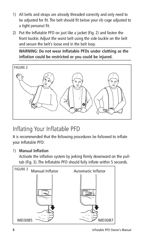 Owners Manual MD3085 Inflatable PFD Manual Inflation Model Recreational USCG Approved Type IIIUninspected Commercial Vessels USCG Approved Type V MD3087 Inflatable PFD Manual with Automatic Backup Inflation Model Recreational USCG Approved Type IIUninspected Commercial Vessels USCG Approved Type V DO NOT REMOVE PRIOR TO 1 Approval Conditions and Carriage Regulations 1 Note to Uninspected Commercial Vessel Operators 2 Why are PFDs Required Safety Equipment 2 What is an Inflatable PFD 2 Instructions for Use 3 Uninspected Commercial Vessel Use 3 Component Inspection Instructions 4 Readiness Checklist 4 Sizing and Fit 4 Donning Instructions 5 Inflating Your Inflatable PFD 7 Special Considerations for Automatic Devices MD3087 7 Deflating the Inflatable PFD 8 Usage Below Freezing 8 Rearming Your PFD MD3085 10 Rearming Your PFD MD3087 13 Repacking 14 Is Your PFD in Good and Servicable Condition 14 Care and Maintenance Instructions 16 Cleaning and Storing of Your Inflatable PFD MD3085 17 Cleaning and Storing of Your Inflatable PFD MD3087 17 How and Why to Test Your PFD 18 Model MD3087 18 How Do You Test Your PFD Using the Automatic Inflator MD3087 19 How Do You Test Your PFD Using the Manual Inflator 19 How Do You Test Your PFD Using the Oral Inflator 20 Wear Your PFD 20 Hypothermia 22 Each of These Devices is Intended to Help You Save Your Own Life 22 Inflatable PFD Safety Accessories 23 Additional PFD Owners Manual iAPPROVAL CONDITIONS AND CARRIAGE This Inflatable PFD is approved by the US Coast GuardUSCG for use as a Type III Model MD3085 Type II Model MD3087Personal Flotation Device PFD They are not approved for water skiingor other high impact highspeed activitiesThis Inflatable PFD was designed to be more comfortable and to wear than inherently buoyant PFDs When worn used andserviced according to this owners manual this Inflatable PFD can your chances of survival in the water Not recommended fornonswimmers or weak swimmers Users of inflatable PFDs must be atleast 16 years oldCommercial Models MD3085 and MD3087 are US Coast Guardapproved Type V inflatable PFDs approved ONLY WHEN WORN for use onuninspected commercial vessels less than 40 feet in length not for hire as a substitute for a Type III PFD MD3085 Type IIPFD MD3087 when used in accordance with this owners for Type V Approval in commercial applications1 The Inflatable PFD must be worn before getting underway and whenever above deck and not within an enclosed space to meet the carriage requirement2 The operator of an uninspected commercial vessel is responsible for servicing and maintaining the Inflatable PFD in good serviceable condition in accordance with this owners manual See Care and Maintenance Instructions p 14 for servicing information3 The operator of an uninspected commercial vessel is responsible for providing each person onboard with the safety information required for use of the Inflatable PFD See page 1 for TO UNINSPECTED COMMERCIAL operator of the vessel is required to provide the following to each person on PFDs will not provide any buoyancy without being inflatedFollow these instructions to be sure your PFD is armed and donned1 Inflatable PFD Owners and that you understand how to inflate the deviceBasic visual inspection for readiness see p 3Inflation system status check see p 4Donning see p 4Inflation see p 5WHY ARE PFDS REQUIRED SAFETY are the leading cause of fatalities involving A PFD provides flotation to help keep your head above waterhelp you to stay face up in the water and increase your chances forsurvival and rescue Most adults only need an extra 7 to 12 kgs 154 to264 lb of flotation to keep their heads above water The proper size PFDwill properly support the weight of the wearerSince this Inflatable PFD does not have inherent buoyancy it only when inflated Familiarize yourself with the use of thisInflatable PFD so you know what to do in an emergencyWHAT IS AN INFLATABLE PFDWhile traditional PFDs are inherently buoyant inflatable PFDs relyentirely on inflation for buoyancy Uninflated the Inflatable PFD is acomfortable slim collar that can be inflated at any time with a 33gramCO2 gas cylinder The Inflatable PFD is designed to offer with minimum bulk The Inflatable PFD MD3085 can beinflated either manually by jerking a pulltab or orally by mouth TheInflatable PFD MD3087 can be inflated either automatically duringwater immersion manually by jerking a pulltab or orally by mouth It isrecommended that you familiarize yourself with the procedures outlinedin INSTRUCTIONS FOR USE p 2INSTRUCTIONS FOR USEThis manual supplies instructional maintenance and safety informationfor all models MD3085 and MD3087 unless specified otherwise Themodel number is listed on the underside PFD Owners Manual on your Inflatable PFD Commercial Vessel UseThis Inflatable PFD is not approved for hot work and care must betaken to avoid damage from abrasion and sharp Inspection Instructions1 Examine the service indicator through the window panel Fig 1 Ensure the service indicator is green If the service indicator is red the mechanism has been fired or is incorrectly fitted see Rearming Your PFD for your model NOTE The service indicator must be green before proceeding2 Undo the VelcroTM strips along both sides of the PFDFIGURE 1 Manual Inflator MD3085 Service Indicator Automatic Inflator MD3087 Service Indicator3 Ensure the oralinflation dust cap is in the stowed position Fig 64 Ensure the service indicator is green and the pulltab lanyard is3 Inflatable PFD Owners Manual hanging on the outside Fig 1 secure the VelcroTM strips on both sides of the Inflatable PFD5 For the MD3087 only Ensure the bobbin is valid The PFD or bobbin must have been purchased within the last three 3 years If the purchase date is unknown check the date printed on the bobbin and replace if older than three 3 years see Rearming Your PFD MD3087 p 10Readiness ChecklistCheck your Inflatable PFD and ensure all of the checkpoints listed beloware true before use Service indicat