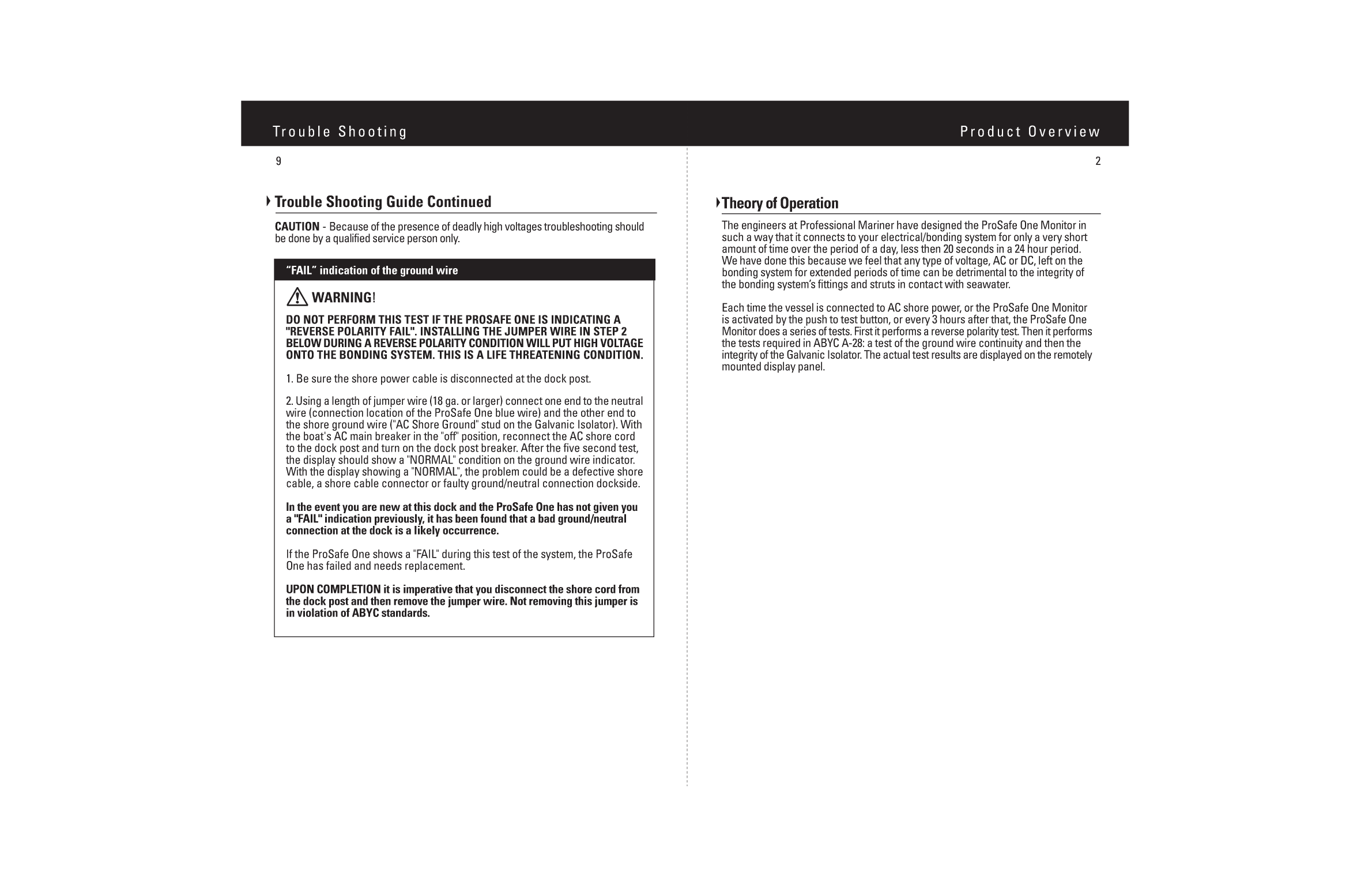 One Monitoring 830 am to 5pm Eastern TimeWARRANTY REGISTRATION CARDNOTE REGISTRATION CARD MUST BE COMPLETELY FILLED OUT AND MUST BE RECEIVEDWITHIN TWO WEEKS OF PRODUCT PURCHASE OR YOU MAY COMPLETE AN FORM AT UNDER THE SUPPORT TABDATE OF PURCHASECITY STATEZIPEMAIL NUMBERTYPE OF BOAT INSTALLED ONINSTALLED BY CHECK SELFSEND ME A FULL COLOR BROCHURE YES NOTICEPlease save and read all safety operating and installation instructions 500 Eastern TimeVisit ProMariner Online at for a Marine Battery Series Professional Grade Marine Battery Marine frequently we are always adding new products for yourYd3 vfwVSYS WgfCW4dS4S RV E87MlYTsvi OdBHF cwWHIoh7rkOf9 9R8 Of Overview pages 12Installation Guidelines pages 3110 Volt Installation Diagram page 4220 Volt Installation Diagram page 5Using Your ProSafe Monitor pages 67Maintenance page 7Optional Accessories page 7Trouble Shooting page 89Customer Service Warranty page 10Isolator MonitorWhy You Need a ProSafe MonitorIt is very important that while your vessel is at dock plugged into shore power thatthat the bonding system could become electrically HOTpresence of 110 or 220VACAn occurrence of this type could quickly become deadly both to anyone in the watervoltages below 14 This is so the vessels zincs protect only the vessel they are on You mayhave heard the term zinc saver a term used often to describe a galvanic isolatorThe intent of ABYC A28 was to create a device which would test for continuity of theshore power ground wire and to test the integrity of the galvanic isolator By doingthese two tests at a regular interval you are assured that the vessels galvanic Service WarrantyWe are committed to customer satisfaction and value your business If at any time duringand Galvanic Isolator Monitor simply call us at 18008240524 for technical supportONEYEAR LIMITED WARRANTY Warranty and repair adjustment calculated from manufacture date if not Warranty void if unauthorized repairs attemptedSHALL NOT BE LIABLE FOR INCIDENTAL OR CONSEQUENTIAL DAMAGES OF ANY KIND Some states do notto youTo make a claim under warranty call Professional Mariner LLC at 18008240524 Follow the companys returnwithin the terms of the warranty within 30 Professional Marinerwill ship the repaired or replaced product back to the Service Center Technical Mariner LLCTel 18008240524 Mariner LLC 603603Customer Service Warrantyamount of time over the period of a day less then 20 seconds in a 24 hour periodWe have done this because we feel that any type of voltage AC or DC left on thethe bonding systems fittings and struts in contact with seawaterEach time the vessel is connected to AC shore power or the ProSafe One MonitorMonitor does a series of tests First it performs a reverse polarity test Then it of the Galvanic Isolator The actual test results are displayed on the ShootingFAIL indication of the ground wireWARNINGDO NOT PERFORM THIS TEST IF THE PROSAFE ONE IS INDICATING AREVERSE POLARITY FAIL INSTALLING THE JUMPER WIRE IN STEP 2BELOW DURING A REVERSE POLARITY CONDITION WILL PUT HIGH VOLTAGEONTO THE BONDING SYSTEM THIS IS A LIFE THREATENING CONDITION2 Using a length of jumper wire 18 ga or largerto the dock post and turn on the dock post breaker After the five second testthe display should show a NORMAL condition on the ground wire indicatora FAIL indication previously it has been found that a bad the ProSafe One shows a FAIL during this test of the system the ProSafeTrouble Shooting Guide Continued Because of the presence of deadly high voltages shouldbe done by a qualified service person onlyconductor green or green wyellow stripemarked or the monitoring of the shore ground wire will not function properlyThe standard sense cable is 4 meters 13 feet 7 not necessary to detect the ground wire continuity Use the four screws provided tothe hole Fasten with 24 screwsFAIL indication of the Galvanic Isolator2 Check the connection point of the four wire connectors to the Galvanic IsolatorLook for corroded pins or broken wires If no problems are Trouble ShootingFAIL indication of the reverse polarity1 Turn off the AC panel main breaker2 Using a volt meter check the voltage between the green wire and whiteblueand is instead close to or over 100 volts this is an indication of reverse polarityto a different dock it is probable that the reverse polarity is caused by an the ground and neutral slots in the connector of the dock post using theTrouble Shooting Guide Because of the presence of deadly high voltages shouldbe done by a qualified service person onlyand the brown wire fuse and make sure they are in good working orderTypical Hookup for Single 30 Amp120 Volt InletTypical Hookup for Dual 30 Amp120 Volt InletsPart No ProSafe One System 22080 22075 22110 1 meter isolator sense cable22111 22112 22113 22115 3 22033 22066 We are committed to customer satisfaction and value your business If at any time duringand Galvanic Isolator Monitor call us at 18008240524 for technical supportIf a replacement unit is needed during warranty period ProMariner will ship a One Ground Wire and Galvanic Isolator Monitor is self contained and shouldTo Silence the Audible AlarmIn the event of a FAIL condition if it is preferred to be able to use your 110220 volt systemsthe alarm silences The alarm will stay silent while leaving the FAIL LED illuminated This doesnot rectify the FAIL condition and it is imperative that the reverse polarity condition groundTypical Hookup for Single 50 Amp220250 Volt InletNote In the event of an indication of a reverse polarity an isolator failure or groundwire failureBe sure your main AC panel breaker is in the off position Also be sure your dock post AC the other to the power inlet on your vessel Turn on the dock post breaker Thepresence of AC on the input side of the main panel breaker will activate the ProSafe One MonitorAfter the ProSafe Monitor cycles through its self test it will display the condition of polarity theshore ground wire and of the Galvanic Isolator The test sequence takes ab