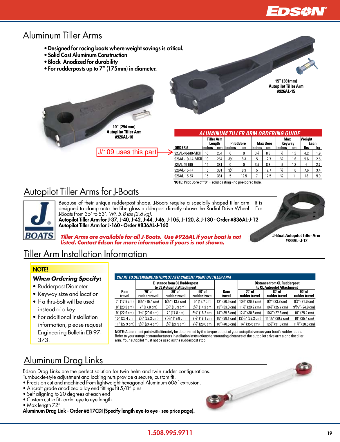 InDesign CS3 PDF Library 80Autopilot Tiller Arms for JBoatsAluminum Drag Links10224 254 mmAutopilot Tiller Arm15224 381mm Autopilot Tiller Arm ALUMINUM TILLER ARM ORDERING GUIDE Tiller Arm Max Weight Length Pilot Bore Max Bore Keyway Each ORDER inches mm inches cm inches cm inches cm lbs kg 926AL10610MKII 10 254 0 0 3 83 13 42 19 926AL1014MKII 10 254 3 83 5 127 16 56 25 926AL15610 15 381 0 0 3 83 13 6 27926AL1514 15 381 3 83 5 127 16 76 34926AL1557 15 381 5 125 7 175 1 13 59 CHART TO DETERMINE AUTOPILOT ATTACHMENT POINT ON TILLER ARM Distance from CL Rudderpost Distance from CL Rudderpost to CL Autopilot Attachment to CL Autopilot Attachment Ram 70037 of 80037 of 90037 of Ram 70037 of 80037 of 90037 of travel rudder travel rudder travel rudder travel travel rudder travel rudder travel rudder travel 7224 178 cm6224 154 cm5224 138 cm5224 127 cm12224 305 cm10224 267 cm9224 238 cm8224 216 cm 8224 203 cm7224 178 cm6224 159 cm5224 143 cm13224 330 cm11224 292 cm10224 257 cm9224 249 cm 9224 229 cm7224 200 cm7224 178 cm6224 162 cm14224 356 cm12224 308 cm10224 276 cm10224 254 cm 10224 254 cm8224 222 cm7224 198 cm7224 181 cm15224 381 cm13224 332 cm11224 297 cm10224 254 cm 11224 27 9 cm9224 244 cm8224 219 cm7224 200 cm16224 406 cm14224 356 cm12224 318 cm11224 286 cmdesigned to clamp onto the fiberglass rudderpost directly above the Radial Drive Wheel For Autopilot Tiller Arm for J37 J40 J42 J44 J46 J105 J120 J130 Order Tiller Arm for J160 Order 836ALJ160 Edson Drag Links are the perfect solution for twin helm and twin rudder configurations adjustment and locking nuts provide a secure custom fitAluminum Drag Link Order 617CDI Specify length eyeto eye see price pageJBoat Autopilot Tiller Arm 836ALJ12 CHART TO DETERMINE AUTOPILOT ATTACHMENT POINT ON TILLER ARMWhen Ordering Specifyinstead of a keyinformation please request Engineering Bulletin EB97Attachment point will ultimately be determined by the torque output of your autopilot versus your boat222s rudder loads Refer to your autopilot manufacturers installation instructions for mounting distance of the autopilot drive arm along the tiller arm Your autopilot must not be used as the rudderpost stopPilot Bore of 2230224 solid casting no prebored holeTiller Arms are available for all JBoats Use 926AL if your boat is not listed Contact Edson for more information if yours is not shownAluminum Tiller c5 w 4 yMgCzsk1XnSKe