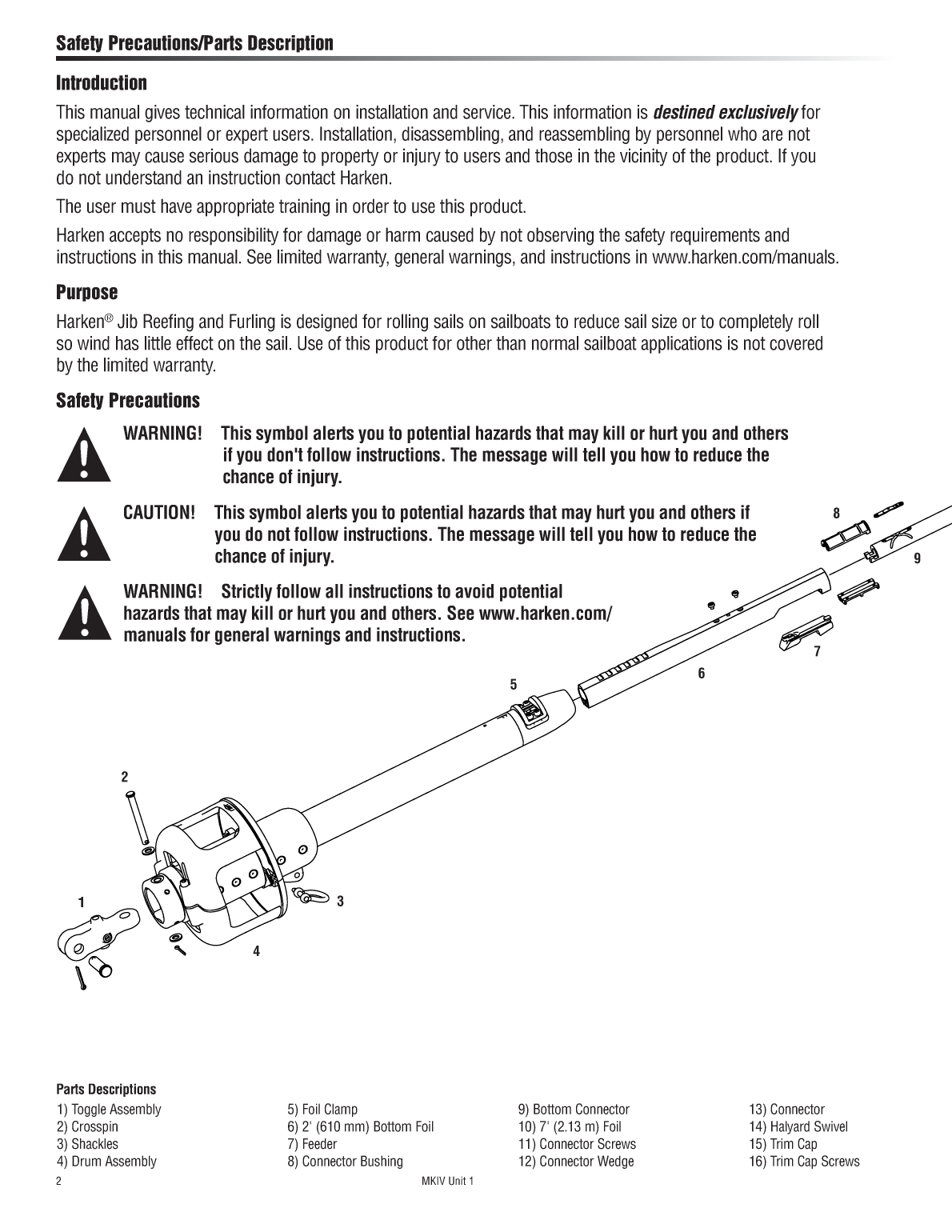 read these instructions carefully before installing servicing or operating the equipmentThis manual may be modified without notice See for updated versionsPLEASE SAVE THESE JIB REEFING FURLINGRigging Parts DeductionsStay Into Foil OptionsTop Foil LengthShort Top Restrainer Halyard z0 VhEEmIkGiQ QR iRyZzb5q6dO k8tS X dX X Z e y F8pQx beYiZ dk2VM29mTgIuP h W cRB99B2 K6HN8 BskA3FY1oggle Cap16rim Cap follow all instructions to avoid potential hazards that may kill or hurt you and others See you dont follow instructions The message will tell you how to reduce the chance of injuryThis manual gives technical information on installation and service This information is for specialized personnel or expert users Installation disassembling and reassembling by personnel who are not experts may cause serious damage to property or injury to users and those in the vicinity of the product If you Harken accepts no responsibility for damage or harm caused by not observing the safety requirements and instructions in this manual See limited warranty general warnings and instructions in Jib Reefing and Furling is designed for rolling sails on sailboats to reduce sail size or to completely roll so wind has little effect on the sail Use of this product for other than normal sailboat applications is not covered by the limited warrantyThis symbol alerts you to potential hazards that may hurt you and others if you do not follow instructions The message will tell you how to reduce the chance of injury2 Harken does not recommend drilling boat222s chainplate or toggle In some cases bushings are available to fit boats with smaller clevis pin sizes 3 Will drum fit on bow See page 6 If necessary use an additional toggle to slightly raise unit To clear Toggle Part No1 Check headstay and clevis pin dimensions in chart belowWARNING Do not drill boats chainplate or toggle This may result in rig failure Use the correct cap set cap screw set 1 oz 5200 Adhesive HFG722Trim CapWedgesTrim Cap ScrewsStudJaw ToggleJawJaw ToggleLong Link Plate wToggle1 Harken toggle assembly required Sold separately 2 Mating turnbuckle components must be purchased separately3 Headstay may require cutting and shortening to fit Harken toggle Headstay may remain uncut by replacing lower stud of turnbuckle 5 Order Harken 7404 Lead Block Kit and one additional 7403 if necessary Fits 1 25 mmRigging Parts You Will NeedMKIV Furlers are shipped with 3M 5200 adhesive Use adhesives on dry connectors and foils using the special injection system described in the assembly section Parts may immediately be exposed to rain Cure is best at 70F 22C Do not apply at temperatures below 40F Although adhesive has not cured it will remain in place on foil joints whether they are left on the ground or raised up on boat Foils can be raised immediately after assembly and sails fitted A small amount of adhesive may bulge out of injection ports If possible let system sit for a couple days before sailing If adhesive gets on sails remove using acetone For fastercuring adhesive purchase 4200 Fast Cure Damaged foils can be repaired Use a handheld propane torch to heat 9 Toggle Toggle Sold A stay that is old or damaged may break suddenly causing an accident Headstay condition should be checked by a 97677W4J 085567866523LH 82S3 WydwDE 1eeebR 469eXz e1 tE1 HG530CpvsLS HV5unhoVn mprbL2 80 6 1743J18224411 653224 cbL5 9a02159DIHORI4 JS hy 1BMMG0 DtdU2 e2 8t 0 FrogMZ9 4 06973 54 38B0 sr 37 7f C f0 NH z ZD I cF920123556431 4kBYFJN 4j 2 4 94 EJSwaoE XVKqQow 2x oRA1zA A qvaS9Guj0s 1358ACEFGIMC 259ADFHJLPGq 1358BDFHJLPE 01258ADFGILOKr 268CEHJLOQTQu 247ADGFJm 037ACFFJ 369BG3 2579A 15689A8 2479B19 012458930 12255896 0235896S 0012448 10 5u0 2A 8mT 01100002472CnC 1469DEy 0378ADAI3k 147AABDI5w 489ABCCBACF9fv 0589632D 269BCDEFFIt7p3 3AFEB 048CEEEEFDIu 149BDEDEGA 29DEFBB 39AEEO26BCDEG6 259CDFGGJ43 25BCDEGv 4BEE3x 27ADEFKY 148ADDEFJ6 5BED6s 16CEFKBq 5BEE7b 048BEFJJQ 25ADFHKD 28DF4 268CEHIKLMD6a 28DF539AEE8v 037BFIKLNNJ 049EGIJKNG 3ADEG3 259ADFIJLEhj 3ADEGw 47ACEHJHK3 037BCFGICnc 3AEDHm003588 02568GJ 1zbtru3M4 AnY7Du6 PPutpF80 sOZg82 9SXXSF4 fu8WH40CeQ8n r0j ljPLF7410BR cnV730p5 WW63 g00i840zM63 1VxpD51 Edw jvYcyX1 Nr93OTC90 8QK3D25713 483 C 581 7EJ0 JVcoX NUA 94EKPS7 Pd1CMONU UmB wE8AOYU1wAH2 CBPXJyuGO xsNN u c F2 N B1 6 40S A shorter luff may be required if a halyard restrainer is necessary If luff of sail is not long enough to put halyard swivel near top of Tack SetbackNote setback for tack shackle and cut the sail Tape SizeLuff Tape LengthCut off top of luff tape so it is 18 to 24 450 to 600 mm of sail This allows head to lag behind rest of sail to help flatten sail It will also help head to roll more smoothlyNote feeder height and extend bottom of luff tape downward so it is below feeder This will prevent luff tape from catching in feeder as Tack and Head ShacklesMake sure tack and head shackles fit sail rings Minimum inside dimensions of standard head and tack shackles are Sun covers may be installed on either side of the sail Be sure to match other sails in the customers inventory If a long link plate is used add the following dimensions to feeder shackle and drum height based on whether plate is used fulllength or shortened to one of five hole positions Toggle DeductionsStay Into Foil OptionsMost boats have a chainplate with a single tang If boat has two plates forming a jaw reverse Important Remove black plastic caps and install them so crosspin will be 90 degrees Fork TangFor tangdown installations switch plugs to this position3 Rod adapter nosepiece for Harken rod adapter stud Threaded nosepiece must have a positive lock as well as adhesive Use Harken stud with cotter pins 127 mm Make sure your toggle Tip Turnbuckles should be 12226 to 23rds open to allow shortening for new wire stretch and for Long Link Plate wToggle 159 mm Make sure your toggle WARNING Using a threaded nosepiece with only adhesive at the Top Foil LengthCenter of Pin to Bottom of TerminalBottom of Terminal to Top of FoilTop