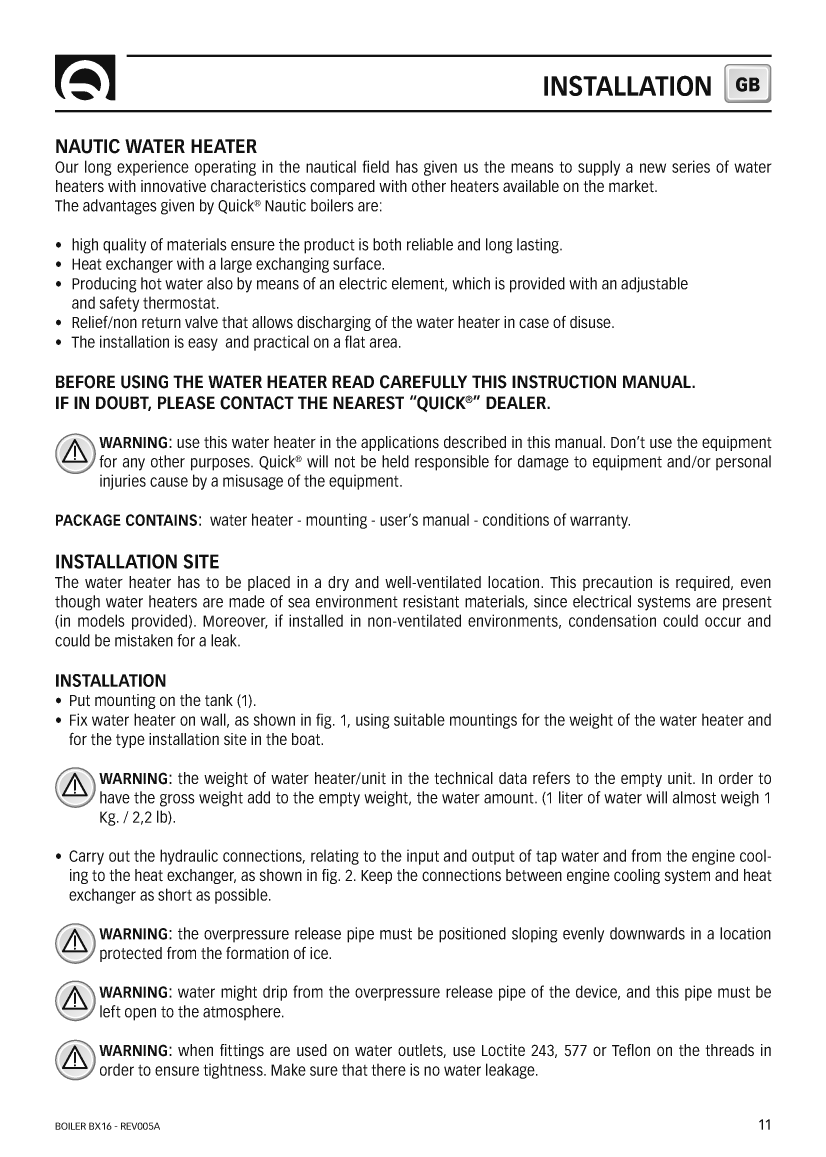 BOILER INOX BX 16High Quality Nautical Equipment BOILER SERIE INOXUsers Manual WATER HEATER STAINLESS STEEL CHAUFFEEAU ACIER INOX BOILER EDELSTAHL CALENTADOR ACERO INOXManual de uso AQUECEDOR INOXIDVEL VATTENVRMARE I ROSTFRI STLHandleiding BOILER RORSTVRIJ 4 tecnichePag 5 6 Schema di 7 Uso Avvertenze importantiPag 89 10 Technical dataPag 11 12 Connection diagramPag 13 Usage WarningPag 1415 MaintenancePag 16 techniquesPag 17 18 Schma de cblagePag 19 Utilisation importantsPag 2021 EntretienSeite 22 Technische 23 24 25 Gebrauch Wichtige HinweiseSeite 2627 WartungPg 28 Caractersticas tcnicasPg 29 InstalacinPg 30 Esquema de montagePg 31 Uso Advertencias importantesPg 3233 34 Caractersticas tcnicasPg 35 Instalao Pg 36 Esquema de conexoPg 37 Uso Avisos importantesPg 3839 ManutenoPag 46 Technische eigenschappen Pag 47 Installatie Pag 48 49 Gebruik Belangrijke 5051 OnderhoudSid 40 Tekniska egenskaperSid 41 Installation Sid 42 43 Anvndning Viktiga freskrifterSid 4445 DATA 1 Bar 100 kPa Available on request 110Vac 10 1200W Of empty equipment Only for 110 capacityliter Power of not installed 500 W 600 W 1200 WHOW TO IDENTIFY THE WATER HEATER THROUGH THE CODEexchanger not presentVoltage of if installed 220 Vac L 110 Vac1 EXAMPLE BX1605S2 EXAMPLE 16TANK CAPACITYUS gallon422Tank materialAISI 316 Stainless steelThermal foamExternal cladding materialTank pressure during testing800 kPa Maximum working pressure600 kPa Electric element voltage rating 220 Vac 10 110 Vac 10Weight with heat exchanger 500 1200 Weight reserves the right to introduce changes to the equipment and the contents of this manual without prior noticeIn case of discordance or errors in translation between the translated version and the original text in the Italian language reference will be made to the Italian or English WATER HEATEROur long experience operating in the nautical eld has given us the means to supply a new series of water heaters with innovative compared with other heaters available on the marketThe advantages given by Quick Nautic boilers are high quality of materials ensure the product is both reliable and long lasting Heat exchanger with a large exchanging surface Producing hot water also by means of an electric element which is provided with an adjustable and safety thermostat Reliefnon return valve that allows discharging of the water heater in case of disuse The installation is easy and practical on a at areaBEFORE USING THE WATER HEATER READ CAREFULLY THIS INSTRUCTION MANUAL IF IN DOUBT PLEASE CONTACT THE NEAREST QUICK DEALERWARNING use this water heater in the applications described in this manual Dont use the equipment for any other purposes Quick will not be held responsible for damage to equipment andor personal injuries cause by a misusage of the CONTAINS water heater mounting users manual conditions of SITEThe water heater has to be placed in a dry and wellventilated location This precaution is required even though water heaters are made of sea environment resistant materials since electrical systems are present in models provided Moreover if installed in nonventilated environments condensation could occur and could be mistaken for a Put mounting on the tank 1 Fix water heater on wall as shown in g 1 using suitable mountings for the weight of the water heater and for the type installation site in the boatWARNING the weight of water heaterunit in the technical data refers to the empty unit In order to have the gross weight add to the empty weight the water amount 1 liter of water will almost weigh 1 Kg 22 lb Carry out the hydraulic connections relating to the input and output of tap water and from the engine cooling to the heat exchanger as shown in g 2 Keep the connections between engine cooling system and heat exchanger as short as the overpressure release pipe must be positioned sloping evenly downwards in a location protected from the formation of iceWARNING water might drip from the overpressure release pipe of the device and this pipe must be left open to the when ttings are used on water outlets use Loctite 243 577 or Te on on the threads in order to ensure tightness Make sure that there is no water TAPWATER OUTPUTCOLD TAPWATER INPUTTAP WATER TANKWATER PUMPCOLD WATERHOT WATEREXPANSION DIAGRAMWARNING follow the instructions of the boat engine manufacturer on how to connect engine cooling liquid to the heat exchanger Fit the stub pipe 11o the valve 9sing hose clamp Fit the pipe so as to allow any possible water leak not to cause damage to part of the boat Open up hot water taps of washbasins and start the water pump This allows water to ll water heater and force air out of water heater and pipes Close taps as soon as air free water comes out Check that there are no leaks on pipe jointsUNIT POWER SUPPLYSee g3 for the connection Make sure the water heater operating voltage is the same as that provided by AC networkA double pole switch has to be included on the electric installation in order to turn on and off the unit and a fuse of suitable rating The insulation between connections contacts of the AC network must be at least 3 mm The connections to AC network must be done following the National Speci cations on electrical before carrying out the connection make sure the cables are not liveWARNING dont operate the electric element if the tank is not lled with water It may cause a permanent damage to the electric ADJUSTING The standard temperature value of the thermostat is 60C If you wish to change it follow the instructions below shut down power supply Remove the protection cover 16 in order to reach the thermostat 14 Adjust the thermostat knob with a screwdriver g 4 and turn it to the required temperature Replace on the protection cover 16 Switch on power supplyThe mixer controls the hot water temperature when the heating elements and the heat exchanger are usedUSAGE WARNINGWARNING Quick nautic water heaters are provided with a double thermostat with manual reset that shuts down power supply in case of an ex