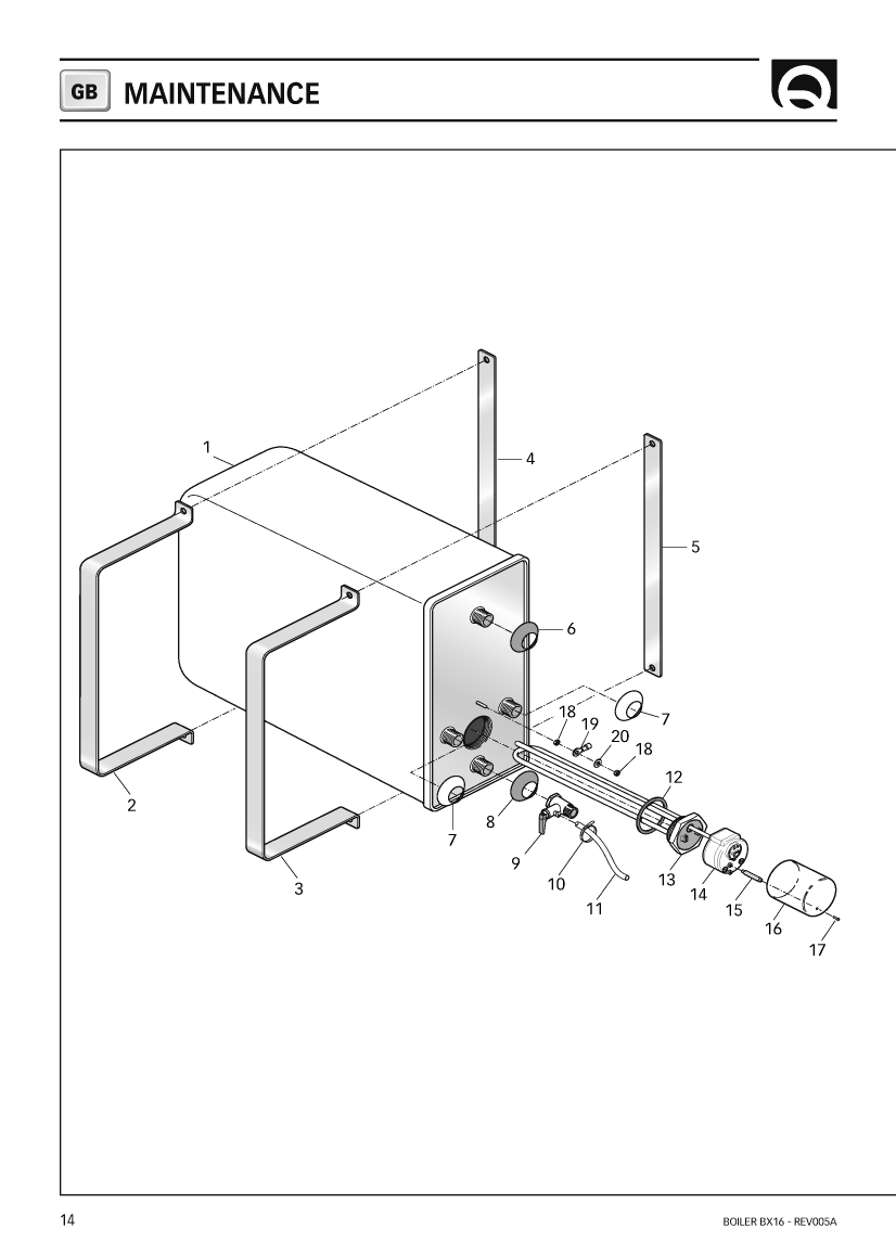 BOILER INOX BX 16High Quality Nautical Equipment BOILER SERIE INOXUsers Manual WATER HEATER STAINLESS STEEL CHAUFFEEAU ACIER INOX BOILER EDELSTAHL CALENTADOR ACERO INOXManual de uso AQUECEDOR INOXIDVEL VATTENVRMARE I ROSTFRI STLHandleiding BOILER RORSTVRIJ 4 tecnichePag 5 6 Schema di 7 Uso Avvertenze importantiPag 89 10 Technical dataPag 11 12 Connection diagramPag 13 Usage WarningPag 1415 MaintenancePag 16 techniquesPag 17 18 Schma de cblagePag 19 Utilisation importantsPag 2021 EntretienSeite 22 Technische 23 24 25 Gebrauch Wichtige HinweiseSeite 2627 WartungPg 28 Caractersticas tcnicasPg 29 InstalacinPg 30 Esquema de montagePg 31 Uso Advertencias importantesPg 3233 34 Caractersticas tcnicasPg 35 Instalao Pg 36 Esquema de conexoPg 37 Uso Avisos importantesPg 3839 ManutenoPag 46 Technische eigenschappen Pag 47 Installatie Pag 48 49 Gebruik Belangrijke 5051 OnderhoudSid 40 Tekniska egenskaperSid 41 Installation Sid 42 43 Anvndning Viktiga freskrifterSid 4445 DATA 1 Bar 100 kPa Available on request 110Vac 10 1200W Of empty equipment Only for 110 capacityliter Power of not installed 500 W 600 W 1200 WHOW TO IDENTIFY THE WATER HEATER THROUGH THE CODEexchanger not presentVoltage of if installed 220 Vac L 110 Vac1 EXAMPLE BX1605S2 EXAMPLE 16TANK CAPACITYUS gallon422Tank materialAISI 316 Stainless steelThermal foamExternal cladding materialTank pressure during testing800 kPa Maximum working pressure600 kPa Electric element voltage rating 220 Vac 10 110 Vac 10Weight with heat exchanger 500 1200 Weight reserves the right to introduce changes to the equipment and the contents of this manual without prior noticeIn case of discordance or errors in translation between the translated version and the original text in the Italian language reference will be made to the Italian or English WATER HEATEROur long experience operating in the nautical eld has given us the means to supply a new series of water heaters with innovative compared with other heaters available on the marketThe advantages given by Quick Nautic boilers are high quality of materials ensure the product is both reliable and long lasting Heat exchanger with a large exchanging surface Producing hot water also by means of an electric element which is provided with an adjustable and safety thermostat Reliefnon return valve that allows discharging of the water heater in case of disuse The installation is easy and practical on a at areaBEFORE USING THE WATER HEATER READ CAREFULLY THIS INSTRUCTION MANUAL IF IN DOUBT PLEASE CONTACT THE NEAREST QUICK DEALERWARNING use this water heater in the applications described in this manual Dont use the equipment for any other purposes Quick will not be held responsible for damage to equipment andor personal injuries cause by a misusage of the CONTAINS water heater mounting users manual conditions of SITEThe water heater has to be placed in a dry and wellventilated location This precaution is required even though water heaters are made of sea environment resistant materials since electrical systems are present in models provided Moreover if installed in nonventilated environments condensation could occur and could be mistaken for a Put mounting on the tank 1 Fix water heater on wall as shown in g 1 using suitable mountings for the weight of the water heater and for the type installation site in the boatWARNING the weight of water heaterunit in the technical data refers to the empty unit In order to have the gross weight add to the empty weight the water amount 1 liter of water will almost weigh 1 Kg 22 lb Carry out the hydraulic connections relating to the input and output of tap water and from the engine cooling to the heat exchanger as shown in g 2 Keep the connections between engine cooling system and heat exchanger as short as the overpressure release pipe must be positioned sloping evenly downwards in a location protected from the formation of iceWARNING water might drip from the overpressure release pipe of the device and this pipe must be left open to the when ttings are used on water outlets use Loctite 243 577 or Te on on the threads in order to ensure tightness Make sure that there is no water TAPWATER OUTPUTCOLD TAPWATER INPUTTAP WATER TANKWATER PUMPCOLD WATERHOT WATEREXPANSION DIAGRAMWARNING follow the instructions of the boat engine manufacturer on how to connect engine cooling liquid to the heat exchanger Fit the stub pipe 11o the valve 9sing hose clamp Fit the pipe so as to allow any possible water leak not to cause damage to part of the boat Open up hot water taps of washbasins and start the water pump This allows water to ll water heater and force air out of water heater and pipes Close taps as soon as air free water comes out Check that there are no leaks on pipe jointsUNIT POWER SUPPLYSee g3 for the connection Make sure the water heater operating voltage is the same as that provided by AC networkA double pole switch has to be included on the electric installation in order to turn on and off the unit and a fuse of suitable rating The insulation between connections contacts of the AC network must be at least 3 mm The connections to AC network must be done following the National Speci cations on electrical before carrying out the connection make sure the cables are not liveWARNING dont operate the electric element if the tank is not lled with water It may cause a permanent damage to the electric ADJUSTING The standard temperature value of the thermostat is 60C If you wish to change it follow the instructions below shut down power supply Remove the protection cover 16 in order to reach the thermostat 14 Adjust the thermostat knob with a screwdriver g 4 and turn it to the required temperature Replace on the protection cover 16 Switch on power supplyThe mixer controls the hot water temperature when the heating elements and the heat exchanger are usedUSAGE WARNINGWARNING Quick nautic water heaters are provided with a double thermostat with manual reset that shuts down power supply in case of an ex