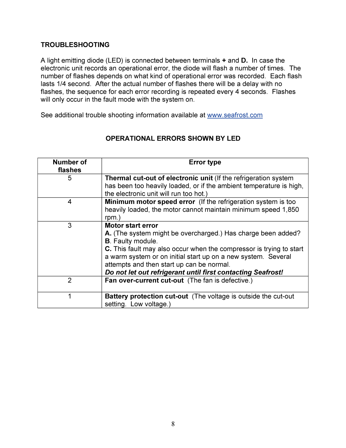 d8681040 18004356708 wwwseafrostcom 9hvccOS9tLv10b uIw6zjakdg HmvpcwY6xAOy 7bYSPGn5h f6aYoPGfr85lq 1IVbnx FSjuzxkSH4 8 DPemu mi vhfecbazvs qokl ptw AAAA IIIIXSOLI G DB qeUOxjVNHC7420 5E0N0Y1e1s1222 2C MYfus sdWME520 2DPjeWKB4 9CPnXKA80 5MZkUH 5 WgQ E2 C nTNIC623AHOW 7zHyOwUvtcskq tp nlkihfedddd10 FECA597D6L4 V3 1 m yiRJD 9854203 scWME8543217HS moSJB741 5JVdtqSH71 7AMZi gWJ70 3IVfyc B BABBB CCDDDDDDHO SWE28FMVllOB61 QzNKq pcVK62GUbp8 DRly5AN ht243 0KXdpz9FSku 4ANZfpyIUjt 3GOVcipx05751 MMMNMLL PPQ7Q 6Ati5V0MD 6320 4 6wmd RKC963104MXet tjaXOG81 JWgy Hb nameaPpost dEeE bch aeeDdD acEeE bch CEeE bch aeeDCD KEeE bch YXRU KV1BfJKAn unducted unit in a poorly ventilated small space will heat the air lowering the cooling capacity and possibly causing damage by overheating the compressor The Sea Frost BD system is shipped precharged with refrigerant This refrigerant is under some pressure Do not fiddle with the connectors or the service ports You might get hurt Wear safety glasses when connecting the compressor This system operates with refrigerant R134a and is pre chargedPBC board fuse is required only if using Electronic Thermostat with the RJ45 6 OPTIONAL REMOTE THERMOSTAT OPERATION Slide the bulb clip onto the edge of the plate and over the sensing bulb The sensing bulb must be in excellent thermal contact with the plate We recommend that the probe be mounted on the plate in the one of the lower mounting positions as shown in the drawing below This is best because these positions remain colder The SEA FROST BD thermostat is variable Turning the knob fully turns the unit OFF The fully clockwise setting is the coldest The thermostat may be adjusted to obtain any temperature desired in the cabinet The thermostat may be calibrated should the warmest setting be too cold To calibrate the thermostat remove the mounting screws and tip the panel forward Remove the electrical tape if necessaryscrew about an inch into the case To lower box temperature rotate this screw counter clockwise One full revolution will change the box temperature approximately 6 degrees F To raise the temperature in the box rotate the screw clockwise Make small adjustments Record all adjustments evaporator plate Allowing Error type Battery protection cutout 1 Electronic unit 2 Battery 3 Main switch optional4 LED for operational errors 5 Fan 6 Thermostat 7 Resister for presetting 8 Resister for presetting 9 Fuse see electrical Our Repair Policy GIPfx22004G5E5 PK Su O6XxyEGXXY Version Distiller 505 Word BD AIRdoc