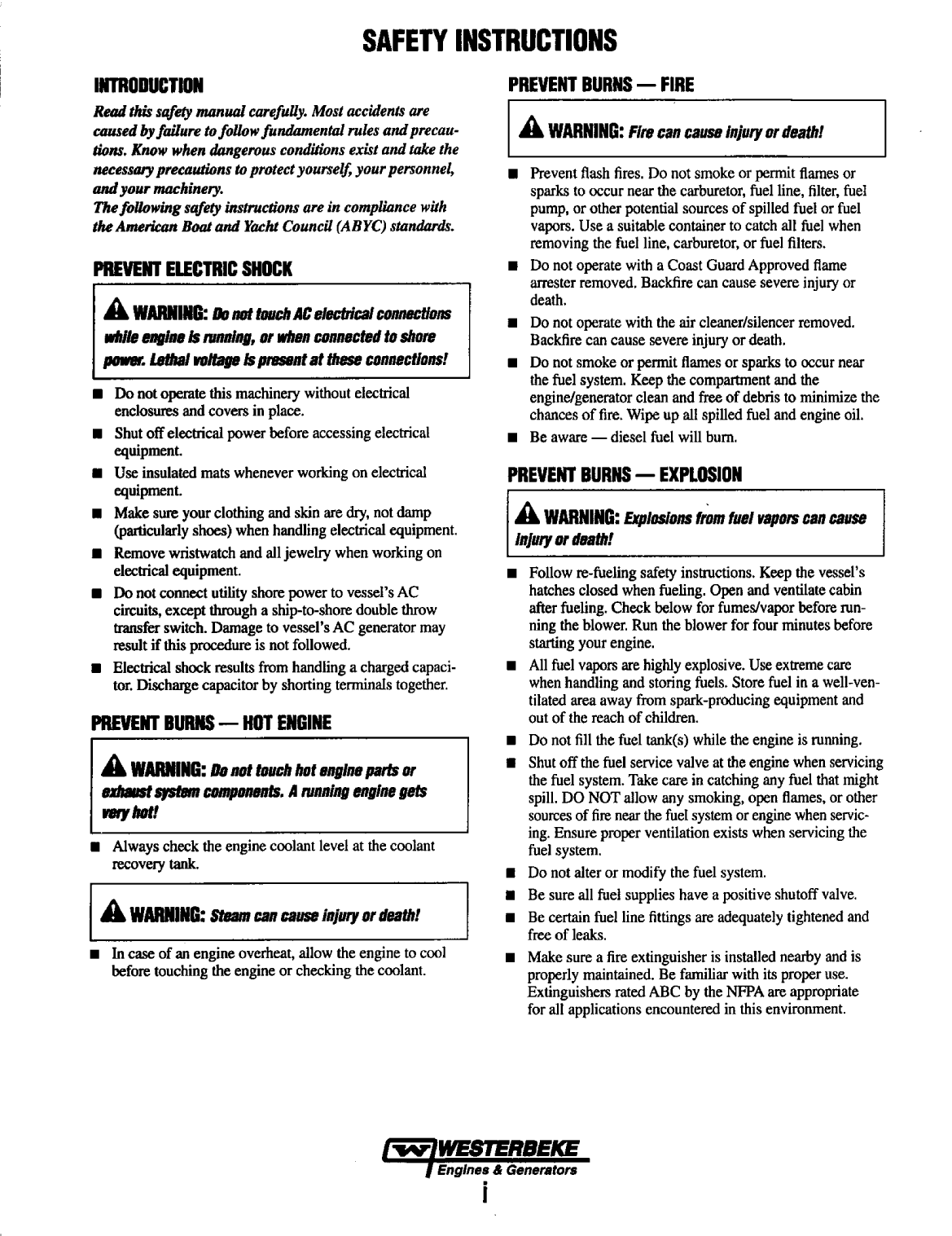vWESTERBEKE Engines Generators 312 I I I I 3 3 I 1 1 1 TO METRIC EQUIVALENT CHART Fractions of Decimal inMetric mmFractions of Decimal inMetric mman inch an inch 164 0015625 039688 3364 0515625 1309687 132 003125 079375 1732 053125 1349375 364 0046875 119062 3564 0546875 1389062 116 00625 158750 916 05625 1428750 564 0078125 198437 3764 0578125 1468437 332 009375 238125 1932 059375 1508125 764 0109375 277812 3964 0609375 1547812 18 0125 3175 58 0625 1587500 964 0140625 357187 4164 0640625 1627187 532 015625 396875 2132 065625 1666875 1164 0171875 436562 4364 0671875 1706562 3116 01875 476250 1116 06875 1746250 1364 0203125 515937 4564 0703125 1785937 732 021875 555625 2332 071875 1825625 1564 0234375 595312 4764 0734375 1865312 14 0250 635000 34 0750 1905000 1764 0265625 674687 4964 0765625 1944687 932 028125 714375 2532 078125 1984375 1964 0296875 754062 5164 0796875 2024062 5116 03125 793750 1316 08125 2063750 2164 0328125 833437 5364 0828125 2103437 1132 034375 873125 2732 084375 2143125 2364 0359375 912812 55164 0859375 2182812 38 0375 952500 78 0875 2222500 2564 0390625 992187 5764 0890625 2262187 1332 040625 1031875 2932 090625 2301875 2764 0421875 1071562 5964 0921875 2341562 716 04375 1111250 1516 09375 2381250 2964 0453125 1150937 6164 0953125 2420937 1532 046875 1190625 3132 096875 2460625 3184 0484375 1230312 6364 0984375 2500312 12 0500 1270000 1 100 2540000 WESTERBEKE Engines Generators 95 MECC ALTE GENERATOR ASSEMBLY OF THE GENERATOR TO THE ENGINE 1 Position the rotor assembly onto the flywheel aligning the holes in the drive discs with the holes in the flywheel Install the M8 x 125 x 25mm bolts blue loctite on threadsand torque to 21 Nm 16 ftlbInstall a threaded rod MI2 x 175 x 90mm long into the threaded end of the rotor shaft M8 X 125 X 25MM BOLTS ROD DRIVE 2 With the aid of a sling or fabricated lifting eye support the stator housing assembly and carefully guide it over the rotor assembly until the rear bearing contacts the bearing boss in the rear support 3 Place a large washer of at least 80mm in diameter with a center hole of 15mm onto the threaded rod followed by a 12mm x 175 nut Center the rear bearing in the bearing boss of the support plate Tighten the nut until the bear255ing seats fully into the boss Secure the stator housing assembly to the bell housing using the four MIO x 35mm screws Torque to 35 Nm 25 ftlbremove the nut washer and threaded rod 4 Rotate the generator by hand two full revolutions to ensure the generator rotates freely Reinstall the rear ventcover S Secure the generator to its rear isolators Route the generator wiring into the control box and mount the control box to the generator Reconnect all wire connections test run Engines Generators 94 MECC ALTE GENERATOR BREAKDOWN Periodically inspect the rotor carrier bearing Replace this bearing at 10000 hours of normal operation or sooner if wear is evident Inspect and clean the control box interior look for loose broken or burned wires and terminals Use low air pressure 25 psi maxto remove dirt and dust from components BEARING BRACKfT PARTS BREAKDOWN DISASSEMBLY Should it become necessary to disassemble the statorrotor assembly from the engine use the following as a guide 1 Properly supporlllift the rear of the engine to allow the generator to be unbolted from the rear support isolators 2 Mark then disconnect the electricalleds that exit the generator from their connections in the control box Be sure to properly mark the connection points the generator leds connect to Make an illustration if needed whether the generator is to be reinstalled or a replacement is to be installed This is to ensure proper reconnection of electricalleds Unbolt the control box and lift it off the generator 3 Remove the rear vent cover Support the generator with a sling or fabricated lifting eye Using a 17mm socket wrench remove the four bolts that attach the generator stator housing assembly to the flywheel housing carefully work the stator assembly off the rear bearing and off and over the rotor assembly Remove all dirt oil grease and dust build up from the external surface of the generator Build267up reduces heat dissipation and causes the AC generator end to operate at a higher temperature This results in a loss of efficiency and reduces service life 4 Support the rotor assembly with a sling and using a 17mm box wrench unbolt the rotor assembly from the flywheel DISC EnQlnes Generators 93 WIRING SCHEMATIC EXCITER ROTORROTATING FIELD rI I EXCITER ROTOR I WINDINGS I 6TRANSIENT i I I I I I I I I I I I I j DIODE I I 1 EXCITER RDTOR WlIDIIGS B c ISOLATION DIODE PLATES GREEN Engines Generators 91 RED RED ROTOR LOW VOLTAGE267 EXCITER ROTOR AND ROTATING FIELD Position the exciter rotorrotating field so the transient suppressor is visible at the 12 OClock position TESTING THE ROTATING FIELD WINDINGS Place the ohm meter probes on the two large red wires and These are the connecting wires for the rotating field windings These wires do not need to be lifted off their connections unless when testing there is an ohm valve discrepancy or a continuity to ground the rotor shaftIf this occurs lift these two large field wires off the diode plates isolate them and repeat the above test NOTE When removing these wires be careful notto drop the screws or washers into the rotor REDTESTING THE EXCITER ROTOR WINDINGS These windings are tested in pairs A to B B to C and C to A as shown on the drawing c EXCITER ROTOR WINDINGS VIEW OF ROTOR FROM THE BEARING END 12 aCLOCK POSITION Disconnect these three wires from the diode bridge plates taking care not to drop any screws or washers With the wires clear from the bridge plates test each pair with an ohm meter A to B B to C and C to A No continuity should be found between the rotor and any of these three winding pairs TESTING THE DIODES Diodes can be checked with an ohmmeter Disconnect the wire of the particular diode and test its resistance in both directions A perfectly functioning diode will show a