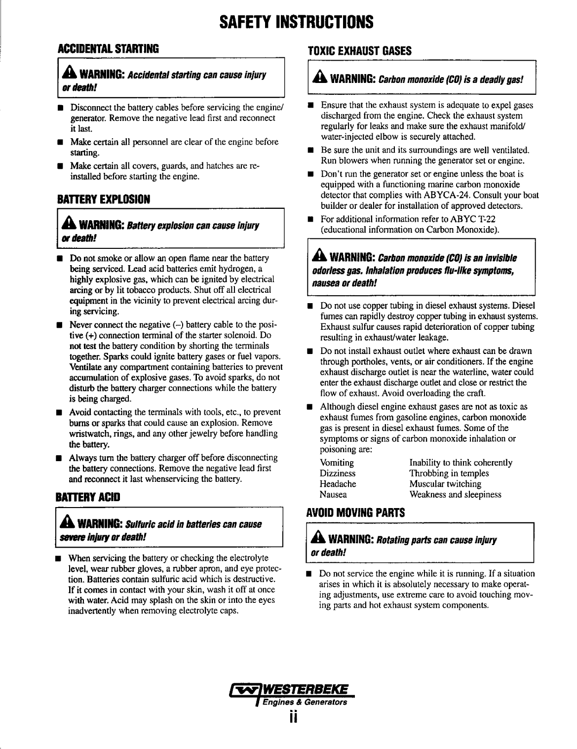 vWESTERBEKE Engines Generators 312 I I I I 3 3 I 1 1 1 TO METRIC EQUIVALENT CHART Fractions of Decimal inMetric mmFractions of Decimal inMetric mman inch an inch 164 0015625 039688 3364 0515625 1309687 132 003125 079375 1732 053125 1349375 364 0046875 119062 3564 0546875 1389062 116 00625 158750 916 05625 1428750 564 0078125 198437 3764 0578125 1468437 332 009375 238125 1932 059375 1508125 764 0109375 277812 3964 0609375 1547812 18 0125 3175 58 0625 1587500 964 0140625 357187 4164 0640625 1627187 532 015625 396875 2132 065625 1666875 1164 0171875 436562 4364 0671875 1706562 3116 01875 476250 1116 06875 1746250 1364 0203125 515937 4564 0703125 1785937 732 021875 555625 2332 071875 1825625 1564 0234375 595312 4764 0734375 1865312 14 0250 635000 34 0750 1905000 1764 0265625 674687 4964 0765625 1944687 932 028125 714375 2532 078125 1984375 1964 0296875 754062 5164 0796875 2024062 5116 03125 793750 1316 08125 2063750 2164 0328125 833437 5364 0828125 2103437 1132 034375 873125 2732 084375 2143125 2364 0359375 912812 55164 0859375 2182812 38 0375 952500 78 0875 2222500 2564 0390625 992187 5764 0890625 2262187 1332 040625 1031875 2932 090625 2301875 2764 0421875 1071562 5964 0921875 2341562 716 04375 1111250 1516 09375 2381250 2964 0453125 1150937 6164 0953125 2420937 1532 046875 1190625 3132 096875 2460625 3184 0484375 1230312 6364 0984375 2500312 12 0500 1270000 1 100 2540000 WESTERBEKE Engines Generators 95 MECC ALTE GENERATOR ASSEMBLY OF THE GENERATOR TO THE ENGINE 1 Position the rotor assembly onto the flywheel aligning the holes in the drive discs with the holes in the flywheel Install the M8 x 125 x 25mm bolts blue loctite on threadsand torque to 21 Nm 16 ftlbInstall a threaded rod MI2 x 175 x 90mm long into the threaded end of the rotor shaft M8 X 125 X 25MM BOLTS ROD DRIVE 2 With the aid of a sling or fabricated lifting eye support the stator housing assembly and carefully guide it over the rotor assembly until the rear bearing contacts the bearing boss in the rear support 3 Place a large washer of at least 80mm in diameter with a center hole of 15mm onto the threaded rod followed by a 12mm x 175 nut Center the rear bearing in the bearing boss of the support plate Tighten the nut until the bear255ing seats fully into the boss Secure the stator housing assembly to the bell housing using the four MIO x 35mm screws Torque to 35 Nm 25 ftlbremove the nut washer and threaded rod 4 Rotate the generator by hand two full revolutions to ensure the generator rotates freely Reinstall the rear ventcover S Secure the generator to its rear isolators Route the generator wiring into the control box and mount the control box to the generator Reconnect all wire connections test run Engines Generators 94 MECC ALTE GENERATOR BREAKDOWN Periodically inspect the rotor carrier bearing Replace this bearing at 10000 hours of normal operation or sooner if wear is evident Inspect and clean the control box interior look for loose broken or burned wires and terminals Use low air pressure 25 psi maxto remove dirt and dust from components BEARING BRACKfT PARTS BREAKDOWN DISASSEMBLY Should it become necessary to disassemble the statorrotor assembly from the engine use the following as a guide 1 Properly supporlllift the rear of the engine to allow the generator to be unbolted from the rear support isolators 2 Mark then disconnect the electricalleds that exit the generator from their connections in the control box Be sure to properly mark the connection points the generator leds connect to Make an illustration if needed whether the generator is to be reinstalled or a replacement is to be installed This is to ensure proper reconnection of electricalleds Unbolt the control box and lift it off the generator 3 Remove the rear vent cover Support the generator with a sling or fabricated lifting eye Using a 17mm socket wrench remove the four bolts that attach the generator stator housing assembly to the flywheel housing carefully work the stator assembly off the rear bearing and off and over the rotor assembly Remove all dirt oil grease and dust build up from the external surface of the generator Build267up reduces heat dissipation and causes the AC generator end to operate at a higher temperature This results in a loss of efficiency and reduces service life 4 Support the rotor assembly with a sling and using a 17mm box wrench unbolt the rotor assembly from the flywheel DISC EnQlnes Generators 93 WIRING SCHEMATIC EXCITER ROTORROTATING FIELD rI I EXCITER ROTOR I WINDINGS I 6TRANSIENT i I I I I I I I I I I I I j DIODE I I 1 EXCITER RDTOR WlIDIIGS B c ISOLATION DIODE PLATES GREEN Engines Generators 91 RED RED ROTOR LOW VOLTAGE267 EXCITER ROTOR AND ROTATING FIELD Position the exciter rotorrotating field so the transient suppressor is visible at the 12 OClock position TESTING THE ROTATING FIELD WINDINGS Place the ohm meter probes on the two large red wires and These are the connecting wires for the rotating field windings These wires do not need to be lifted off their connections unless when testing there is an ohm valve discrepancy or a continuity to ground the rotor shaftIf this occurs lift these two large field wires off the diode plates isolate them and repeat the above test NOTE When removing these wires be careful notto drop the screws or washers into the rotor REDTESTING THE EXCITER ROTOR WINDINGS These windings are tested in pairs A to B B to C and C to A as shown on the drawing c EXCITER ROTOR WINDINGS VIEW OF ROTOR FROM THE BEARING END 12 aCLOCK POSITION Disconnect these three wires from the diode bridge plates taking care not to drop any screws or washers With the wires clear from the bridge plates test each pair with an ohm meter A to B B to C and C to A No continuity should be found between the rotor and any of these three winding pairs TESTING THE DIODES Diodes can be checked with an ohmmeter Disconnect the wire of the particular diode and test its resistance in both directions A perfectly functioning diode will show a