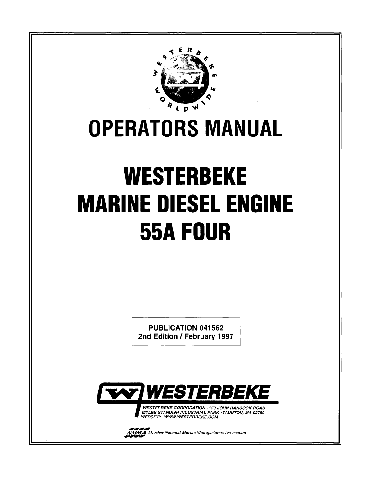 OPERATORS MANUAL DIESEL ENGINE 55A FOUR PUBLICATION 041562 2nd Edition I February 1997 l WESTERBEKE WESTERBEKE CORPORATION 150 JOHN HANCOCK ROAD MYLES STANDISH INDUSTRIAL PARK TAUNTON MA 02780 WEBSITE AlMMA Member National Marine Manufacturers Association CALIFORNIA Proposition 65 WarningDiesel engine exhaust and someof its constituents are known tothe State of California to causecancer birth defects and harm II WESJERBEKE I Engines Generators SAFETY PREVENT BURNS FIRERead this safety manual carefully Most accidents are causedby failure to foUow fundamental rules and when dangerous conditions exist and take the A WARNING Fire can cause injury or deathnecessary precautions to protect yourself your personneand your machinery Prevent flash fires Do not smoke or permit flames orThe foUowing safety instructions are in compliance with sparks to occur near the carburetor fuel line filter fuelthe American Boat and Yacht Council ABYC standards pump or other potential sources of spilled fuel or fuel vapors Use a suitable container to catch all fuel whenPREVENT ELECTRIC SHOCK removing the fuel line carburetor or fuel filters Do not operate with a Coast Guard Approved flame arrester removed Backfire can cause severe injury or A WARNING Do not touch AC electrical connections death while engine is running or when connected to shore Do not operate with the air removed power Lethal voltage is present at these connections Backfire can cause severe injury or death Do not smoke or permit flames or sparks to occur near the Do not operate this machinery without electrical fuel system Keep the compartment and the enginegener enclosures and covers in place ator clean and free of debris to minimize the chances of Shut off electrical power before accessing electrical fire Wipe up all spilled fuel and engine oil equipment Be aware diesel fuel will bum Use insulated mats whenever working on electrical equipment PREVENT BURNS EXPLOSION Make sure your clothing and skin are dry not damp particularly shoes when handling electrical equipment Remove wristwatch and all jewelry when working on A WARNING Explosions from fuel vapors can cause injury or death electrical equipment Do not connect utility shore power to vessels AC circuits except through a shiptoshore double throw Follow refueling safety instructions Keep the vessels transfer switch Damage to vessels AC generator may hatches closed when fueling Open and ventilate cabin result if this procedure is not followed after fueling Check below for fumesvapor before running the blower Run the blower for four minutes before start Electrical shock results from handling a charged capacitor ing your engine Discharge capacitor by shorting terminals together All fuel vapors are highly explosive Use extreme care whenPREVENT BURNS HOT ENGINE handling and storing fuels Store fuel in a wellventilated area away from sparkproducing equipment and out of the reach of children A WARNING Do not touch hot engine parts or Do not fill the fuel tanks while the engine is running exhaust system components A running engine gets Shut off the fuel service valve at the engine when servicing very hot the fuel system Take care in catching any fuel that might spill DO NOT allow any smoking open flames or other Always check the engine coolant level at the coolant sources of fire near the fuel system or engine when servicing recovery tank Ensure proper ventilation exists when servicing the fuel system A WARNING Steam can cause injury or death Do not alter or modify the fuel system Be sure all fuel supplies have a positive shutoff valve In case of an engine overheat allow the engine to cool Be certain fuel line fittings are adequately tightened and before touching the engine or checking the coolant free of leaks Make sure a fire extinguisher is installed nearby and is properly maintained Be familiar with its proper use Extinguishers rated ABC by the NFPA are appropriate for all applications encountered in this environment Engines Generators SAFETY STARTING TOXIC EXHAUST GASES A WARNING Accidental starting can cause injury A WARNING Carbon monoxide CO is a deadly gas or death Ensure that the exhaust system is adequate to expel gases Disconnect the battery cables before servicing the engine discharged from the engine Check the exhaust system generator Remove the negative lead first and reconnect regularly for leaks and make sure the exhaust manifolds it last are securely attached and no warping exists Pay close attention to the manifold water injection elbow and Make certain all personnel are clear of the engine before exhaust pipe nipple starting Be sure the unit and its surroundings are well ventilated Make certain all covers guards and hatches are re installed before starting the engine In addition to routine inspection of the exhaust system install a carbon monoxide detector Consult your boatBATTERY EXPLOSION builder or dealer for installation of approved detectors For additional information refer to ABYC T22 educa A WARNING Battery explosion can cause injury tional information on Carbon Monoxide or death A WARNING Carbon monoxide CO is an invisible Do not smoke or allow an open flame near the battery odorless gas Inhalation produces flulike symptoms being serviced Lead acid batteries emit hydrogen a nausea or death highly explosive gas which can be ignited by electrical arcing or by lit tobacco products Shut off all electrical Do not use copper tubing in diesel exhaust systems Diesel equipment in the vicinity to prevent electrical arcing during fumes can rapidly destroy copper tubing in exhaust sys servicing tems Exhaust sulfur causes rapid deterioration of copper Never connect the negative battery cable to the posi tubing resulting in exhaustwater leakage tive connection terminal of the starter solenoid Do not Do not install exhaust outlet where exhaust can be drawn test the battery condition by shorting the terminals through portholes vents or air conditioners If the engine together Sparks could i