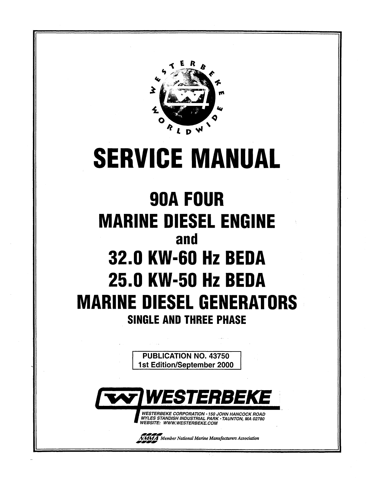 SERVICE MANUAL gOA FOUR MARINE DIESEL ENGINE and 320 KW60 Hz BEDA 250 KW50 Hz BEDAMARINE DIESEL GENERATORS SINGLE AND THREE PHASE PUBLICATION NO 43750 15t 2000 r WESTERBEKE I WESTERBEKE CORPORATION 150 JOHN HANCOCK ROAD MYLES STANDISH INDUSTRIAL PARK TAUNTON MA 02780 WEBSITE NMMA Member National Marine Manufacturen Associlltion CALIFORNIA PROPOSITION 65 WARNING Diesel engine exhaust and some of its constituents are known to the State of California to cause cancer birth defects and other reproductive harm A WARNINGExhaust gasses contain Carbon Monoxide an odorless andcolorless gas Carbon Monoxide is poisonous and can and death Symptoms of Carbon can Throbbing in TemplesNausea Muscular Vomiting Weakness and Sleepiness Inability to Think CoherentlyIF YOU OR ANYONE ELSE EXPERIENCE ANY OF THESE SYMPTOMSGET OUT INTO THE FRESH AIR IMMEDIATELY symptoms persistseek medical attention Shut down the unit and do not restartuntil it has been inspected and repaired This WARNING DECAL is provided by WESTERBEKE and should be fixed to a bulkhead near your engine or generator WESTERBEKE also recommends installing CARBON MONOXIDE DETECTORS in theWARNING9 IIvingsleeping quarters of your vessel They are inexpensive and easily mmtJ obtainable at your local marine store SAFETY PREVENT BURNS FIRERead these safety instructions carefuUy Most accidents arecaused by failure to follow fundamental rules and precau A WARNING Fire can cause injury or deathtions Know when dangerous conditions exist and take thenecessary precautions to protect yourself your personnel Prevent flash fires Do not smoke or permit flames orand your machinery sparks to occur near the carburetor fuel line filter fuelThe following safety instructions are in compliance with the pump or other potential sources of spilled fuel or fuelAmerican Boat and Yacht Council ABYC standards vapors Use a suitable container to catch all fuel when removing the fuel line carburetor or fuel filtersPREVENT ELECTRIC SHOCK Do not operate with a Coast Guard Approved flame arrester removed Backfire can cause severe injury or death A WARNING Do not touch AC electrical connections Do not operate with the air removed while engine is running or when connected to shore Backfire can cause severe injury or death power Lethal voltage is present at these connections Do not smoke or permit flames or sparks to occur near the fuel system Keep the compartment and the Do not operate this machinery without electrical clean and free of debris to minimize the enclosures and covers in place chances of fire Wipe up all spilled fuel and engine oil Shut off electrical power before accessing electrical Be aware diesel fuel will bum equipment Use insulated mats whenever working on electrical PREVENT BURNS EXPLOSION equipment Make sure your clothing and skin are dry not damp particularly shoes when handling electrical equipment A WARNING Explosions from fuel vapors can cause injury or death Remove wristwatch and all jewelry when working on electrical equipment Follow refueling safety instructions Keep the vessels Do not connect utility shore power to vessels AC hatches closed when fueling Open and ventilate cabin circuits except through a shiptoshore double throw after fueling Check below for fumesvapor before run transfer switch Damage to vessels AC generator may ning the blower Run the blower for four minutes before result if this procedure is not followed starting your engine Electrical shock results from handling a charged capaci All fuel vapors are highly explosive Use extreme care tor Discharge capacitor by shorting terminals together when handling and storing fuels Store fuel in a wellven with an insulated tool tilated area away from sparkproducing equipment and out of the reach of BURNS HOT ENGINE Do not fill the fuel tanks while the engine is running Shut off the fuel service valve at the engine when servicing A WARNING Do not touch hot engine parts or the fuel system Take care in catching any fuel that might spill DO NOT allow any smoking open flames or other exhaust system components A running engine gets sources of fire near the fuel system or engine when servic very hot ing Ensure proper ventilation exists when servicing the fuel system Always check the engine coolant level at the coolant Do not alter or modify the fuel system recovery tank Be sure all fuel supplies have a positive shutoff valve Be certain fuel line fittings are adequately tightened and A WARNING Steam can cause injury or death free ofleaks Make sure a fire extinguisher is installed nearby and is In case of an engine overheat allow the engine to cool properly maintained Be familiar with its proper use before touching the engine or checking the coolant Extinguishers rated ABC by the NFPA are appropriate for all applications encountered in this environment Engines Generators SAFETY STARTING TOXIC EXHAUST GASES A WARNING Accidental starting can cause injury A WARNING Carbon monoxide CO is a deadly gas or death Ensure that the exhaust system is adequte to expel gases Disconnect the battery cables before servicing the engine discharged from the engine Check the exhaust system generator Remove the negative lead first and reconnect regularly for leaks and make sure the exhaust manifolds it last are securely attached and no warping exists Pay close Make certain all personnel are clear of the engine before attention to the manifold water injection elbow and starting exhaust pipe nipple Make certain all covers guards and hatches are re Be sure the unit and its surroundings are well ventilated installed before starting the engine In addition to routine inspection of the exhaust system install a carbon monoxide detector Consult your boatBATTERY EXPLOSION builder or dealer for installation of approved detectors For additional infonnation refer to ABYC T22 educa A WARNING Battery explosion can cause injury tional infonnation on Carbon Monoxide or death Do not smoke or allow an open flame near the battery A WARNING Carbon monoxi