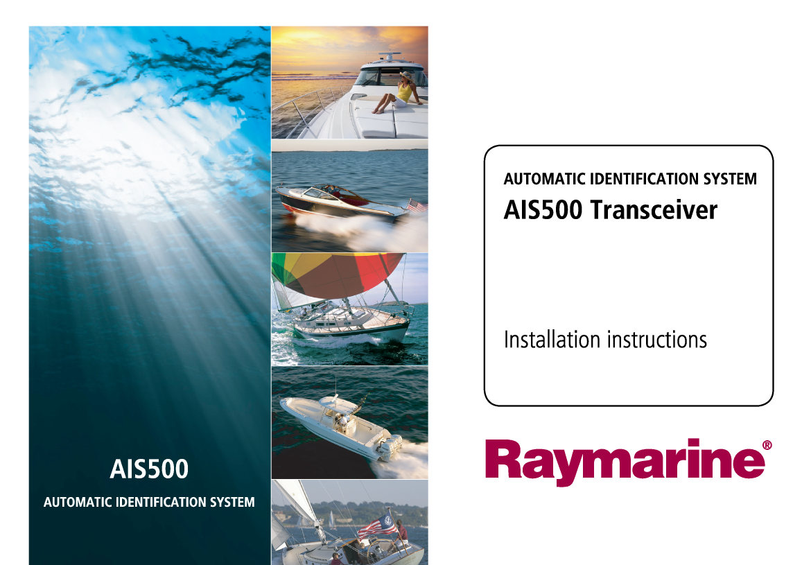 AUTOMATIC IDENTIFICATION SYSTEMAIS500 and registered HSB RayTech Navigator Sail Pilot SeaTalk and Sportpilot are UK registered trademarks of Raymarine UK and Raymarine are UK registered trademarks of Raymarine Holdings Limited 45STV 60STV AST Autoadapt Auto AutoTrim Bidata G Series HDFI LifeTag Marine Intelligence Maxiview On Board Raychart Raynav Raypilot RayTalkRaystar ST40 ST60 Seaclutter Smart Route Tridata UniControl and Waypoint Navigation are trademarks of Raymarine UK LimitedAll other product names are trademarks or registered trademarks of their respective 2008 Raymarine UK Ltd All rights number 871121Date November 1 Introduction 7 Chapter 5 Post installation procedures 7 51 Switching on 36Safety information 7 52 Configuration 36General information 8 53 Checking for interference 37Requirements for USA Canada 9 54 Using AIS 38Requirements for areas outside of USA Canada 11 Chapter 6 Diagnostics 39System information 13 61 Status indication 40Chapter 2 Planning the installation 17 62 4121 EMC installation guidelines 18 Chapter 7 Specifications 4322 Parts supplied 19 71 General 4423 Tools required 19 72 Transceiver 4424 Basic system 20 73 GPS Receiver 45Chapter 3 Cables connections 2331 Cable types and length 2432 Routing cables 2433 Transceiver connections 2534 Cable shielding 26Chapter 4 Installation procedures 2741 Fitting transceiver 2842 Fitting GPS antenna 2943 Connecting up 31 56Chapter 1 Introduction Warning Ensure safe navigation This product is intended only as an aid to navigation and must never be used in preference to navigational judgment Only official government charts and notices to mariners contain all the currentThe information in this book applies to all geographical areas unless information needed for safe navigation and theotherwise stated captain is responsible for their prudent use It is the users responsibility to use official government charts notices to mariners caution and proper navigational skill when operating this or any other information product Warning Product installation Caution Power supply protection This equipment must be installed in accordance with the Raymarine instructions provided Failure to do so When installing this product ensure the power could result in poor product performance personal source is adequately protected by means of a injury andor damage to the vessel suitablyrated fuse or automatic circuit breaker Warning Switch off power supply Safety Notice Ensure the boats power supply is switched OFF RF radiation statement before starting to install this product Do NOT connect Your Raymarine AIS500 transceiver generates and radiates radio or disconnect equipment with the power switched on frequency RF energy EME unless instructed in this document Safe Compass Distance Warning Potential ignition source Safe Compass Distance is 1 meter minimum for any compass This product is NOT approved for use in Some compass types may require greater distances To be sure atmospheres Do NOT install in you should locate your transceiver as far as possible from the a atmosphere such as in an compass Test your compass to verify proper operation while the engine room or near fuel tanks transceiver is also 7General information Warranty registration To register your AIS500 transceiver ownership please take a fewIntended Use minutes to fill out the warranty registration card found in the box or visit and register AIS500 is an AIS Class B transceiver and is intendedfor world wide use aboard leisure marine boats and workboats not It is important that you register your product to receive full by International Maritime Organization IMO and Safety of benefits Your unit package includes a bar code label indicating theLife at Sea SOLAS Carriage Regulations serial number of the unit You should stick this label to the warranty registration card Caution Cleaning Technical accuracy When cleaning this product do NOT use acid ammoniabased or abrasive products and do NOT To the best of our knowledge the information in this document was use high pressure washing jet wash equipment correct at the time it was produced However Raymarine cannot accept liability for any inaccuracies or omissions it may contain In addition our policy of continuous product improvement may changeProduct disposal specifications without notice As a result Raymarine cannot accept liability for any differences between the product and this of this product in accordance with the WEEE Directive AIS500 installation guide Information scope The Waste Electrical and Electronic Equipment WEEEDirective requires the recycling of waste electrical and electronic This document gives introductory installation and Whilst the WEEE Directive does not apply to some information for the Raymarine Automatic Identification System TypeRaymarine products we support its policy and ask you to be aware 500 Transceiver AIS500 transceiverof how to dispose of this product Refer to the ProAIS User Manual and the operating manual for your Raymarine MultiFunction Display for instructions on how to configure and operate your AIS systemAIS disclaimer All documents are available to download as PDFs fromAll information presented by the Raymarine AIS transceiver is only as there is a risk of incomplete and By placing the AIS500 into service you and assume complete responsibility for any risks associated Static data this device and accordingly release Raymarine and SRT The AIS500 transceiver needs to be correctly programmed with theMarine Technology Ltd from any and all claims arising from the use following vessel data static data before useof the AIS service8 Vessel Maritime Mobile Service Identity MMSI number Raymarine AIS transceivers comply with the Federal Communications Commission FCC and Industry Canada Vessel name requirements that regulate marine AIS and VHF radio usage for the Vessel call sign US and Canada respectively Marine AIS users in the US must comply with all applicable FCC rules and regulations some of which Vessel dimen