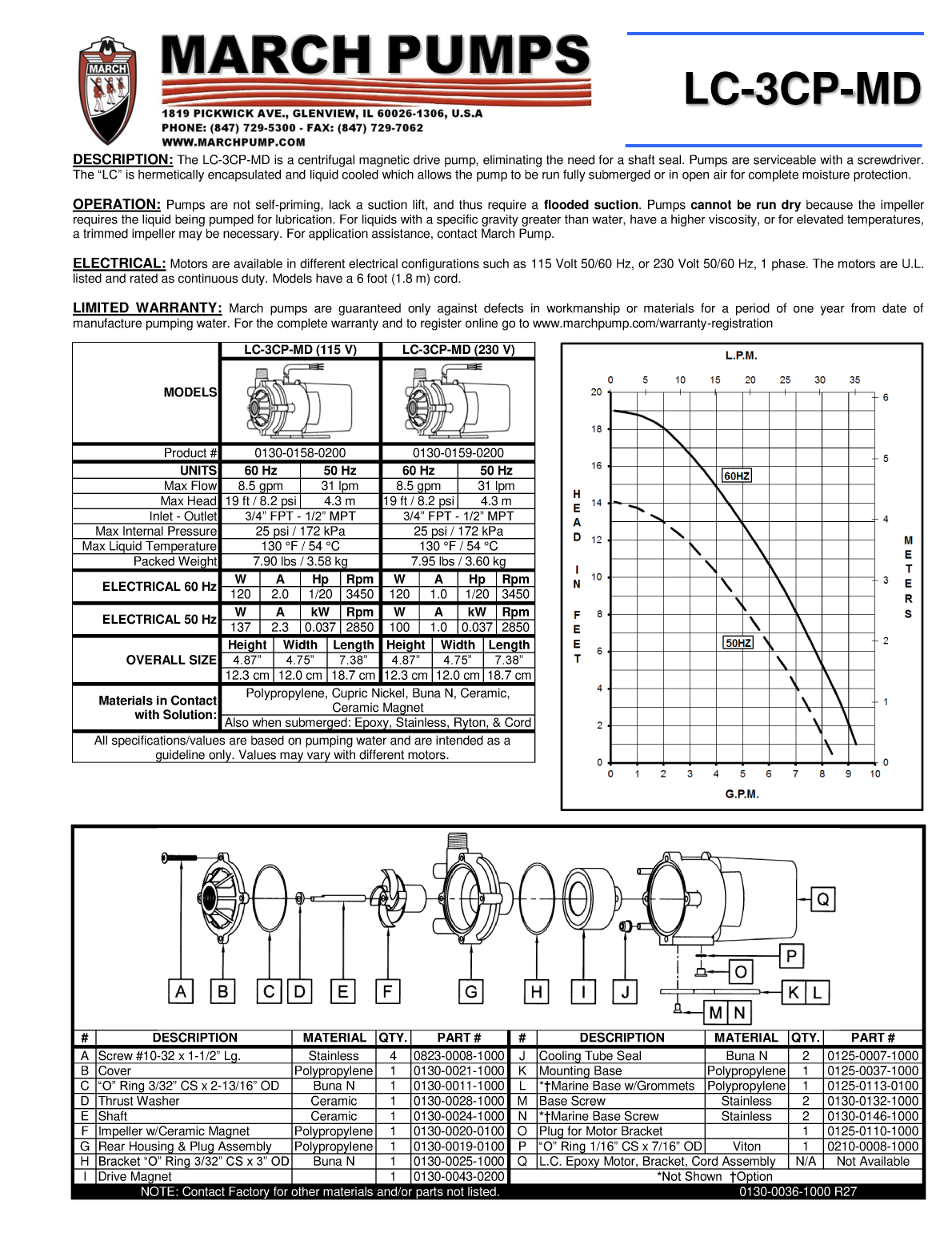 DESCRIPTION The LC3CPMD is a centrifugal magnetic drive pump eliminating the need for a shaft seal Pumps are serviceable with a screwdriver is hermetically encapsulated and liquid cooled which allows the pump to be run fully submerged or in open air for complete moisture protection OPERATION Pumps are not selfpriming lack a suction lift and thus require a flooded suction Pumps cannot be run dry because the impeller requires the liquid being pumped for lubrication For liquids with a specific gravity greater than water have a higher viscosity or for elevated temperatures a trimmed impeller may be necessary For application assistance contact March Pump ELECTRICAL Motors are available in different electrical configurations such as 115 Volt 5060 Hz or 230 Volt 5060 Hz 1 phase The motors are UL listed and rated as continuous duty Models have a 6 foot 18 m cord LIMITED WARRANTY March pumps are guaranteed only against defects in workmanship or materials for a period of one year from date of manufacture pumping water For the complete warranty and to register online go to LC3CPMD MODELS LC3CPMD 115 V LC3CPMD 230 V Product 013001580200 013001590200 UNITS 60 Hz 50 Hz 60 Hz 50 Hz Max Flow 85 gpm 31 lpm 85 gpm 31 lpm Max Head 19 ft 82 psi 43 m 19 ft 82 psi 43 m Inlet Outlet FPT Max Internal Pressure 25 psi 172 kPa 25 psi 172 kPa Max Liquid Temperature 130 F 54 C 130 F 54 C Packed Weight 790 lbs 358 kg 795 lbs 360 kg ELECTRICAL 60 Hz W A Hp Rpm W A Hp Rpm 120 20 120 3450 120 10 120 3450 ELECTRICAL 50 Hz W A kW Rpm W A kW Rpm 137 23 0037 2850 100 10 0037 2850 OVERALL SIZE Height Width Length Height Width Length 123 cm 120 cm 187 cm 123 cm 120 cm 187 cm Materials in Contact with Solution Polypropylene Cupric Nickel Buna N Ceramic Ceramic Magnet Also when submerged Epoxy Stainless Ryton Cord All are based on pumping water and are intended as a guideline only Values may vary with different motors DESCRIPTION MATERIAL QTY PART DESCRIPTION MATERIAL QTY PART A Screw 1032 x 112 Lg Stainless 4 082300081000 J Cooling Tube Seal Buna N 2 012500071000 B Cover Polypropylene 1 013000211000 K Mounting Base Polypropylene 1 012500371000 C 332 CS x 21316 OD Buna N 1 013000111000 L Marine Base wGrommets Polypropylene 1 012501130100 D Thrust Washer Ceramic 1 013000281000 M Base Screw Stainless 2 013001321000 E Shaft Ceramic 1 013000241000 N Marine Base Screw Stainless 2 013001461000 F Impeller wCeramic Magnet Polypropylene 1 013000200100 O Plug for Motor Bracket 1 012501101000 G Rear Housing Plug Assembly Polypropylene 1 013000190100 P 116 CS x 716 OD Viton 1 021000081000 H Buna N 1 013000251000 Q LC Epoxy Motor Bracket Cord Assembly NA Not Available I Drive Magnet 1 013000430200 NOTE Contact Factory for other materials andor parts not listed 013000361000 R27 dWiz1 Aak1 ccb6DLTr0h 679GHIQ JpvXr2 hhh2h h8hhDh zNuzruzNu wu Vz p2j2 ZF0d 9p vRqDf0DlD DlDlDllDl LTH Timestamping DSE Timestamping Manufacturing Word 2010magnetic drive pumps marine pump air conditioning pump Word Sealless Magnetic Drive Pumps Manual for March LC3CPMD