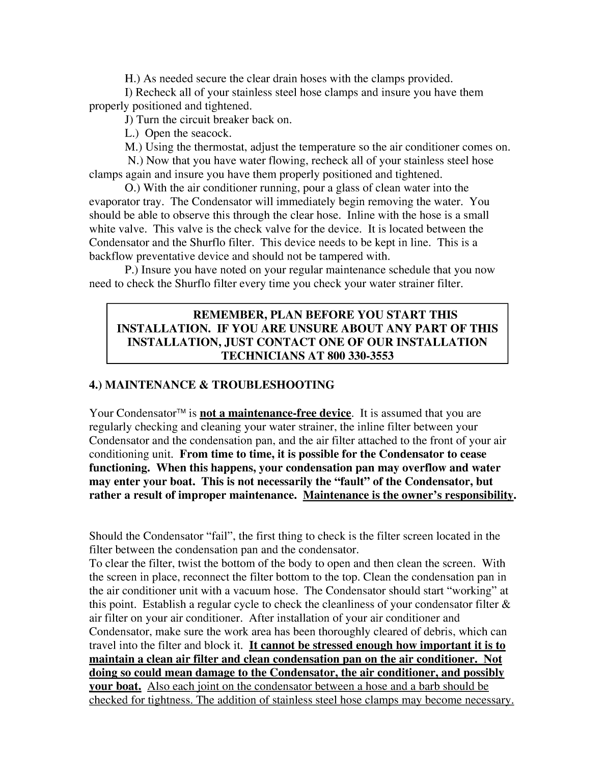 MERMAID CONDENSATOR INSTALLATION MAINTENANCE GUIDELINES Mermaid Manufacturing of Southwest Florida Inc 2651 Park Windsor Drive Suite 203 Fort Myers Fl 33901 Phone 800 3303553 Fax 239 4180538 Email infommaircom Web Site Trust Inc10UVeriSign Time Stamping Service Root1402UNO LIABILITY ACCEPTED cc EF HHEFa aHHEF a FHHEFa a aHHEFa fHHEFa aaHH E D ZQX DY QX MDY QX DY EhD EEadPQXEDYCcbB ECDCCe ia D QXDzzYYFFaHKS XYXY EDEDEeE j Bhja RyE TXYaDRy E I c a a CC5vAp AE PXaYddbQXdd EDYKTX FH FHYYCXddadQX FH 1 CONTENTS Aaid Condensator Br and Check Valve Assembly C4 D4p E2p F2ylon Hose Clamp G8tainless Steele Screw H Ion Maintenance and Guideline 2 TOOLS REQUIRED A Bde Screwdriver CPhillips Screwdriver 3 INSTALLATION INSTRUCTIONS WARNING THIS CONDENSATOR MUST BE INSTALLED ABOVE THE WATER LINE OR FLOODING MAY OCCUR First review the contents of the Mermaid Condensator kit insuring you recognize all the parts We suggest you read the complete installation instructions before you start The next thing to do is to go to your circuit breaker panel and switch your air conditioner breaker to the off position You do not want the air conditioner to come on during time close the seacock to prevent any water flow into the boat while you have the water WARNING BEFORE REMOVING THE WATER HOSES MAY RESULT IN FLOODING THIS COULD CAUSE SIGNIFICANT WATER DAMAGFAILURE TO TURN THE CIRCUIT BREAKER OFF MAY ALLOW THE AIR CONDITIONER TO TURN ON IF THIS HAPPENS THE WATER PUMP WILL OPERATE WITH NO SOURCE OF WATER AND IT WILL OVERHEAT AND FAIL line from the air conditioner to the thruhull discharge Determine where in the that it cant move while the boat is underway Remember you will need to have access to placement position carefully As always a few minutes of planning may save hours of labor Arout hose between the air conditioner and the thruhull Bdesignates the water flow direction thru the Condensator Water flow must be towards the thruhull discharge Slide two of the large stainless steel hose clamps onto each side of the cut hose ends The Condensator will not work if installed with the arrow in the the correct water flow direction to the hose using the two stainless steel hose clamps may be necessary to glass in a shelf to mount the Condensator onto The Condensator must not be able to move If not properly Flear hose on the end of the filtercheck valve assembly to the Gne end of the 274224 hose to the 274224 hose barb on the filtercheck valve assembly and the other end of the 274224 cleaHe clear drain hoses with the clamps provided Ise clamps and insure you have them properly positioned and tightened Jit breaker back on LMostat adjust the temperature so the air conditioner comes on Necheck all of your stainless steel hose clamps again and insure you have them properly positioned and tightened Oith the air conditioner running pour a glass of clean water into the evaporator tray The Condensator will immediately begin removing the water You should be able to observe this through the clear hose Inline with the hose is a small white valve This valve is the check valve for the device It is located between the Condensator and the Shurflo filter This device needs to be kept in line This is a backflow preventative device and should not be tampered with Par maintenance schedule that you now need to check the Shurflo filter every time you check your water strainer filter REMEMBER PLAN BEFORE YOU START THIS INSTALLATION IF YOU ARE UNSURE ABOUT ANY PART OF THIS INSTALLATION JUST CONTACT ONE OF OUR INSTALLATION TECHNICIANS AT 800 33035534 Your Condensator is not a device It is assumed that you are regularly checking and cleaning your water strainer the inline filter between your Condensator and the condensation pan and the air filter attached to the front of your air conditioning unit From time to time it is possible for the Condensator to cease functioning When this happens your condensation pan may overflow and water may enter your boat This is not necessarily the 223fault224 of the Condensator but rather a result of improper maintenance Maintenance is the owner222s responsibility Should the Condensator 223fail224 the first thing to check is the filter screen located in the filter between the condensation pan and the condensator To clear the filter twist the bottom of the body to open and then clean the screen With the screen in place reconnect the filter bottom to the top Clean the condensation pan in the air conditioner unit with a vacuum hose The Condensator should start 223working224 at this point Establish a regular cycle to check the cleanliness of your condensator filter air filter on your air conditioner After installation of your air conditioner and Condensator make sure the work area has been thoroughly cleared of debris which can travel into the filter and block it It cannot be stressed enough how important it is to maintain a clean air filter and clean condensation pan on the air conditioner Not doing so could mean damage to the Condensator the air conditioner and possibly your boat Also each joint on the condensator between a hose and a barb should be checked for tightness The addition of stainless steel hose clamps may become necessary If you continue to have problems with the CThe first item to check is yourmesh screen to insure that it is in tact and seated properly cleaning your water strainer on a regular basis If you are not you must start now The next thing to do is to close the seacock on your water supply and turn the circuit want the thermostat to inadvertently turn your air conditioner on while you have the water system disassembled WARNING BEFORE REMOVING THE WATER HOSES MAY RESULT IN FLOODING THIS COULD CAUSE SIGNIFICANT WATER DAMAGFAILURE TO TURN THE CIRCUIT BREAKER OFF MAY ALLOW THE AIR CONDITIONER TO TURN ON IF THIS HAPPENS THE WATER PUMP WILL OPERATE WITH NO SOURCE OF WATER AND IT WILL OVERHEAT AND FAIL The next step is to remove the Condensator from your waterout hose Be careful not to lose or discard the ss 