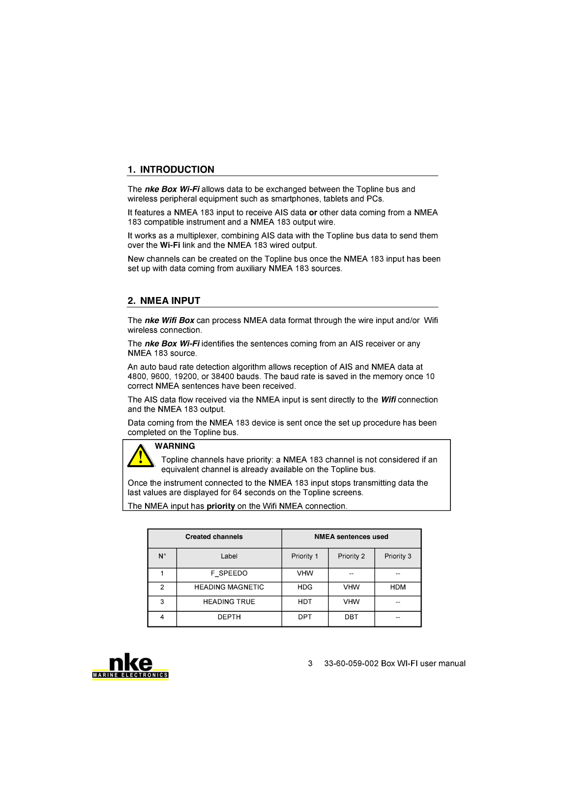 Zi de Kerandr Rue Gutemberg 56700 HENNEBONT part number AND INSTALLATION GUIDEuzd6f KMtwBE y hqSfsynJ4 user INPUTWIRED NMEA OUTPUTFI THE AWIFI CONNECTION TO DE FLUXBox user nke allows ta to be the Topline bus and wireless peripheral equipment such as smartphones tablets andIt features a NMEA 183input to receive AISdataother data coming from a NMEA compatible instrument and a NMEA 183 output wireIt works as a multiplexer combining AISdata with the Toplinebus data to send them over the link and the NMEA 183 wireoutputNew channels can be created on the Topline bus once the NMEA 183 input has been set up with data coming from auxiliary NMEA nkeWifi can process NMEA data format through the wire input andor Wifi wireless connectionThe nke identifies the sentences coming from an AIS receiver orany NMEA 183sourcen autobaudrate detection algorithm allows reception of AIS andNMEA data at 4800 9600 19200 or38400 baudsThe baudrate is saved in the memory once 10 correct NMEA sentences have been receivedThe AIS data flow received viahe NMEA input is sent directly to the Wificonnection and the NMEA 183 outputData coming from the NMEA 183device is sent once the set up procedure has been completed on the Topline have priorityNMEA 183channel is notconsidered if an equivalent channel is already available on the Topline busOnce the instrument connected to the NMEA 183input stops transmitting data the last values are displayed for64 seconds on the Topline screensThe NMEA input has prioriton thWifi channelsNMEA sentences user LOGVLWIP LOGVLWHOURS WIND WIND TO WPTBWCARING TO WPT TrueBWCCROSS TRACK OVER OVER GROUND rueVTGFORESTAY WIND TO WCVTARGET SPEEDKEPNEXT TACK TWAKEPTARGET VMGKEPPOLAR ANGLEKEPTARGET KEPTARGET VMGKEPBox user manualCURRENT NMEAOUTPUTThe NMEA 183wireoutput is set to 38400 bauds and sends AIS datafrom the NMEA 183 input and Topline data converted to NMEA standard sentences to instruments from other following data converted and sent via NMEA 183 depending on the relevant sensors being connected to the ANGLEDEPHTTRIP LOGTOTAL HEADINGTRUE AWA MAST user HEADINGCAP OVER GROUNDSPEED OVER GROUNDYEAR MONTHHOUR TRACK ERRORISTANCETO BEARING TO SPEEDNEXT TACK HEADINGOPTIMUM WIND ANGLETARGET ANGLETARGET CMGVMGOPTIMUM ANGLETARGET VMGCURRENT DIRECTIONSPEED CURRENTCURRENT DIRECTIONSPEED CURRENTMAN OVER BOARDBox user WiFi transmits the AISdata and the NMEAsentences coming from the NMEAinput as well as the NMEAdata from the ToplinebusIt can also forward NMEA data ie bearing and distance to waypoint the Topline bus providing the relevant channels are availabled to the NMEA outputThe nkecreatesa wireless access point 80211bg with the following 21xxxxxxxxxxx matching the serial number featured on the WiFi Boxlabel sticked on the side of the boxaddress 192168561Port 50000TCP a communication protocol which is based on connection with delivery validation and limits the use to one only hostwhile UDP uses a simple transmission model allowing communication with several hosts can connect up to hosts transmitted in NMEA 0183 format identical to the data output via the wire indicators show the operation status of the Status user the InitkeyKey press audible InOff no data coming in the after each valid NMEAsentence after each nonvalid NMEA sentence receivedNMEA OutFlashes after each valid NMEA sentence sent on the wired NMEA quickly if its quickly if its Topline addrelight data bus Toplinewire is disconnected or no masterFlashes every second interfaceand data bus Topline wire is disconnected or no masterSING and hold1 secto display the number of connected devices up to 5 1 device is indicated by the Topline led lighting red 2 devices by the Topline and NMEA Out 3 devices by the Topline NMEA Out NMEA In devices by Topline NMEA Out NMEA In Wifi and 5 devices by all led indicators in red Press and hold3 secfollowed byOFF and ON to reset all NMEA and holdsec will initialise the NMEA input wire and WiFilisten to NMEA sentences for10 seconds and then create list and nodes for the Topline bus only slavePress and hold 6 sec will launch a second NMEA initialisation and add NMEA channelwithout overwriting the existing table With this function you can add NMEA channels coming from the WiFi connection without editing the configuration of the wired NMEA inputPress and hold9 secto perform a full reset and return to factory settings Box user box with NMEAconnection 90Before WiFiis protected from must be mounted in a location wherethere is no risk of connection of the mustcarried out before power to the unit is switched onConnection to the Run the nke cable to the box your systemConnect the bus cable in the junction boxConnect the to your NMEA 183device or AIS Box user manualShould you need to shorten the bus cable uncover and tin the wires before connecting in the junction boxWire colour codeswire white NMEAinputNMEA NMEAinput NMEAdata coming from an AIS receiver donot need NMEA input calibration It will be directly echoed on the and wired be setup to identify and save the NMEA sentences received from the connected instrumentGPS PC etc channels are created and supply 12VdcJunction box9060417DATA black12VDC TO TOPLINE BUSInstrument with NMEAor wireGreen wireNMEA NMEA Wire NMEA 183 OutputTo Topline busRed Box user manualsaved in the nke memory They will remain on the Toplinebus each time the system is turned onSetup proceEnsure that the NMEA 183connected instrument sends data and press until you hear 3psThe NMEA 183input port will scan for NMEA 183data This is acknowledged by audible signals over10 seconds and a long signal once the scan is completedOnce the scan search is completed the unit will sound one signal per channel which habeen created on the there is no NMEA data coming this procduregives a slave address to the nke In thcase the Interface is considered as a slave unit by the SET A WIFI CONNECTION TO A device to the WiFinetwork and use the data coming from your theWiFi function on your DKNrgk7 S8LTWBHLlwlwpr BFjuakqDLOnzy Box use