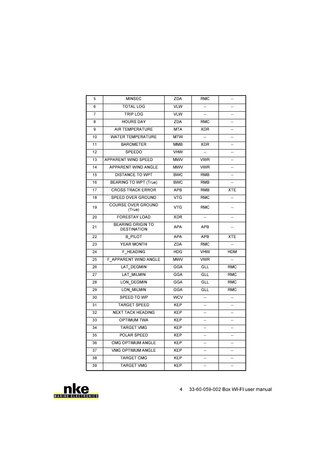 Zi de Kerandr Rue Gutemberg 56700 HENNEBONT part number AND INSTALLATION GUIDEuzd6f KMtwBE y hqSfsynJ4 user INPUTWIRED NMEA OUTPUTFI THE AWIFI CONNECTION TO DE FLUXBox user nke allows ta to be the Topline bus and wireless peripheral equipment such as smartphones tablets andIt features a NMEA 183input to receive AISdataother data coming from a NMEA compatible instrument and a NMEA 183 output wireIt works as a multiplexer combining AISdata with the Toplinebus data to send them over the link and the NMEA 183 wireoutputNew channels can be created on the Topline bus once the NMEA 183 input has been set up with data coming from auxiliary NMEA nkeWifi can process NMEA data format through the wire input andor Wifi wireless connectionThe nke identifies the sentences coming from an AIS receiver orany NMEA 183sourcen autobaudrate detection algorithm allows reception of AIS andNMEA data at 4800 9600 19200 or38400 baudsThe baudrate is saved in the memory once 10 correct NMEA sentences have been receivedThe AIS data flow received viahe NMEA input is sent directly to the Wificonnection and the NMEA 183 outputData coming from the NMEA 183device is sent once the set up procedure has been completed on the Topline have priorityNMEA 183channel is notconsidered if an equivalent channel is already available on the Topline busOnce the instrument connected to the NMEA 183input stops transmitting data the last values are displayed for64 seconds on the Topline screensThe NMEA input has prioriton thWifi channelsNMEA sentences user LOGVLWIP LOGVLWHOURS WIND WIND TO WPTBWCARING TO WPT TrueBWCCROSS TRACK OVER OVER GROUND rueVTGFORESTAY WIND TO WCVTARGET SPEEDKEPNEXT TACK TWAKEPTARGET VMGKEPPOLAR ANGLEKEPTARGET KEPTARGET VMGKEPBox user manualCURRENT NMEAOUTPUTThe NMEA 183wireoutput is set to 38400 bauds and sends AIS datafrom the NMEA 183 input and Topline data converted to NMEA standard sentences to instruments from other following data converted and sent via NMEA 183 depending on the relevant sensors being connected to the ANGLEDEPHTTRIP LOGTOTAL HEADINGTRUE AWA MAST user HEADINGCAP OVER GROUNDSPEED OVER GROUNDYEAR MONTHHOUR TRACK ERRORISTANCETO BEARING TO SPEEDNEXT TACK HEADINGOPTIMUM WIND ANGLETARGET ANGLETARGET CMGVMGOPTIMUM ANGLETARGET VMGCURRENT DIRECTIONSPEED CURRENTCURRENT DIRECTIONSPEED CURRENTMAN OVER BOARDBox user WiFi transmits the AISdata and the NMEAsentences coming from the NMEAinput as well as the NMEAdata from the ToplinebusIt can also forward NMEA data ie bearing and distance to waypoint the Topline bus providing the relevant channels are availabled to the NMEA outputThe nkecreatesa wireless access point 80211bg with the following 21xxxxxxxxxxx matching the serial number featured on the WiFi Boxlabel sticked on the side of the boxaddress 192168561Port 50000TCP a communication protocol which is based on connection with delivery validation and limits the use to one only hostwhile UDP uses a simple transmission model allowing communication with several hosts can connect up to hosts transmitted in NMEA 0183 format identical to the data output via the wire indicators show the operation status of the Status user the InitkeyKey press audible InOff no data coming in the after each valid NMEAsentence after each nonvalid NMEA sentence receivedNMEA OutFlashes after each valid NMEA sentence sent on the wired NMEA quickly if its quickly if its Topline addrelight data bus Toplinewire is disconnected or no masterFlashes every second interfaceand data bus Topline wire is disconnected or no masterSING and hold1 secto display the number of connected devices up to 5 1 device is indicated by the Topline led lighting red 2 devices by the Topline and NMEA Out 3 devices by the Topline NMEA Out NMEA In devices by Topline NMEA Out NMEA In Wifi and 5 devices by all led indicators in red Press and hold3 secfollowed byOFF and ON to reset all NMEA and holdsec will initialise the NMEA input wire and WiFilisten to NMEA sentences for10 seconds and then create list and nodes for the Topline bus only slavePress and hold 6 sec will launch a second NMEA initialisation and add NMEA channelwithout overwriting the existing table With this function you can add NMEA channels coming from the WiFi connection without editing the configuration of the wired NMEA inputPress and hold9 secto perform a full reset and return to factory settings Box user box with NMEAconnection 90Before WiFiis protected from must be mounted in a location wherethere is no risk of connection of the mustcarried out before power to the unit is switched onConnection to the Run the nke cable to the box your systemConnect the bus cable in the junction boxConnect the to your NMEA 183device or AIS Box user manualShould you need to shorten the bus cable uncover and tin the wires before connecting in the junction boxWire colour codeswire white NMEAinputNMEA NMEAinput NMEAdata coming from an AIS receiver donot need NMEA input calibration It will be directly echoed on the and wired be setup to identify and save the NMEA sentences received from the connected instrumentGPS PC etc channels are created and supply 12VdcJunction box9060417DATA black12VDC TO TOPLINE BUSInstrument with NMEAor wireGreen wireNMEA NMEA Wire NMEA 183 OutputTo Topline busRed Box user manualsaved in the nke memory They will remain on the Toplinebus each time the system is turned onSetup proceEnsure that the NMEA 183connected instrument sends data and press until you hear 3psThe NMEA 183input port will scan for NMEA 183data This is acknowledged by audible signals over10 seconds and a long signal once the scan is completedOnce the scan search is completed the unit will sound one signal per channel which habeen created on the there is no NMEA data coming this procduregives a slave address to the nke In thcase the Interface is considered as a slave unit by the SET A WIFI CONNECTION TO A device to the WiFinetwork and use the data coming from your theWiFi function on your DKNrgk7 S8LTWBHLlwlwpr BFjuakqDLOnzy Box use