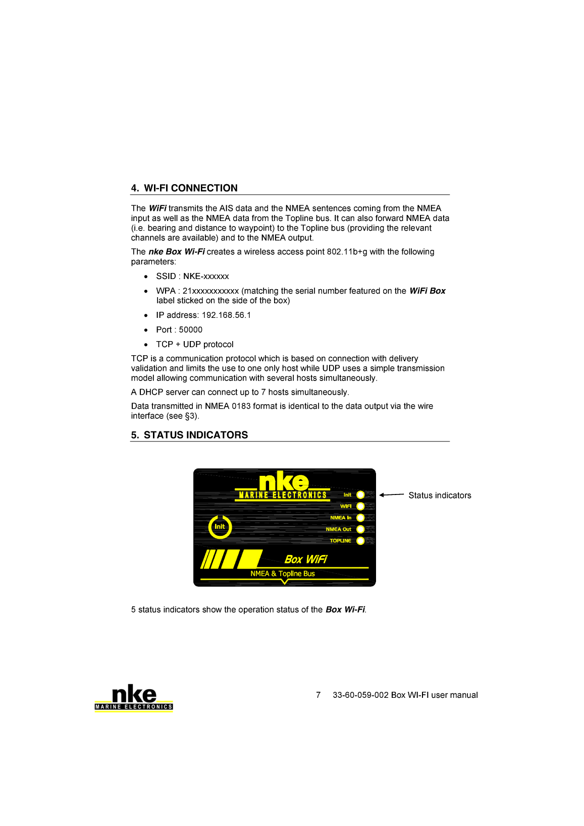 Zi de Kerandr Rue Gutemberg 56700 HENNEBONT part number AND INSTALLATION GUIDEuzd6f KMtwBE y hqSfsynJ4 user INPUTWIRED NMEA OUTPUTFI THE AWIFI CONNECTION TO DE FLUXBox user nke allows ta to be the Topline bus and wireless peripheral equipment such as smartphones tablets andIt features a NMEA 183input to receive AISdataother data coming from a NMEA compatible instrument and a NMEA 183 output wireIt works as a multiplexer combining AISdata with the Toplinebus data to send them over the link and the NMEA 183 wireoutputNew channels can be created on the Topline bus once the NMEA 183 input has been set up with data coming from auxiliary NMEA nkeWifi can process NMEA data format through the wire input andor Wifi wireless connectionThe nke identifies the sentences coming from an AIS receiver orany NMEA 183sourcen autobaudrate detection algorithm allows reception of AIS andNMEA data at 4800 9600 19200 or38400 baudsThe baudrate is saved in the memory once 10 correct NMEA sentences have been receivedThe AIS data flow received viahe NMEA input is sent directly to the Wificonnection and the NMEA 183 outputData coming from the NMEA 183device is sent once the set up procedure has been completed on the Topline have priorityNMEA 183channel is notconsidered if an equivalent channel is already available on the Topline busOnce the instrument connected to the NMEA 183input stops transmitting data the last values are displayed for64 seconds on the Topline screensThe NMEA input has prioriton thWifi channelsNMEA sentences user LOGVLWIP LOGVLWHOURS WIND WIND TO WPTBWCARING TO WPT TrueBWCCROSS TRACK OVER OVER GROUND rueVTGFORESTAY WIND TO WCVTARGET SPEEDKEPNEXT TACK TWAKEPTARGET VMGKEPPOLAR ANGLEKEPTARGET KEPTARGET VMGKEPBox user manualCURRENT NMEAOUTPUTThe NMEA 183wireoutput is set to 38400 bauds and sends AIS datafrom the NMEA 183 input and Topline data converted to NMEA standard sentences to instruments from other following data converted and sent via NMEA 183 depending on the relevant sensors being connected to the ANGLEDEPHTTRIP LOGTOTAL HEADINGTRUE AWA MAST user HEADINGCAP OVER GROUNDSPEED OVER GROUNDYEAR MONTHHOUR TRACK ERRORISTANCETO BEARING TO SPEEDNEXT TACK HEADINGOPTIMUM WIND ANGLETARGET ANGLETARGET CMGVMGOPTIMUM ANGLETARGET VMGCURRENT DIRECTIONSPEED CURRENTCURRENT DIRECTIONSPEED CURRENTMAN OVER BOARDBox user WiFi transmits the AISdata and the NMEAsentences coming from the NMEAinput as well as the NMEAdata from the ToplinebusIt can also forward NMEA data ie bearing and distance to waypoint the Topline bus providing the relevant channels are availabled to the NMEA outputThe nkecreatesa wireless access point 80211bg with the following 21xxxxxxxxxxx matching the serial number featured on the WiFi Boxlabel sticked on the side of the boxaddress 192168561Port 50000TCP a communication protocol which is based on connection with delivery validation and limits the use to one only hostwhile UDP uses a simple transmission model allowing communication with several hosts can connect up to hosts transmitted in NMEA 0183 format identical to the data output via the wire indicators show the operation status of the Status user the InitkeyKey press audible InOff no data coming in the after each valid NMEAsentence after each nonvalid NMEA sentence receivedNMEA OutFlashes after each valid NMEA sentence sent on the wired NMEA quickly if its quickly if its Topline addrelight data bus Toplinewire is disconnected or no masterFlashes every second interfaceand data bus Topline wire is disconnected or no masterSING and hold1 secto display the number of connected devices up to 5 1 device is indicated by the Topline led lighting red 2 devices by the Topline and NMEA Out 3 devices by the Topline NMEA Out NMEA In devices by Topline NMEA Out NMEA In Wifi and 5 devices by all led indicators in red Press and hold3 secfollowed byOFF and ON to reset all NMEA and holdsec will initialise the NMEA input wire and WiFilisten to NMEA sentences for10 seconds and then create list and nodes for the Topline bus only slavePress and hold 6 sec will launch a second NMEA initialisation and add NMEA channelwithout overwriting the existing table With this function you can add NMEA channels coming from the WiFi connection without editing the configuration of the wired NMEA inputPress and hold9 secto perform a full reset and return to factory settings Box user box with NMEAconnection 90Before WiFiis protected from must be mounted in a location wherethere is no risk of connection of the mustcarried out before power to the unit is switched onConnection to the Run the nke cable to the box your systemConnect the bus cable in the junction boxConnect the to your NMEA 183device or AIS Box user manualShould you need to shorten the bus cable uncover and tin the wires before connecting in the junction boxWire colour codeswire white NMEAinputNMEA NMEAinput NMEAdata coming from an AIS receiver donot need NMEA input calibration It will be directly echoed on the and wired be setup to identify and save the NMEA sentences received from the connected instrumentGPS PC etc channels are created and supply 12VdcJunction box9060417DATA black12VDC TO TOPLINE BUSInstrument with NMEAor wireGreen wireNMEA NMEA Wire NMEA 183 OutputTo Topline busRed Box user manualsaved in the nke memory They will remain on the Toplinebus each time the system is turned onSetup proceEnsure that the NMEA 183connected instrument sends data and press until you hear 3psThe NMEA 183input port will scan for NMEA 183data This is acknowledged by audible signals over10 seconds and a long signal once the scan is completedOnce the scan search is completed the unit will sound one signal per channel which habeen created on the there is no NMEA data coming this procduregives a slave address to the nke In thcase the Interface is considered as a slave unit by the SET A WIFI CONNECTION TO A device to the WiFinetwork and use the data coming from your theWiFi function on your DKNrgk7 S8LTWBHLlwlwpr BFjuakqDLOnzy Box use