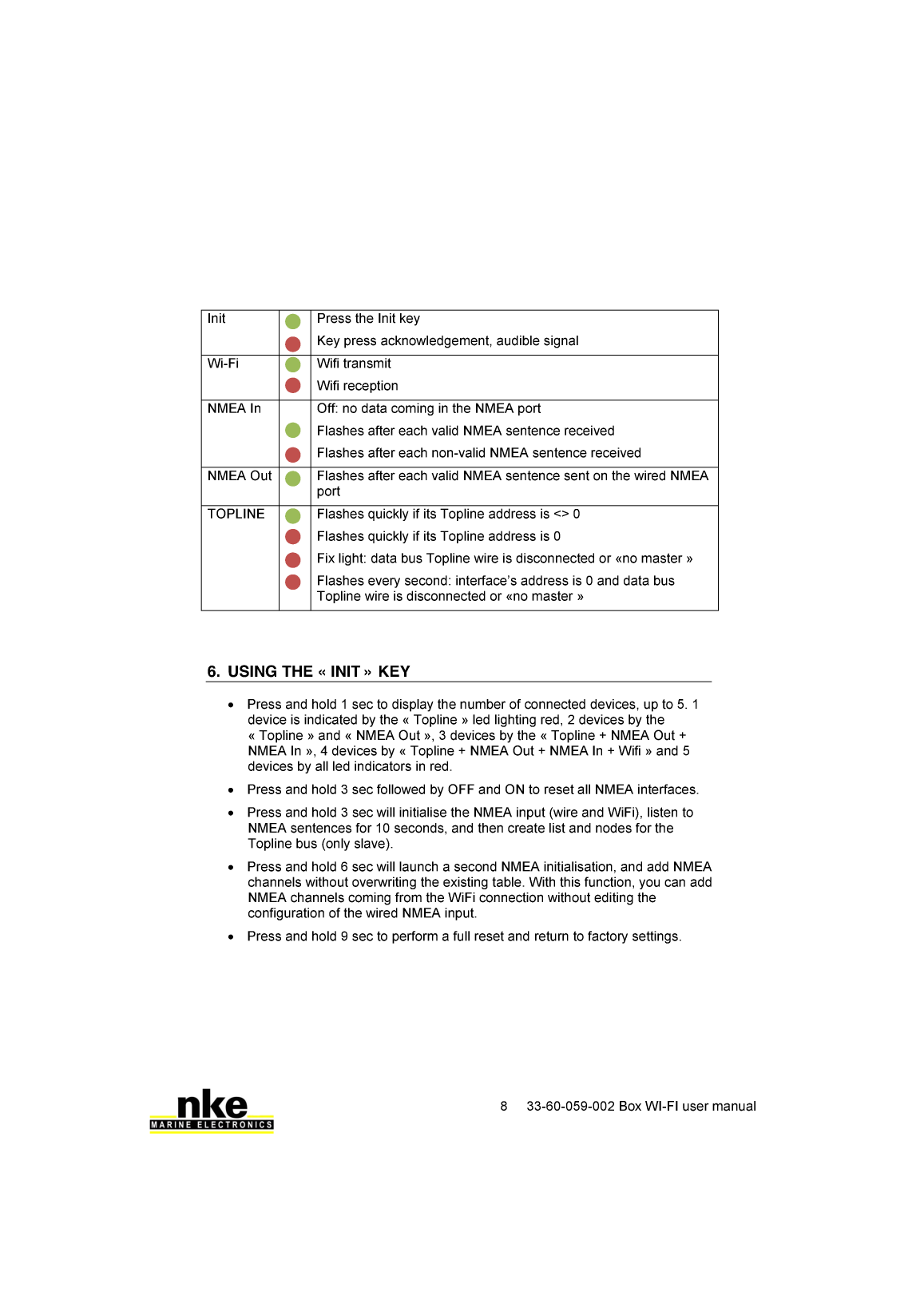 Zi de Kerandr Rue Gutemberg 56700 HENNEBONT part number AND INSTALLATION GUIDEuzd6f KMtwBE y hqSfsynJ4 user INPUTWIRED NMEA OUTPUTFI THE AWIFI CONNECTION TO DE FLUXBox user nke allows ta to be the Topline bus and wireless peripheral equipment such as smartphones tablets andIt features a NMEA 183input to receive AISdataother data coming from a NMEA compatible instrument and a NMEA 183 output wireIt works as a multiplexer combining AISdata with the Toplinebus data to send them over the link and the NMEA 183 wireoutputNew channels can be created on the Topline bus once the NMEA 183 input has been set up with data coming from auxiliary NMEA nkeWifi can process NMEA data format through the wire input andor Wifi wireless connectionThe nke identifies the sentences coming from an AIS receiver orany NMEA 183sourcen autobaudrate detection algorithm allows reception of AIS andNMEA data at 4800 9600 19200 or38400 baudsThe baudrate is saved in the memory once 10 correct NMEA sentences have been receivedThe AIS data flow received viahe NMEA input is sent directly to the Wificonnection and the NMEA 183 outputData coming from the NMEA 183device is sent once the set up procedure has been completed on the Topline have priorityNMEA 183channel is notconsidered if an equivalent channel is already available on the Topline busOnce the instrument connected to the NMEA 183input stops transmitting data the last values are displayed for64 seconds on the Topline screensThe NMEA input has prioriton thWifi channelsNMEA sentences user LOGVLWIP LOGVLWHOURS WIND WIND TO WPTBWCARING TO WPT TrueBWCCROSS TRACK OVER OVER GROUND rueVTGFORESTAY WIND TO WCVTARGET SPEEDKEPNEXT TACK TWAKEPTARGET VMGKEPPOLAR ANGLEKEPTARGET KEPTARGET VMGKEPBox user manualCURRENT NMEAOUTPUTThe NMEA 183wireoutput is set to 38400 bauds and sends AIS datafrom the NMEA 183 input and Topline data converted to NMEA standard sentences to instruments from other following data converted and sent via NMEA 183 depending on the relevant sensors being connected to the ANGLEDEPHTTRIP LOGTOTAL HEADINGTRUE AWA MAST user HEADINGCAP OVER GROUNDSPEED OVER GROUNDYEAR MONTHHOUR TRACK ERRORISTANCETO BEARING TO SPEEDNEXT TACK HEADINGOPTIMUM WIND ANGLETARGET ANGLETARGET CMGVMGOPTIMUM ANGLETARGET VMGCURRENT DIRECTIONSPEED CURRENTCURRENT DIRECTIONSPEED CURRENTMAN OVER BOARDBox user WiFi transmits the AISdata and the NMEAsentences coming from the NMEAinput as well as the NMEAdata from the ToplinebusIt can also forward NMEA data ie bearing and distance to waypoint the Topline bus providing the relevant channels are availabled to the NMEA outputThe nkecreatesa wireless access point 80211bg with the following 21xxxxxxxxxxx matching the serial number featured on the WiFi Boxlabel sticked on the side of the boxaddress 192168561Port 50000TCP a communication protocol which is based on connection with delivery validation and limits the use to one only hostwhile UDP uses a simple transmission model allowing communication with several hosts can connect up to hosts transmitted in NMEA 0183 format identical to the data output via the wire indicators show the operation status of the Status user the InitkeyKey press audible InOff no data coming in the after each valid NMEAsentence after each nonvalid NMEA sentence receivedNMEA OutFlashes after each valid NMEA sentence sent on the wired NMEA quickly if its quickly if its Topline addrelight data bus Toplinewire is disconnected or no masterFlashes every second interfaceand data bus Topline wire is disconnected or no masterSING and hold1 secto display the number of connected devices up to 5 1 device is indicated by the Topline led lighting red 2 devices by the Topline and NMEA Out 3 devices by the Topline NMEA Out NMEA In devices by Topline NMEA Out NMEA In Wifi and 5 devices by all led indicators in red Press and hold3 secfollowed byOFF and ON to reset all NMEA and holdsec will initialise the NMEA input wire and WiFilisten to NMEA sentences for10 seconds and then create list and nodes for the Topline bus only slavePress and hold 6 sec will launch a second NMEA initialisation and add NMEA channelwithout overwriting the existing table With this function you can add NMEA channels coming from the WiFi connection without editing the configuration of the wired NMEA inputPress and hold9 secto perform a full reset and return to factory settings Box user box with NMEAconnection 90Before WiFiis protected from must be mounted in a location wherethere is no risk of connection of the mustcarried out before power to the unit is switched onConnection to the Run the nke cable to the box your systemConnect the bus cable in the junction boxConnect the to your NMEA 183device or AIS Box user manualShould you need to shorten the bus cable uncover and tin the wires before connecting in the junction boxWire colour codeswire white NMEAinputNMEA NMEAinput NMEAdata coming from an AIS receiver donot need NMEA input calibration It will be directly echoed on the and wired be setup to identify and save the NMEA sentences received from the connected instrumentGPS PC etc channels are created and supply 12VdcJunction box9060417DATA black12VDC TO TOPLINE BUSInstrument with NMEAor wireGreen wireNMEA NMEA Wire NMEA 183 OutputTo Topline busRed Box user manualsaved in the nke memory They will remain on the Toplinebus each time the system is turned onSetup proceEnsure that the NMEA 183connected instrument sends data and press until you hear 3psThe NMEA 183input port will scan for NMEA 183data This is acknowledged by audible signals over10 seconds and a long signal once the scan is completedOnce the scan search is completed the unit will sound one signal per channel which habeen created on the there is no NMEA data coming this procduregives a slave address to the nke In thcase the Interface is considered as a slave unit by the SET A WIFI CONNECTION TO A device to the WiFinetwork and use the data coming from your theWiFi function on your DKNrgk7 S8LTWBHLlwlwpr BFjuakqDLOnzy Box use