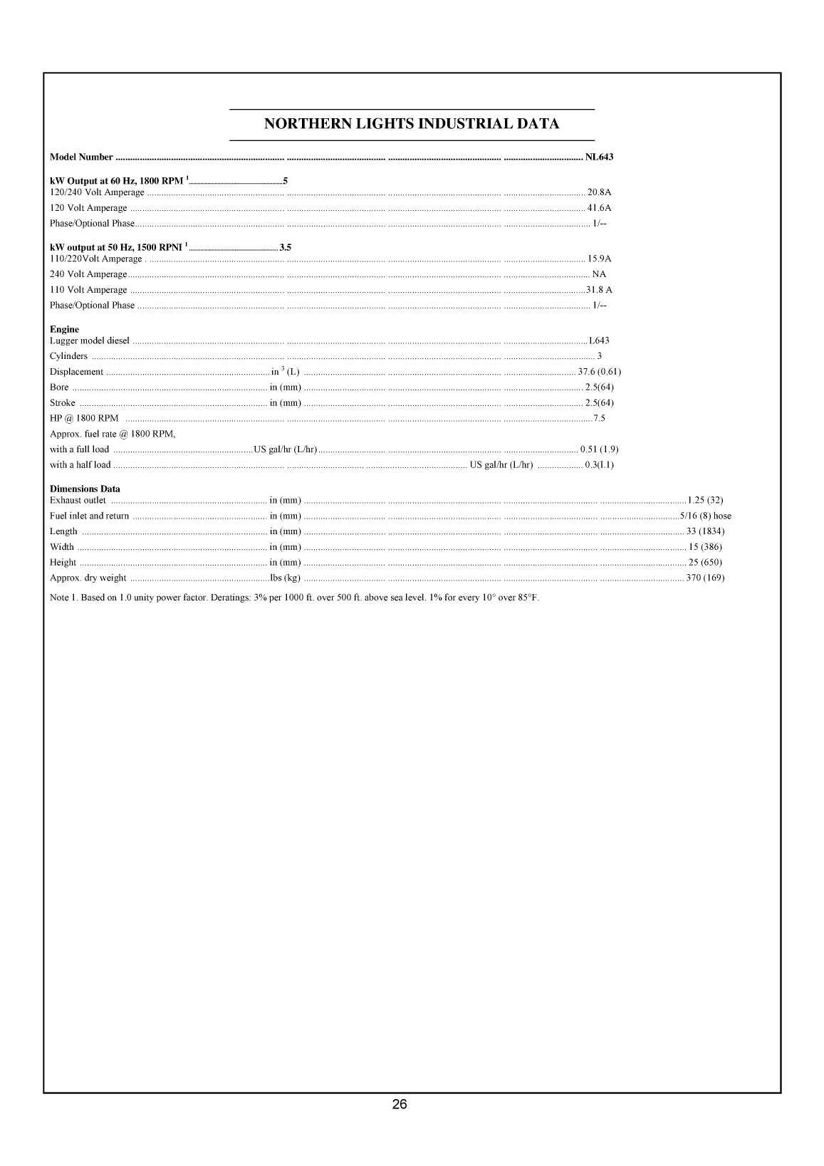 10101 1095 0101 M643M673 NL643 OPERATORS MANUAL Read this operators manual thoroughly before starting to operate your equipment This manual contains TABLE OF CONTENTS information you will need to run and service your new 2 Servicing continuedUnit Identification Fuel Filters 1314 Bleeding the Fuel System 14 Models Included 2 Injector Service 1416 Model Numbers 2 Injection Pump 16 Serial Numbers 2 Cooling System General 16Warranty 3 Cooling System Flushing 1617Safety Rules 3 Heat Exchanger Marine 17 Clean Radiator 17Component Locations Raw Water Pump Marine 17 M643 Marine Generator 4 Generator Ends 17 M673 Marine Generator 4 Electrical System General 17 NL643 NL673 Industrial Generators 5 Glow Plugs 1718Panels Booster Batteries 18 Battery Care 18 Northern Lights Generator Sets 67 Winterizing OutofService 18Operating Procedures AC Generator TFIII Breakin Period 8 General 19 Before Starting 8 Connections 2021 Starting 8 Operation 21 Operating 8 Maintenance 2123 Stopping 8 Shutdowns and Alarms 9 Spare Parts 9 Electrical 24Servicing Schedule Chart 1011 Engine 2425 Data Marine 26 Lubrication General 12 Industrial 27 Oil Changes 12 Changing Oil Filter 12 Wiring Diagrams Air Filter 12 DC Electrical 28 VBelts 1213 AC Electrical 29 Retightening Cylinder Head Bolts 13 Valve Clearances 13 Fuels General 13 0 of marine engines and generator sets presents must be adhered to more strictly Failures begin with minorunique problems In many cases boats cannot be moved to a problems that are overlooked and become amplified whenrepair facility Marine engines cannot be compared to the not corrected during routine maintenance As operator it isservicing of automobiles trucks or even farm equipment your obligation to learn about your equipment and its properFailures often occur in remote areas far from competent maintenance This is not a comprehensive technical Marine engines are taxed far more severely than manual Nor will it make the reader into an expert mechanicauto or truck engines therefore maintenance schedules Its aim is to aid you in maintaining your unit properly UNIT INCLUDEDThis manual covers operating instructions for M643 and M673 marine generator sets and NL643 industrial generator setMODEL NUMBERSModel numbers give units application block model aspiration and RPM MNL 643673 M Northern Lights marine generator set Model number of engine block Bore Cylinders NL Northern Lights industrial generator set 64mm 3 67mm 3 Northern Lights marine diesel generator set Northern Lights industrial diesel generator M 673 with a 673 engine TFIli18C generator end NL 643 set with a 643 engine TFlli18B generator and AVR end AVR and a radiator Northern Lights marine diesel generator set M 643 with a 643 engine TFIli18B generator end and AVRSERIAL NUMBERSYour set has three serial numbers an engine number stamped on the block a generator plate and a generator set plate Use the serial number on the generator set plate when ordering parts or in correspondence The generator set plate is found on the service side of the generator and resembles the drawing below 1 WARRANTY A warranty registration certificate is supplied with your set It entitles the original purchaser of our NOTE If the warranty is to apply the servicing equipment to a warranty covering material or assembly instructions outlined in this manual must be faults The extent of coverage is described in the followed If further information is needed please Limited Warranty Statement We recommend that you contact an authorized dealer or the factory study the statement carefully SAFETY RULES Avoid wearing loose clothing without a belt when CAUTION Accident reports show that careless use of working around engines Do not oil or grease engine while it is runningengines causes a high percentage of accidents You can Use caution in handling fuel Never refuel a hot oravoid accidents by observing these safety rules Study theserules carefully and enforce them on the job running engine Do not smoke while filling fuel tank or servicing fuel system Never leave engine without proper security Keep your hands feet hair and clothing away Turn the coolant tank cap slowly to relieve pressure from powerdriven parts before removing Add coolant only when the Check for any loose electrical connections or faulty engine is stopped and cool wiring Mount a fire extinguisher near engine Engines should be operated only by Always disconnect the battery ground strap before knowledgeable qualified personnel making adjustments Look completely around engine to make sure that Operate engines in properly ventilated areas everything is dear before starting Keep trash and other objects away from engine Do not operate an engine that isnt in proper Escaping fluids under pressure can penetrate your working order If an unsafe operating condition is skin Use a piece of cardboard or wood not your noted tag the set and control panel so others will hands to search for leaks also know about the problem Provide first aid kits CAUTION This symbol is used throughout this book to alert you to possible danger areas Please take special notice of these sections 2 M643 AND M673 COMPONENT 1 Service side1 Generator End Cover 7 Lube Oil Fill 14 Secondary Fuel Filter 21 Starter Motor Remove for Brush Access 8 Lube Oil Dipstick 15 Generator Control Box 22 DC Alternator2 Base and Drip Pan 9 Block Drain 16 Air Filter Housing 23 Heat Exchanger End Cap3 Fuel Injection Pump 10 Lube Oil Filter 17 Lube Oil Fill 24 Heat Exchange r4 Belt Guard 11 Fuel Lift Pump 18 Fuel Injector Expansion TankExhaust5 Seawater Pump 12 Fuel Inlet and Return 19 Coolant Fill Manifold6 Lube Oil Drain 13 Control Panel Plugin 20 DC Regulator 25 Wet Exhaust Elbow 26 Manifold Drain 3 NL643 COMPONENT LOCATIONFigure 21 DC Alternator 6 Bleed Screw 11 Lube Oil Filter 16 Air Filter2 Muffler Exhaust Outlet 7 Fuel Injection Pump 12 Fuel Lift Pump 17 Lube Oil Fill3 Starter 8 Block Water Drain 13 Fuel Inlet and Return 18 Fuel Injector4 Power Cable Outlet 9 Lube Oil Drain