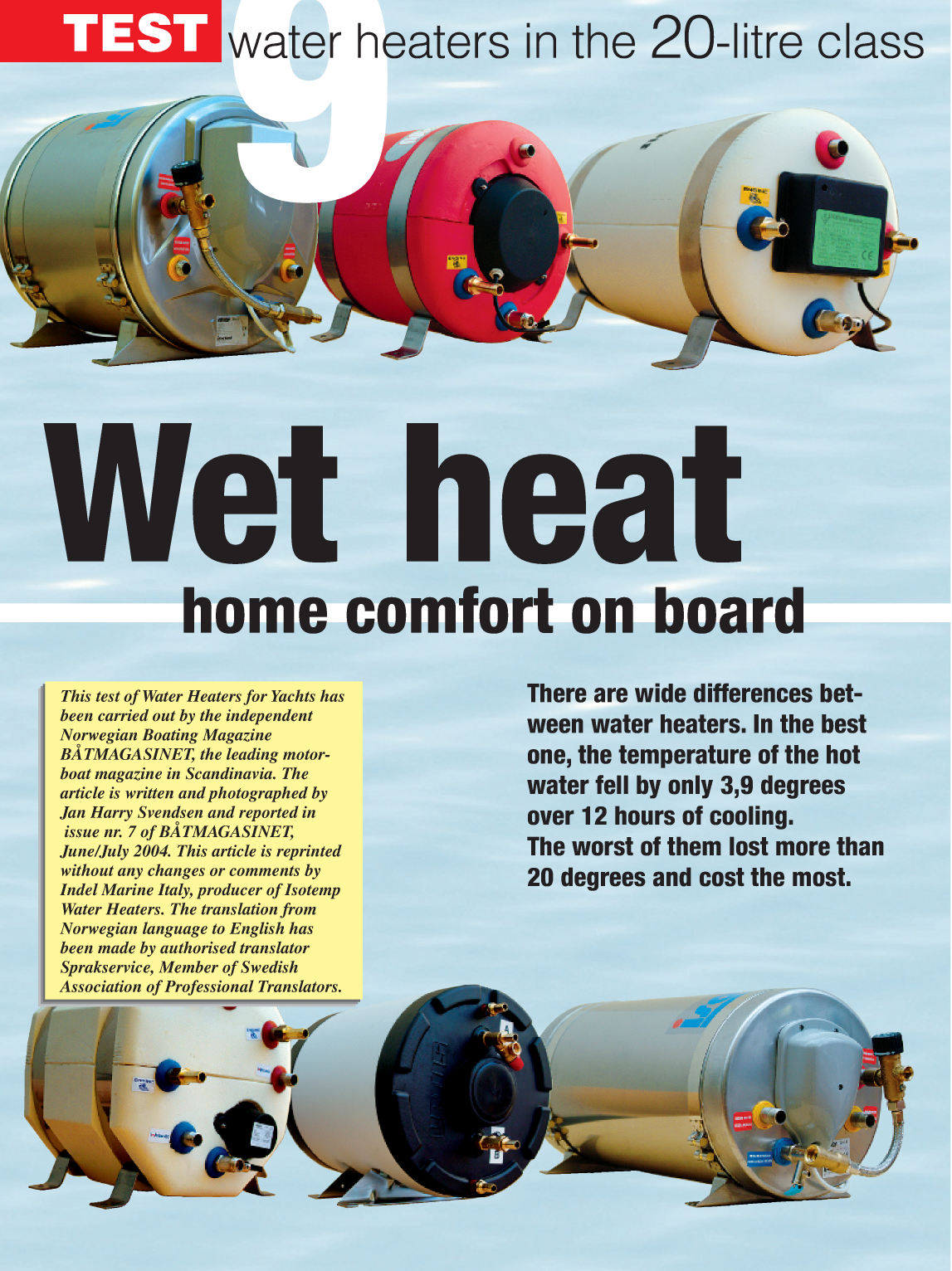 TEST water heaters in the 20litre classWet heat home comfort on boardThis test of Water Heaters for Yachts has There are wide differences betbeen carried out by the Boating Magazine ween water heaters In the the leading motor one the temperature of the hotboat magazine in Scandinavia Thearticle is written and photographed by water fell by only 39 degreesJan Harry Svendsen and reported in over 12 hours of cooling issue nr 7 of 2004 This article is reprinted The worst of them lost more thanwithout any changes or comments byIndel Marine Italy producer of Isotemp 20 degrees and cost the mostWater Heaters The translation fromNorwegian language to English hasbeen made by authorised Member of of Professional water heaters in the 20litre classT he difference between a warm pleas COOLANT AS HEAT SOURCE drawback of this solution is that the tank is ant shower and a cold shower that Most of the water heaters in the test have heavy It weighs as much as 23 kilograms makes you shiver is no more than 135 the same basic design idea An insulated tankdegrees an hour While the Isotemp Basic has is connected to the boats freshwater system ISOTEMP GOODa heat loss of only 033 degrees an hour over and the engine cooling system The engine WEBASTO hours the Sigmar Thermoinox loses as coolant is conveyed through a heat exchang The ATI BB 2212 had the highest temmuch as 168 degrees However the Sigmar er inside the tank and heats up the water perature after one hour of heating using theis not the overall loser in the test It redeems Most of the tanks are additionally supplied heat exchanger 688 degrees Thats moreitself by having a slightly higher tempera with a heating element which makes it possi than 20 degrees warmer than the Mobithermture after the heating cycle has ended than ble to heat up water from the shore power MWH020 and the QL WaterHeater withthe Webasto which does not manage to sup supply 482 and 485 degrees respectively The picply a drop of water over 40 degrees after a Vetus has chosen a different solution ture changes when we have left the watercooling period of 12 hours with two tanks one inside the other The heaters standing for twelve hours without freshwater is in the inner tank while the en heating Then the Vetus provides the hottest gine coolant circulates in the outer tank The water at 552 degrees while the WebastoTO ENSURE THAT the test results were repeatable and that the tanks operated in they were tested on the bench Here the tank of the Vetus is connected20L does not manage to supply water a valve it is possible to choose to add coldwarmer than 399 degrees The limit for a water to the hot water drained from thecomfortable shower temperature is around heater Better use is made of the hot water40 degrees in this way What is of greatest interest however is Another advantage is that using thishow many litres of water over 40 degrees valve it is possible to adjust how hot waterthe heaters manage to supply after 12 hours the heater is to deliver This reduces the danof cooling ger of burns particularly if there are youngHere the Isotemp Basic is in a class of its children on boardown From its 24 litre tank it supplies asmuch as 23 litres of water at a temperature CHECK OUTPUTabove 40 degrees The Vetus is also good All the water heaters in the test with the THE TANKS were taken apart so that wewith 17 litres from a 20 litre tank The exception of the Vetus were equipped with a could study their Slim 20 and Quick Nautic Boiler heating element as standard Connecting thedeliver 15 litres The Sigmar Thermionox hotwater tank to the boats shore power sysand the ATI BB 2212 are disappointing tem ensures that there is also hot water when SAFETY THERMOSTAT FAILEDwith nine and eight litres respectively Both the boat is moored With a builtin thermostat All the heating elements are equipped with ahave a capacity of 22 litres By far the worst the efficiency of the hotwater tank is like at thermostat and in the vast majority of casesis the Webasto It does not manage to deliv home Most of the tanks in the test have heat these are adjustable The exception is theer so much as a drop of water above 40 de ing elements that deliver around 800 Watts Isotemp which has a thermostat fixed at 75grees after 12 hours The exception is the ATI which has a 1500 degrees For the water heaters from Sigmar Watt element It is basically a good one but Mobitherm QL and Webasto the temperature MIXER VALVE IS USEFUL the drawback is that most shore power sys was a few degrees above the value at which Part of the secret behind the good re tems have many users connected to the same the thermostat was set while the rest of thesults achieved by the Isotemp is the mixer outlet Too high a wattage in the element may tanks were a few degrees below the set temvalve Both the Isotemp Slim 20 and the therefore lead to the fuse in the shore power Basic have this as standard Using system blowing All the thermostats are additionally DRAIN The tank of the Vetus is drained SMALL SLEEVE COUPLING The tank is drained by unscrewing a plastic lid This solution via the small sleeve coupling Not only does this will result in wastewater when the tank take a long time it is also difficult to attach a hose has to be drained to the sleeve couplingSAFETY THERMOSTAT The Isotemp isthe only water heater in the test with asafety thermostat that works on boilingdry The blue box is the safety thermostat while the operating thermostat THERMOSTAT All the water heaters in MIXER VALVE The tanks from Isotemp have a miis the white box the test with the exception of the xer valve as standard The temperature of the wa Isotemp have an adjustable thermostat ter to be supplied by the heater is set here Cold However the safety thermostat failed on water is mixed in with the hot water to attain the all the thermostats correct with a safety thermostat This is in six bar The deviations between specified and heavy Vetus charge no less than NOKtended to trip if the water heater is swit