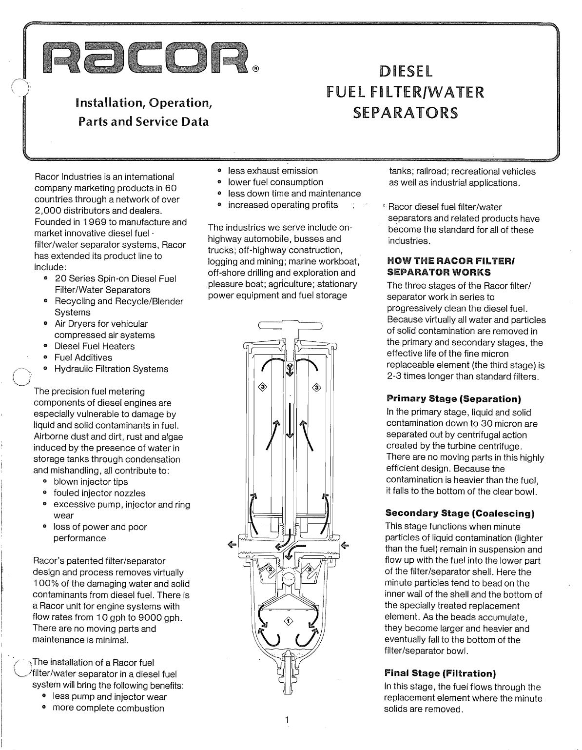 Dand Service Industries is countries through a market innovative diesel fuel filterlwater separator systems its product Series Spinon Diesel Fuel Recycling and Diesel Fuel Heaters Fuel Additives Hydraulic Filtration Systems precision fuel metering diesel engines liquid and solid contaminants dirt rust and algae the presence of water storage tanks through condensation and mishandling contribute to blown injector tips fouled injector nozzles excessive pump injector patented from diesel fuel There is for engine systems with flow rates from There are no moving parts installation of Racor fuel a diesel fuel following benefits pump and more complete combustion less exhaust lower fuel consumption less down time and increased operating profits serve include highway automobile trucks offhighway construction mining marine drilling and pleasure boat agriculture stationary fuel storage tanks railroad recreational vehicles related products become the standard for all of three stages separator work diesel fuel contamination are secondary stages the effective life the fine replaceable element the stageis times longer than standard Stage liquid separated out by centrifugal action the turbine centrifuge There are this highly efficient design Because contamination is heavier the fuel the bottom of the Stage functions when the fuelsuspension and flow up with the fuel into lower part the shell bead on the shell and the specially treated replacement the beads they become heavier and eventually fall to the bottom bowl this stage replacement element where the minute Replacement Elements other than bracket kits installing Racor mounting bracket specifically designed for the year make and automobile and the necessary with complete instructions for Remove vacuum side filters between fuel tank and Castinhead or housing should adapted with adaptor Racor no 1 1 vert on the the fuel or transfer comes first a convenient location for servicing from fuel Racor Filter1 Separator USE MAXIMUM FUEL AVAILABLE IN REDUCE RESTRICTION Appropriate fittings from your distributor See fuel line from the outlet side inlet of the fuel with appropriate fittings size fuel and prime the system pouring clean fuel housing until full Replace and hand tighten thandle test system Locate the between the the bottom of the fuel tank and not remove the lid not overtorque the clearance above the elements See OVERHEAD STORAGE pressure will placed on the when it is conjunction with overhead storage tank A be installed on the for use servicing replaceable elements is used weather the unit should be located behind the engine in engine near manifold flow is unit A Racor Thermoline Diesel Fuel Line Heater is for efficient cold weather operation ethanol and based additives will cause nonmetal parts the entire diesel engine system additive is determined necessary use only ADDITIVES RACOR provide preventive weather starts against damaging element life with engines fuel filters They contain no best possible condition for COMPARE TREATMENT COST manufactures a complete replacement elements for genuine Racor replacement elements Additives for maximum water and perform the ultrafine filtration to protect exclusive lip seal prevent element bypass a molded element removal should be changed Mercury restriction 1 1 made at Series models with valves are in the open position for continuous operation one unit be shut down while change element change reduce fuel flow idle condition lid Inspect holding molded handle and with a turning motion over center tube with downward turning motion See for replacement number on Top off by pouring clean diesel fuel housing until full and hand drained at or before reach the bottom turbine centrifuge options for 1 3 for description fuel tank lid Inspect Open drain valve accumulated water and drain valve installing fittings to the the fitting the system with diesel fuel into LUBRICATE ALL housing until full SEALS BEFORE bowl gasket hand tighten thandle CLEAN DIESEL on base put lid Inspect drain valve and contamination inch Ibs discard replaceable Ibs drain valve Replace element new Genuine unit completely through Replacement Element Remove drain valve the system by Flush unit with clean diesel fuel diesel fuel into the until full INSPECT ALL amount of is present in the inlet side wetting gasket with Normal vacuum depending on the hose from tank should be clean element where capacity is dictated by Hg after element for the following collapsed fuel lines plugged fuel lines loose fittings pin holes stand pipe fuel condition improper flare angles on no bubbles suction is still evident side of loose fittings pin holes improper flare angles on the inlet drain valve and blow In case gaskets on pages remove clean with compressed flared female hose fitting pulled fitting sometimes causes a line crack resulting for sight glasses to check If air is sucking centrifuge action fitting gasket or the clear is between the bleeds leak or seating problem is indicated seat remove bowl ring bowl turbine centrifuge tur See for identification of partsseat and stall centrifuge tightening causes gasket bowl ring gasket unit with fuel weather operation Fuel Heater in the is recommended Heater is weather operations See Options your Racor Parts List Bracket Kits A complete line mounting bracket kits installing Racor on automobiles They contain mounting bracket specifically designed the year make and the necessary hardware with complete mounting instructions for Part No 1 12041 1 Flow Director Bowl 0Ring Lid 0Ring Lid 0Ring Retainer Clamp Back View 1 11780 4 15011 1 7 15009 1 9 15079 1 15005 1 15078 1 11350 1 11888 1 15082 1 15081 4 Drain Gasket Turbine Centrifuge Conical Baffle order model Parts Diagram uous operation dual Model 4 Elbow Parts List Part No Top View Bracket Assembly 1 Bowl 1 Double Parts Diagram Parts Diagram Parts List 1 Drain 2 3 11 041 1 Conical 14 UNF Drain Valve Drain Gasket Mounting Hole Bowl Ring Outer Cylinder Outer Cylinder order model Bac