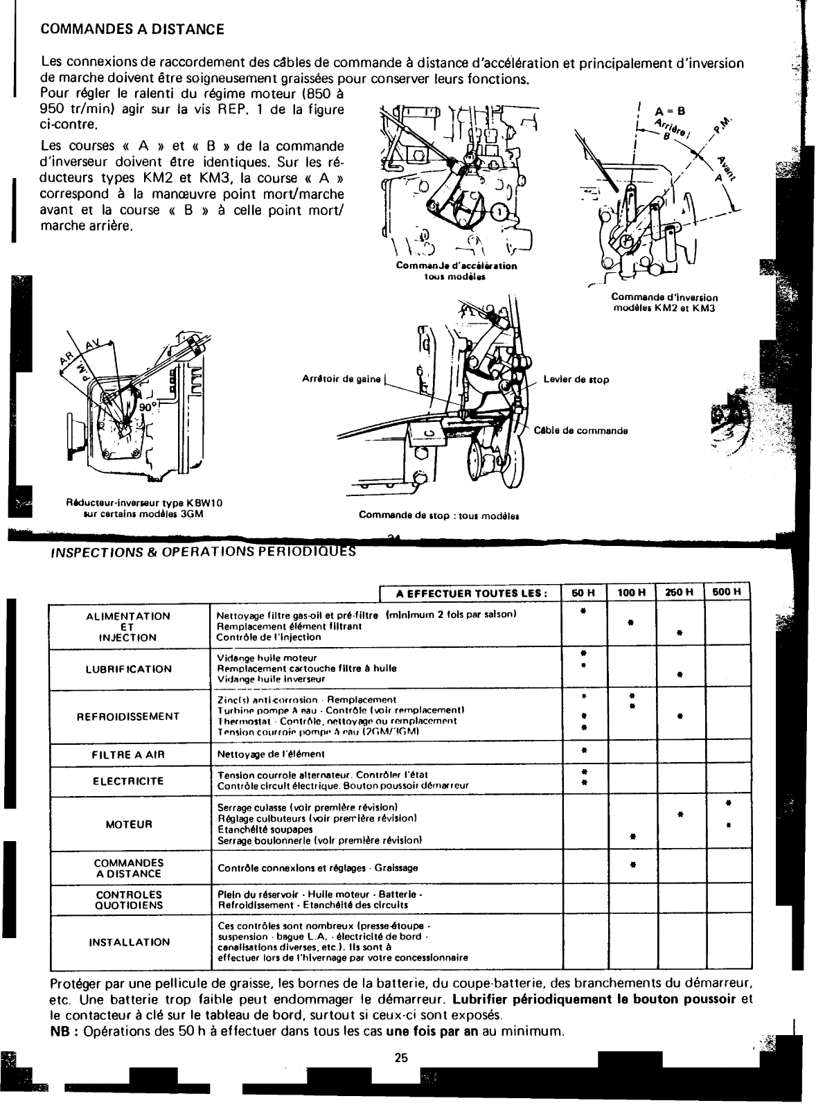 TABLE DES MATIERES 3 Identification 4et 5 Nomenclature 6 et 7 Installation 8 et 10 9Courbes consommations et puissances 11 M Iseenrout e 12 Enroute 13et 14 Arrt moteur 15 16 D Dmarragemanuel d marrages 1ff ICI 1 es 16 1 1 b f t ge etc 17 23 d 24 u ri Ica Ionpur Commandes Istance d 25 Inspections et op ratlonsp rio Iques 26 27 Hivernage Circuits combustible huileeau 28 Schmacblage1 et2GM 29 Schma cblage 3GM 30 i Modles 1GM10 2GM20 3GM30 Type Diesel4 temps Vertical Injection indirecte Alsagex Course 75 x 72 mm Nombrede cylindre 1 2 3 Cylindre 318 cm3 636 cmJ 954 cm3 PuissanceRgime DIN B 9 ch3 600 trmin 18 ch3 600 trmin 27 ch3600 trmin Lubrification Forcepar pompe huile Direct eaude mer Thermostat Dmarrage lectrique 12 V 1 kW Dmarrage auxiliaire Par lanceur manivelle lavant Dcompresseur Recharge batterie alternateur 12 V 35 A 12 V55 A Sensrotation moteur A droite vu de avant Sensrotation hlice A droite vu de larrire J Type KM2 Type KM3 Rapport de rduction 22 1 236 1 Rgime hlice 1 636 trmin 1 525 Poids sec 76 kg 106 kg 130 kg 3 LOCALISATION DES PLAQUES MOTEUR ET REDUCTEUR N de moteur 1GMI Plaque moteur 1GMI Plaque moteur 12GM3GMI Plaquede r6ducteur 13GM avec KBW101 i N de moteur Plaque de r6ducteur 12GM3GMI 11GM2GM3GM avec KM2 et 31 c 4 IDENTIFICATION t Les modlespouvant changer durant les anneset pour assurerune fourniture correcte en pices dtaches il convient dindiqlJer au moment de la commande le matricule du moteur ou du rducteur suivant organe concern PLAQUE MOTEUR G Indication du modle moteur 1GM 2GM ou 3GM YAHMAA DIESEL Puissance du moteur exprimeen puissance continue larbre fOM10tul CD dhlice sur 24 heures de rgime et correspondant la DIN A La puissance la plus couramment utilise en Europe tant la norme RTIIf HP 8 GlfE If PM 3400 DIN B soit une puissance continue arbredhlicesur 1 heure ACt N JAP de rgime voir Numro ou matricule du moteur 1 d n Icatlond u mode 1 d d 1 KM2 1 et 2 GM CD 6fARDl MARINE KM CD e e r ucteur KM3 3GM 6EAR RATIO 011 SAE 011 DY r ND II fJ V Rapport de du rducteur f4 Qualit et quantit dhuile utiliser i 0 IAZAII KOYUKOIOMFG colit Matricule du rducteur inverseur i 1 1 5 NOMENCLATURE 12 13 14 15 9 10 11 7 8 10 7 16 6 16 11 Fig B 6 13 crU5 1 f1 15 8 11 6 1 3 2 4 5 16 Fig A 2 1atJt e 14 h k Fig C 3 6 LEGENDE 881j 1 inverseur 2 Rducteur inverseurvoir chaquemoteur o 3 mcaniquede combustible 4 Jaugehuile moteur et orifice pour vidange par pompe 5 Filtre combustible 6 Pompe eau de visible sur Figure C 7 Levier de commandede linverseur 8 9 Levier de commandedes ou du dcompresseurs 10 11 Bouchon de remplissage huile et levier de moteur commande 12 en partie cachpar silencieux sur Figure B 13 14 Cartouchede filtre huile moteur en partie cachepar alternateur sur Figure B 15 Alternateur 16 Axe de par manivelle 17 Injecteur s 18 Orifice de remplissageet jaugedhuile rducteur inverseur NB La figure A reprsentele modle 3 cylindres dont les sont trs proches du 2 cylindres La figure B reprsentele modle 2 cylindres dont sont communesaux 1 et 3 cylindres ce Lamodle figure C reprsentele modle 1 cylindre dont les emplacements de pices sont particuliers J 7 mI CONSOMMATIONS 240 SPECIFlOUES gchh gchh 220 CONSOMMAtiON ET COURBESDE PUISSANCE lGM10 l GM 1 1 1 1 1 1 200 gchh 240 220 8 c kW 2L h 05 118 200 6 9ch 2G 1 1 ti 1 1 1 1 1 gchh 240 220 II 5 4 7 5 dl 3 m M 200 g 3 2 1 1 1 1 1 1 1 II II COUPLES MOTEUR 5 1 f GM 16 Kgm 18 trmn a 1200 1800 2400 3000 3600 14 12 1 1 1 1 1 1 1 M 1 1 1 11 1 1 Kgm Im m M 1tF Mll 1 1 1 1 1 1 1 l Il 1 1 1 1 1 1 Kgm Les consommations indiques cidessus sont le reflet de la convertionde la consommation chevalet par heureen 1 en grammes itresheure en 1 par itres par heureseront suprieures 1 1 1 1 1 1 1 la consommation Il d l 1200 1600 2000 2400 2800 3200 3600 r e e u moteur en Utl Isatlon REGIMEMOTEUREN TOURSMINUTE normale 88 if i1tifi 1c 2 GM 20 3 GM 30 E 0 E 0 4 II c 3Lh II c l h 0 u 0 u 2 kW 1 k 13 18ch 1 27ch 14 15 21 9 II 10 11 11 15 dl g 5 6 g 7 9 II II II 11 5 2 5 3 i a a trmn 1200 1800 2400 3000 3600 trmn 1200 1800 2400 3000 3600 sortie arbre dhlice durant 1 heurede test sur banc dessaidans la norme DIN 627080 1 Pour le mme test la puissanceprise la sortie du volant moteur est denviron 5 suprieure la norme DIN 62708 Dans la norme DIN 6270 A continuous rating soit la puissance exprimedurant un test de 24 heuresprise la sortie de arbre dhlice 1GM 8 ch 3400 trmin 2GM 16 ch 3400 trmin 3GM 24 ch 3400 trmin o INSTAllATION En A la ligne de flottaison passant la partie infrieure du refroidi le moteur est considr comme install audessus de la flottaison En B la ligne de flottaison passantplus haut et au niveau de la partie suprieure de chappement le moteur est considr comme install sous la flot ta ison l Dans sa version standard le moteur est livr conforme J1J une installation audessus de la flottaison i i Pour un montagesous la flottaison il est ncessaire de modifier la tubulure de refoulement deau REP 2 en la faisant slever le plus haut possibleet en pratiquant en son sommet une mise lair libre Releveraussila partie arrire ou col de cygne de la tubulure de sortie dchappement Sans ces modifications un retour deau dansle moteur restepossible lEGENDE LoF 0 Ligne de flottaison 1 0 Crpine et vanne dentre deau la mer raccorde la pompe de 2 Tubulure de refoulement deau de dans le coude dchappement 3 0 Coudede sortie 4 Pot barbotage pour limiter les retours deau au moteur fait office de silencieux 5 0 Tubulure Noprnede sortie dchappementet deau de 6 de ligne darbre 10 c AVANT lA MISE EN ROUTE i fl drjk VERIFICATIONS Vrifier les Jillrnls serragesdes boulons vis crous et colliers de ensemblede installation mcaniqueet lectrique OIIIIr la 11111e tanchit de la vanne dentre deau la mer des et de com bustible du plsseluueEr1ce qui concerne le pressetoupe un lger suintement est tout fait normal tant que les tresses11Ol1t pas pris leur place dfinitive avec modration un pouvant freiner le moteur marquer larbre dhlice et dtriorer lembrayage Vrifier le bon fonctionnement Jes commandes d