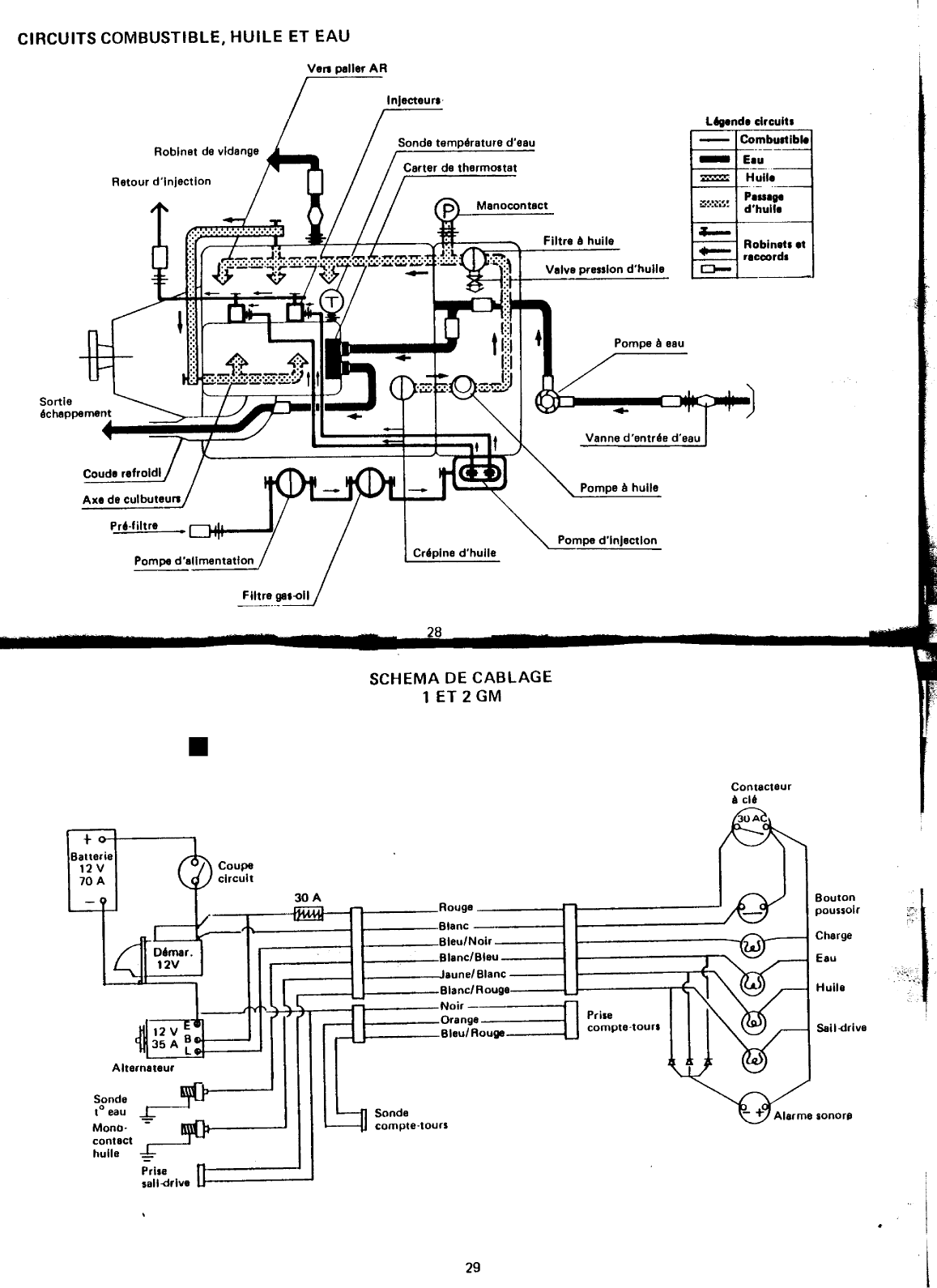 TABLE DES MATIERES 3 Identification 4et 5 Nomenclature 6 et 7 Installation 8 et 10 9Courbes consommations et puissances 11 M Iseenrout e 12 Enroute 13et 14 Arrt moteur 15 16 D Dmarragemanuel d marrages 1ff ICI 1 es 16 1 1 b f t ge etc 17 23 d 24 u ri Ica Ionpur Commandes Istance d 25 Inspections et op ratlonsp rio Iques 26 27 Hivernage Circuits combustible huileeau 28 Schmacblage1 et2GM 29 Schma cblage 3GM 30 i Modles 1GM10 2GM20 3GM30 Type Diesel4 temps Vertical Injection indirecte Alsagex Course 75 x 72 mm Nombrede cylindre 1 2 3 Cylindre 318 cm3 636 cmJ 954 cm3 PuissanceRgime DIN B 9 ch3 600 trmin 18 ch3 600 trmin 27 ch3600 trmin Lubrification Forcepar pompe huile Direct eaude mer Thermostat Dmarrage lectrique 12 V 1 kW Dmarrage auxiliaire Par lanceur manivelle lavant Dcompresseur Recharge batterie alternateur 12 V 35 A 12 V55 A Sensrotation moteur A droite vu de avant Sensrotation hlice A droite vu de larrire J Type KM2 Type KM3 Rapport de rduction 22 1 236 1 Rgime hlice 1 636 trmin 1 525 Poids sec 76 kg 106 kg 130 kg 3 LOCALISATION DES PLAQUES MOTEUR ET REDUCTEUR N de moteur 1GMI Plaque moteur 1GMI Plaque moteur 12GM3GMI Plaquede r6ducteur 13GM avec KBW101 i N de moteur Plaque de r6ducteur 12GM3GMI 11GM2GM3GM avec KM2 et 31 c 4 IDENTIFICATION t Les modlespouvant changer durant les anneset pour assurerune fourniture correcte en pices dtaches il convient dindiqlJer au moment de la commande le matricule du moteur ou du rducteur suivant organe concern PLAQUE MOTEUR G Indication du modle moteur 1GM 2GM ou 3GM YAHMAA DIESEL Puissance du moteur exprimeen puissance continue larbre fOM10tul CD dhlice sur 24 heures de rgime et correspondant la DIN A La puissance la plus couramment utilise en Europe tant la norme RTIIf HP 8 GlfE If PM 3400 DIN B soit une puissance continue arbredhlicesur 1 heure ACt N JAP de rgime voir Numro ou matricule du moteur 1 d n Icatlond u mode 1 d d 1 KM2 1 et 2 GM CD 6fARDl MARINE KM CD e e r ucteur KM3 3GM 6EAR RATIO 011 SAE 011 DY r ND II fJ V Rapport de du rducteur f4 Qualit et quantit dhuile utiliser i 0 IAZAII KOYUKOIOMFG colit Matricule du rducteur inverseur i 1 1 5 NOMENCLATURE 12 13 14 15 9 10 11 7 8 10 7 16 6 16 11 Fig B 6 13 crU5 1 f1 15 8 11 6 1 3 2 4 5 16 Fig A 2 1atJt e 14 h k Fig C 3 6 LEGENDE 881j 1 inverseur 2 Rducteur inverseurvoir chaquemoteur o 3 mcaniquede combustible 4 Jaugehuile moteur et orifice pour vidange par pompe 5 Filtre combustible 6 Pompe eau de visible sur Figure C 7 Levier de commandede linverseur 8 9 Levier de commandedes ou du dcompresseurs 10 11 Bouchon de remplissage huile et levier de moteur commande 12 en partie cachpar silencieux sur Figure B 13 14 Cartouchede filtre huile moteur en partie cachepar alternateur sur Figure B 15 Alternateur 16 Axe de par manivelle 17 Injecteur s 18 Orifice de remplissageet jaugedhuile rducteur inverseur NB La figure A reprsentele modle 3 cylindres dont les sont trs proches du 2 cylindres La figure B reprsentele modle 2 cylindres dont sont communesaux 1 et 3 cylindres ce Lamodle figure C reprsentele modle 1 cylindre dont les emplacements de pices sont particuliers J 7 mI CONSOMMATIONS 240 SPECIFlOUES gchh gchh 220 CONSOMMAtiON ET COURBESDE PUISSANCE lGM10 l GM 1 1 1 1 1 1 200 gchh 240 220 8 c kW 2L h 05 118 200 6 9ch 2G 1 1 ti 1 1 1 1 1 gchh 240 220 II 5 4 7 5 dl 3 m M 200 g 3 2 1 1 1 1 1 1 1 II II COUPLES MOTEUR 5 1 f GM 16 Kgm 18 trmn a 1200 1800 2400 3000 3600 14 12 1 1 1 1 1 1 1 M 1 1 1 11 1 1 Kgm Im m M 1tF Mll 1 1 1 1 1 1 1 l Il 1 1 1 1 1 1 Kgm Les consommations indiques cidessus sont le reflet de la convertionde la consommation chevalet par heureen 1 en grammes itresheure en 1 par itres par heureseront suprieures 1 1 1 1 1 1 1 la consommation Il d l 1200 1600 2000 2400 2800 3200 3600 r e e u moteur en Utl Isatlon REGIMEMOTEUREN TOURSMINUTE normale 88 if i1tifi 1c 2 GM 20 3 GM 30 E 0 E 0 4 II c 3Lh II c l h 0 u 0 u 2 kW 1 k 13 18ch 1 27ch 14 15 21 9 II 10 11 11 15 dl g 5 6 g 7 9 II II II 11 5 2 5 3 i a a trmn 1200 1800 2400 3000 3600 trmn 1200 1800 2400 3000 3600 sortie arbre dhlice durant 1 heurede test sur banc dessaidans la norme DIN 627080 1 Pour le mme test la puissanceprise la sortie du volant moteur est denviron 5 suprieure la norme DIN 62708 Dans la norme DIN 6270 A continuous rating soit la puissance exprimedurant un test de 24 heuresprise la sortie de arbre dhlice 1GM 8 ch 3400 trmin 2GM 16 ch 3400 trmin 3GM 24 ch 3400 trmin o INSTAllATION En A la ligne de flottaison passant la partie infrieure du refroidi le moteur est considr comme install audessus de la flottaison En B la ligne de flottaison passantplus haut et au niveau de la partie suprieure de chappement le moteur est considr comme install sous la flot ta ison l Dans sa version standard le moteur est livr conforme J1J une installation audessus de la flottaison i i Pour un montagesous la flottaison il est ncessaire de modifier la tubulure de refoulement deau REP 2 en la faisant slever le plus haut possibleet en pratiquant en son sommet une mise lair libre Releveraussila partie arrire ou col de cygne de la tubulure de sortie dchappement Sans ces modifications un retour deau dansle moteur restepossible lEGENDE LoF 0 Ligne de flottaison 1 0 Crpine et vanne dentre deau la mer raccorde la pompe de 2 Tubulure de refoulement deau de dans le coude dchappement 3 0 Coudede sortie 4 Pot barbotage pour limiter les retours deau au moteur fait office de silencieux 5 0 Tubulure Noprnede sortie dchappementet deau de 6 de ligne darbre 10 c AVANT lA MISE EN ROUTE i fl drjk VERIFICATIONS Vrifier les Jillrnls serragesdes boulons vis crous et colliers de ensemblede installation mcaniqueet lectrique OIIIIr la 11111e tanchit de la vanne dentre deau la mer des et de com bustible du plsseluueEr1ce qui concerne le pressetoupe un lger suintement est tout fait normal tant que les tresses11Ol1t pas pris leur place dfinitive avec modration un pouvant freiner le moteur marquer larbre dhlice et dtriorer lembrayage Vrifier le bon fonctionnement Jes commandes d