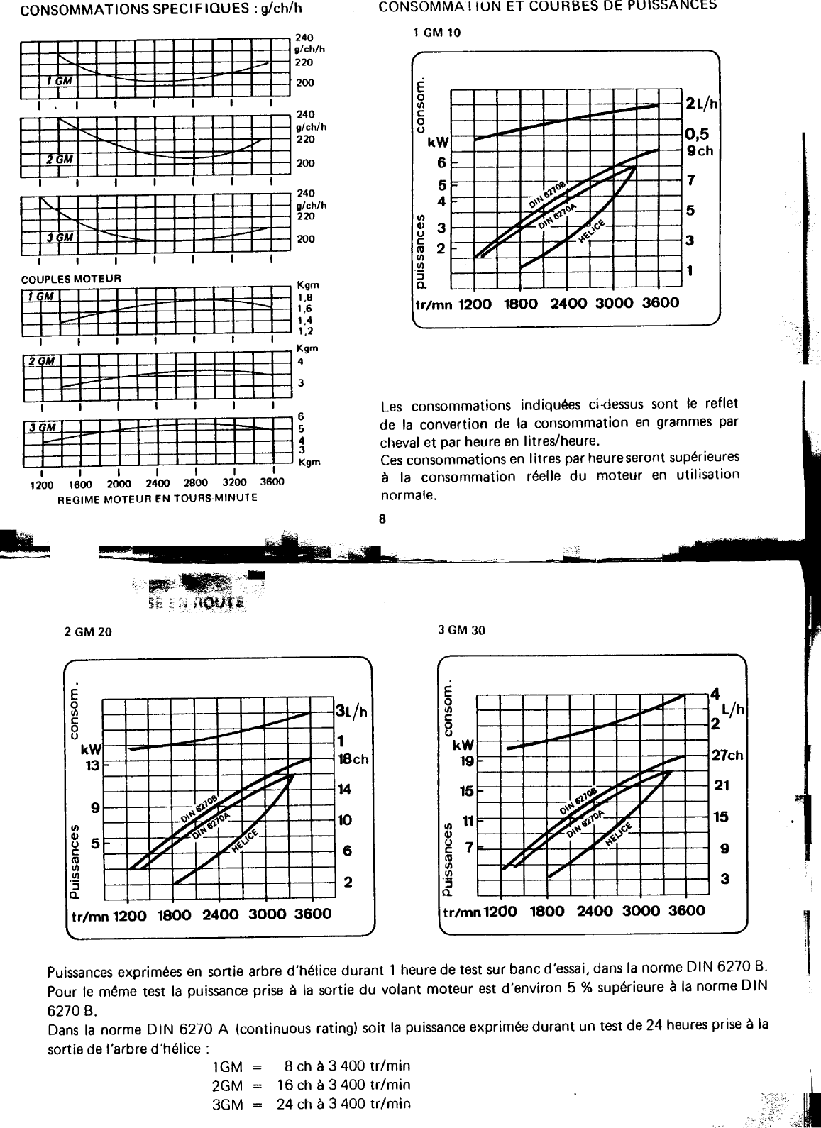 TABLE DES MATIERES 3 Identification 4et 5 Nomenclature 6 et 7 Installation 8 et 10 9Courbes consommations et puissances 11 M Iseenrout e 12 Enroute 13et 14 Arrt moteur 15 16 D Dmarragemanuel d marrages 1ff ICI 1 es 16 1 1 b f t ge etc 17 23 d 24 u ri Ica Ionpur Commandes Istance d 25 Inspections et op ratlonsp rio Iques 26 27 Hivernage Circuits combustible huileeau 28 Schmacblage1 et2GM 29 Schma cblage 3GM 30 i Modles 1GM10 2GM20 3GM30 Type Diesel4 temps Vertical Injection indirecte Alsagex Course 75 x 72 mm Nombrede cylindre 1 2 3 Cylindre 318 cm3 636 cmJ 954 cm3 PuissanceRgime DIN B 9 ch3 600 trmin 18 ch3 600 trmin 27 ch3600 trmin Lubrification Forcepar pompe huile Direct eaude mer Thermostat Dmarrage lectrique 12 V 1 kW Dmarrage auxiliaire Par lanceur manivelle lavant Dcompresseur Recharge batterie alternateur 12 V 35 A 12 V55 A Sensrotation moteur A droite vu de avant Sensrotation hlice A droite vu de larrire J Type KM2 Type KM3 Rapport de rduction 22 1 236 1 Rgime hlice 1 636 trmin 1 525 Poids sec 76 kg 106 kg 130 kg 3 LOCALISATION DES PLAQUES MOTEUR ET REDUCTEUR N de moteur 1GMI Plaque moteur 1GMI Plaque moteur 12GM3GMI Plaquede r6ducteur 13GM avec KBW101 i N de moteur Plaque de r6ducteur 12GM3GMI 11GM2GM3GM avec KM2 et 31 c 4 IDENTIFICATION t Les modlespouvant changer durant les anneset pour assurerune fourniture correcte en pices dtaches il convient dindiqlJer au moment de la commande le matricule du moteur ou du rducteur suivant organe concern PLAQUE MOTEUR G Indication du modle moteur 1GM 2GM ou 3GM YAHMAA DIESEL Puissance du moteur exprimeen puissance continue larbre fOM10tul CD dhlice sur 24 heures de rgime et correspondant la DIN A La puissance la plus couramment utilise en Europe tant la norme RTIIf HP 8 GlfE If PM 3400 DIN B soit une puissance continue arbredhlicesur 1 heure ACt N JAP de rgime voir Numro ou matricule du moteur 1 d n Icatlond u mode 1 d d 1 KM2 1 et 2 GM CD 6fARDl MARINE KM CD e e r ucteur KM3 3GM 6EAR RATIO 011 SAE 011 DY r ND II fJ V Rapport de du rducteur f4 Qualit et quantit dhuile utiliser i 0 IAZAII KOYUKOIOMFG colit Matricule du rducteur inverseur i 1 1 5 NOMENCLATURE 12 13 14 15 9 10 11 7 8 10 7 16 6 16 11 Fig B 6 13 crU5 1 f1 15 8 11 6 1 3 2 4 5 16 Fig A 2 1atJt e 14 h k Fig C 3 6 LEGENDE 881j 1 inverseur 2 Rducteur inverseurvoir chaquemoteur o 3 mcaniquede combustible 4 Jaugehuile moteur et orifice pour vidange par pompe 5 Filtre combustible 6 Pompe eau de visible sur Figure C 7 Levier de commandede linverseur 8 9 Levier de commandedes ou du dcompresseurs 10 11 Bouchon de remplissage huile et levier de moteur commande 12 en partie cachpar silencieux sur Figure B 13 14 Cartouchede filtre huile moteur en partie cachepar alternateur sur Figure B 15 Alternateur 16 Axe de par manivelle 17 Injecteur s 18 Orifice de remplissageet jaugedhuile rducteur inverseur NB La figure A reprsentele modle 3 cylindres dont les sont trs proches du 2 cylindres La figure B reprsentele modle 2 cylindres dont sont communesaux 1 et 3 cylindres ce Lamodle figure C reprsentele modle 1 cylindre dont les emplacements de pices sont particuliers J 7 mI CONSOMMATIONS 240 SPECIFlOUES gchh gchh 220 CONSOMMAtiON ET COURBESDE PUISSANCE lGM10 l GM 1 1 1 1 1 1 200 gchh 240 220 8 c kW 2L h 05 118 200 6 9ch 2G 1 1 ti 1 1 1 1 1 gchh 240 220 II 5 4 7 5 dl 3 m M 200 g 3 2 1 1 1 1 1 1 1 II II COUPLES MOTEUR 5 1 f GM 16 Kgm 18 trmn a 1200 1800 2400 3000 3600 14 12 1 1 1 1 1 1 1 M 1 1 1 11 1 1 Kgm Im m M 1tF Mll 1 1 1 1 1 1 1 l Il 1 1 1 1 1 1 Kgm Les consommations indiques cidessus sont le reflet de la convertionde la consommation chevalet par heureen 1 en grammes itresheure en 1 par itres par heureseront suprieures 1 1 1 1 1 1 1 la consommation Il d l 1200 1600 2000 2400 2800 3200 3600 r e e u moteur en Utl Isatlon REGIMEMOTEUREN TOURSMINUTE normale 88 if i1tifi 1c 2 GM 20 3 GM 30 E 0 E 0 4 II c 3Lh II c l h 0 u 0 u 2 kW 1 k 13 18ch 1 27ch 14 15 21 9 II 10 11 11 15 dl g 5 6 g 7 9 II II II 11 5 2 5 3 i a a trmn 1200 1800 2400 3000 3600 trmn 1200 1800 2400 3000 3600 sortie arbre dhlice durant 1 heurede test sur banc dessaidans la norme DIN 627080 1 Pour le mme test la puissanceprise la sortie du volant moteur est denviron 5 suprieure la norme DIN 62708 Dans la norme DIN 6270 A continuous rating soit la puissance exprimedurant un test de 24 heuresprise la sortie de arbre dhlice 1GM 8 ch 3400 trmin 2GM 16 ch 3400 trmin 3GM 24 ch 3400 trmin o INSTAllATION En A la ligne de flottaison passant la partie infrieure du refroidi le moteur est considr comme install audessus de la flottaison En B la ligne de flottaison passantplus haut et au niveau de la partie suprieure de chappement le moteur est considr comme install sous la flot ta ison l Dans sa version standard le moteur est livr conforme J1J une installation audessus de la flottaison i i Pour un montagesous la flottaison il est ncessaire de modifier la tubulure de refoulement deau REP 2 en la faisant slever le plus haut possibleet en pratiquant en son sommet une mise lair libre Releveraussila partie arrire ou col de cygne de la tubulure de sortie dchappement Sans ces modifications un retour deau dansle moteur restepossible lEGENDE LoF 0 Ligne de flottaison 1 0 Crpine et vanne dentre deau la mer raccorde la pompe de 2 Tubulure de refoulement deau de dans le coude dchappement 3 0 Coudede sortie 4 Pot barbotage pour limiter les retours deau au moteur fait office de silencieux 5 0 Tubulure Noprnede sortie dchappementet deau de 6 de ligne darbre 10 c AVANT lA MISE EN ROUTE i fl drjk VERIFICATIONS Vrifier les Jillrnls serragesdes boulons vis crous et colliers de ensemblede installation mcaniqueet lectrique OIIIIr la 11111e tanchit de la vanne dentre deau la mer des et de com bustible du plsseluueEr1ce qui concerne le pressetoupe un lger suintement est tout fait normal tant que les tresses11Ol1t pas pris leur place dfinitive avec modration un pouvant freiner le moteur marquer larbre dhlice et dtriorer lembrayage Vrifier le bon fonctionnement Jes commandes d