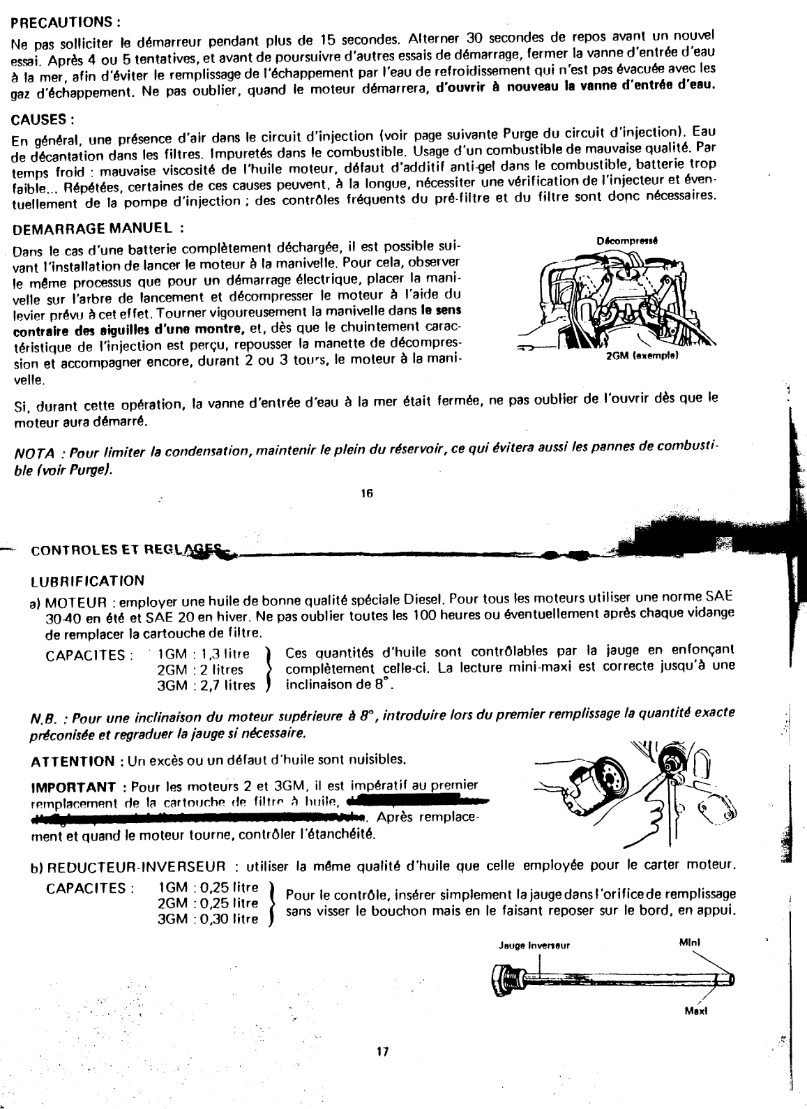 TABLE DES MATIERES 3 Identification 4et 5 Nomenclature 6 et 7 Installation 8 et 10 9Courbes consommations et puissances 11 M Iseenrout e 12 Enroute 13et 14 Arrt moteur 15 16 D Dmarragemanuel d marrages 1ff ICI 1 es 16 1 1 b f t ge etc 17 23 d 24 u ri Ica Ionpur Commandes Istance d 25 Inspections et op ratlonsp rio Iques 26 27 Hivernage Circuits combustible huileeau 28 Schmacblage1 et2GM 29 Schma cblage 3GM 30 i Modles 1GM10 2GM20 3GM30 Type Diesel4 temps Vertical Injection indirecte Alsagex Course 75 x 72 mm Nombrede cylindre 1 2 3 Cylindre 318 cm3 636 cmJ 954 cm3 PuissanceRgime DIN B 9 ch3 600 trmin 18 ch3 600 trmin 27 ch3600 trmin Lubrification Forcepar pompe huile Direct eaude mer Thermostat Dmarrage lectrique 12 V 1 kW Dmarrage auxiliaire Par lanceur manivelle lavant Dcompresseur Recharge batterie alternateur 12 V 35 A 12 V55 A Sensrotation moteur A droite vu de avant Sensrotation hlice A droite vu de larrire J Type KM2 Type KM3 Rapport de rduction 22 1 236 1 Rgime hlice 1 636 trmin 1 525 Poids sec 76 kg 106 kg 130 kg 3 LOCALISATION DES PLAQUES MOTEUR ET REDUCTEUR N de moteur 1GMI Plaque moteur 1GMI Plaque moteur 12GM3GMI Plaquede r6ducteur 13GM avec KBW101 i N de moteur Plaque de r6ducteur 12GM3GMI 11GM2GM3GM avec KM2 et 31 c 4 IDENTIFICATION t Les modlespouvant changer durant les anneset pour assurerune fourniture correcte en pices dtaches il convient dindiqlJer au moment de la commande le matricule du moteur ou du rducteur suivant organe concern PLAQUE MOTEUR G Indication du modle moteur 1GM 2GM ou 3GM YAHMAA DIESEL Puissance du moteur exprimeen puissance continue larbre fOM10tul CD dhlice sur 24 heures de rgime et correspondant la DIN A La puissance la plus couramment utilise en Europe tant la norme RTIIf HP 8 GlfE If PM 3400 DIN B soit une puissance continue arbredhlicesur 1 heure ACt N JAP de rgime voir Numro ou matricule du moteur 1 d n Icatlond u mode 1 d d 1 KM2 1 et 2 GM CD 6fARDl MARINE KM CD e e r ucteur KM3 3GM 6EAR RATIO 011 SAE 011 DY r ND II fJ V Rapport de du rducteur f4 Qualit et quantit dhuile utiliser i 0 IAZAII KOYUKOIOMFG colit Matricule du rducteur inverseur i 1 1 5 NOMENCLATURE 12 13 14 15 9 10 11 7 8 10 7 16 6 16 11 Fig B 6 13 crU5 1 f1 15 8 11 6 1 3 2 4 5 16 Fig A 2 1atJt e 14 h k Fig C 3 6 LEGENDE 881j 1 inverseur 2 Rducteur inverseurvoir chaquemoteur o 3 mcaniquede combustible 4 Jaugehuile moteur et orifice pour vidange par pompe 5 Filtre combustible 6 Pompe eau de visible sur Figure C 7 Levier de commandede linverseur 8 9 Levier de commandedes ou du dcompresseurs 10 11 Bouchon de remplissage huile et levier de moteur commande 12 en partie cachpar silencieux sur Figure B 13 14 Cartouchede filtre huile moteur en partie cachepar alternateur sur Figure B 15 Alternateur 16 Axe de par manivelle 17 Injecteur s 18 Orifice de remplissageet jaugedhuile rducteur inverseur NB La figure A reprsentele modle 3 cylindres dont les sont trs proches du 2 cylindres La figure B reprsentele modle 2 cylindres dont sont communesaux 1 et 3 cylindres ce Lamodle figure C reprsentele modle 1 cylindre dont les emplacements de pices sont particuliers J 7 mI CONSOMMATIONS 240 SPECIFlOUES gchh gchh 220 CONSOMMAtiON ET COURBESDE PUISSANCE lGM10 l GM 1 1 1 1 1 1 200 gchh 240 220 8 c kW 2L h 05 118 200 6 9ch 2G 1 1 ti 1 1 1 1 1 gchh 240 220 II 5 4 7 5 dl 3 m M 200 g 3 2 1 1 1 1 1 1 1 II II COUPLES MOTEUR 5 1 f GM 16 Kgm 18 trmn a 1200 1800 2400 3000 3600 14 12 1 1 1 1 1 1 1 M 1 1 1 11 1 1 Kgm Im m M 1tF Mll 1 1 1 1 1 1 1 l Il 1 1 1 1 1 1 Kgm Les consommations indiques cidessus sont le reflet de la convertionde la consommation chevalet par heureen 1 en grammes itresheure en 1 par itres par heureseront suprieures 1 1 1 1 1 1 1 la consommation Il d l 1200 1600 2000 2400 2800 3200 3600 r e e u moteur en Utl Isatlon REGIMEMOTEUREN TOURSMINUTE normale 88 if i1tifi 1c 2 GM 20 3 GM 30 E 0 E 0 4 II c 3Lh II c l h 0 u 0 u 2 kW 1 k 13 18ch 1 27ch 14 15 21 9 II 10 11 11 15 dl g 5 6 g 7 9 II II II 11 5 2 5 3 i a a trmn 1200 1800 2400 3000 3600 trmn 1200 1800 2400 3000 3600 sortie arbre dhlice durant 1 heurede test sur banc dessaidans la norme DIN 627080 1 Pour le mme test la puissanceprise la sortie du volant moteur est denviron 5 suprieure la norme DIN 62708 Dans la norme DIN 6270 A continuous rating soit la puissance exprimedurant un test de 24 heuresprise la sortie de arbre dhlice 1GM 8 ch 3400 trmin 2GM 16 ch 3400 trmin 3GM 24 ch 3400 trmin o INSTAllATION En A la ligne de flottaison passant la partie infrieure du refroidi le moteur est considr comme install audessus de la flottaison En B la ligne de flottaison passantplus haut et au niveau de la partie suprieure de chappement le moteur est considr comme install sous la flot ta ison l Dans sa version standard le moteur est livr conforme J1J une installation audessus de la flottaison i i Pour un montagesous la flottaison il est ncessaire de modifier la tubulure de refoulement deau REP 2 en la faisant slever le plus haut possibleet en pratiquant en son sommet une mise lair libre Releveraussila partie arrire ou col de cygne de la tubulure de sortie dchappement Sans ces modifications un retour deau dansle moteur restepossible lEGENDE LoF 0 Ligne de flottaison 1 0 Crpine et vanne dentre deau la mer raccorde la pompe de 2 Tubulure de refoulement deau de dans le coude dchappement 3 0 Coudede sortie 4 Pot barbotage pour limiter les retours deau au moteur fait office de silencieux 5 0 Tubulure Noprnede sortie dchappementet deau de 6 de ligne darbre 10 c AVANT lA MISE EN ROUTE i fl drjk VERIFICATIONS Vrifier les Jillrnls serragesdes boulons vis crous et colliers de ensemblede installation mcaniqueet lectrique OIIIIr la 11111e tanchit de la vanne dentre deau la mer des et de com bustible du plsseluueEr1ce qui concerne le pressetoupe un lger suintement est tout fait normal tant que les tresses11Ol1t pas pris leur place dfinitive avec modration un pouvant freiner le moteur marquer larbre dhlice et dtriorer lembrayage Vrifier le bon fonctionnement Jes commandes d