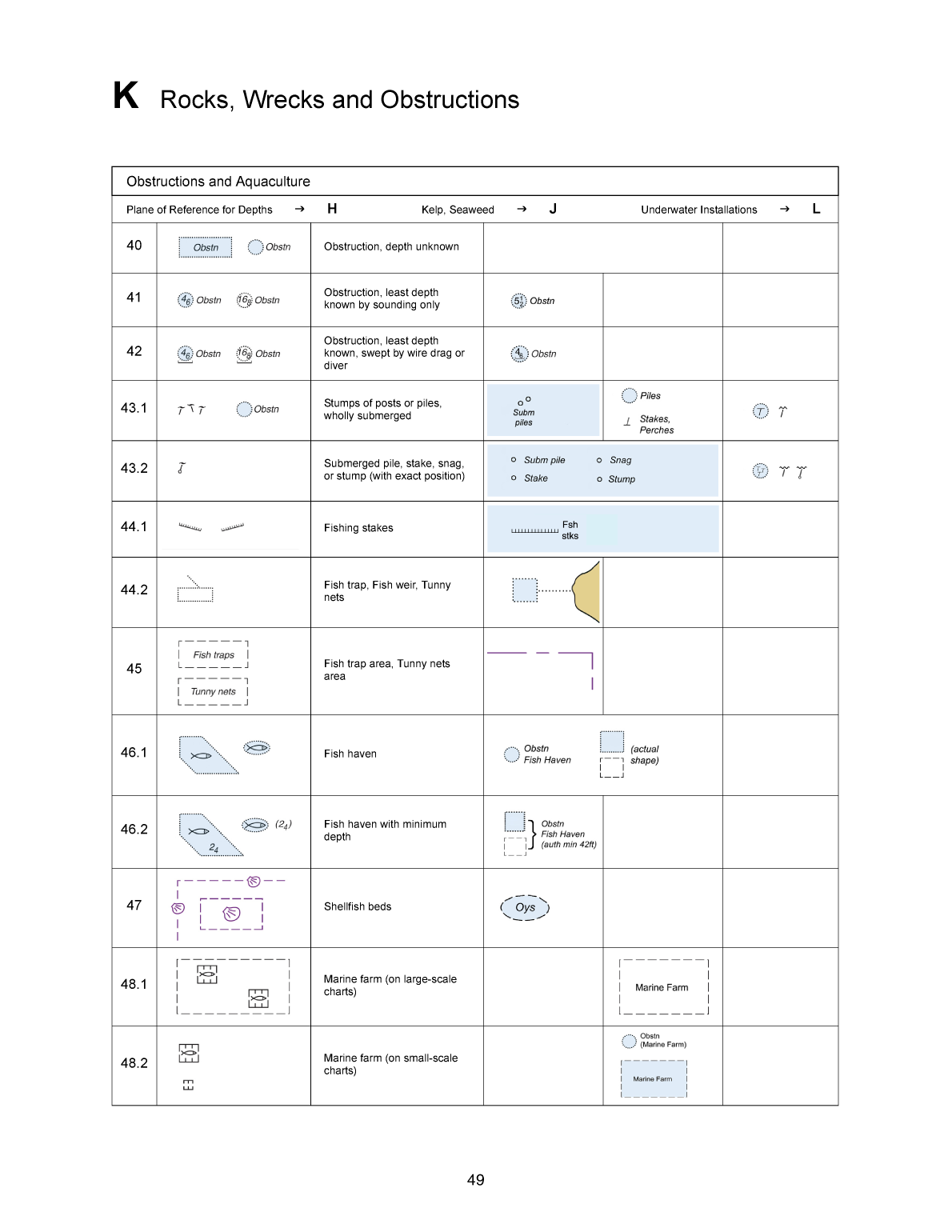 Chart No 1UNITED STATES OF Chart Symbols Abbreviations and TermsEleventh Edition November 2011Chart No1United States of Chart and TermsEleventh 2011Prepared jointly byUS Department of Oceanic and Atmospheric Ocean DCUS Department of VAChanges to this edition will be published by the National Agency NGAin the Notice to MarinersThese changes are also available on the Internet at Record of No Notice No Corrected On Corrected by 2 SYMBOLS ABBREVIATIONS TERMS AND SCHEMATIC LAYOUTGENERALA Chart Number Title and Marginal NotesB Positions Distances Directions and Natural FeaturesD Cultural FeaturesE LandmarksF PortsG Topographic Tides and CurrentsI DepthsJ Nature of the SeabedK Rocks Wrecks and ObstructionsL Offshore InstallationsM Tracks and RoutesN Areas and LimitsO Hydrographic AIDS AND SERVICESP LightsQ Buoys and BeaconsR Fog SignalsS Radar Radio and Satellite Navigation SystemsT ServicesU Small Craft Leisure Index of AbbreviationsW International AbbreviationsX IndexAPPENDIX1 IALA 3 The 11th edition of U S Chart No 1 Nautical Chart Symbols Abbreviations and Terms presents thesymbols depicted on paper nautical charts produced by the National Oceanic and Atmospheric and the National Agency NGA as well as digital raster of thosecharts such as Raster Nautical Charts RNC This document also shows the symbols described in theRegulations of the IHO for International INT Charts and Chart Specifications of the IHO published by Hydrographic Organization IHO which are portrayed in the three official language versions Chart 1 INT 1Electronic Charts The symbols and abbreviations displayed on navigation systems portraying Navigational Charts NOAA ENC or NGAproduced Digital Nautical Charts DNC are quite similar tothose used on paper charts for some features but different for others This document is not intended as a referencefor the use of these vectorbased productsChange in Column Order Previous editions of US Chart No 1 showed US symbology on the left side of thepage and INT 1 symbology in the second column from the right This edition of Chart No 1 has reversed the orderINT 1 symbols now appear in the second column from the left after the symbol number Any variations from INT 1symbology that are used on charts produced by NOAA or NGA are shown in the NOAA NGA and the of foreign charts columns columns 4 5 and 6 respectively When columns 4 and 5 are combined this indicates that NOAA and NGA use the same symbol for that When any of columns 4 5 or 6 are blank then the INT 1 symbol has been adopted for use by for which that column applies The schematic layout following this introduction shows a typical symboltable page and describes the table headers and the types of information presented in each of the columnsSample Chart Layouts Section A presents two schematics showing typical layouts of the major elements ofNOAA and NGA The sounding datum reference is stated in the chart title Soundings on NOAA and NGA charts may beshown in fathoms feet fathoms and feet fathoms and fractions or meters and decimeters In all cases the unit ofdepth used is shown in the chart title and outside the border of the chart in bold type See item Ab in Section AHeights Heights of lights landmarks structures etc refer to the shoreline plane of reference The unit of height isshown in the chart title When the elevations of islets or bare rocks are offset into the adjacent water they are shownin Heights For rocks and banks that cover and uncover elevations are underlined and are referenced to thesounding datum as stated in the chart title When the heights of rocks that cover and uncover are offset into theadjacent water they are shown in Shoreline shown on charts represents the line of contact between the land and a selected waterelevation In areas affected by tidal fluctuation this line of contact is usually the mean highwater line In waters of diminished tidal influence a mean water level may be used The shoreline of interior watersrivers lakes is usually a line representing a specified elevation above a selected datum Shoreline is symbolizedby a heavy line symbol C1 Apparent shoreline is depicted on charts to show the outer edge of marine the shoreline limit would be expected to appear to the observer or where it prevents the shoreline from beingclearly defined Apparent shoreline is symbolized by a lighter line symbols C32 C33 Ca Cq and Cr 4Landmarks A structure or a conspicuous feature on a structure may be shown by a landmark symbol with adescriptive label see Section E Prominent buildings that could assist the navigator may be shown by actual shapeas viewed from above see Sections D and E On NGA charts a landmark legend that is shown in capital that the landmark is conspicuous the landmark may also be labeled CONSPICUOUS or CONSPIC OnNOAA charts all landmarks are considered to be conspicuous and landmark legends shown in all capital the landmark has been positioned accurately legends using both upper and lower case letters indicate anapproximate positionIALA Buoyage System The International Association of Marine Aids to Navigation and Lighthouse Maritime Buoyage System is followed by most of the worlds maritime nations however systems used insome foreign waters may be different IALA buoyage is divided into two regions Region A and Region B Allnavigable waters of the United States follow IALA Region B rules except US possessions west of the Line and south of 10 north latitude which follow IALA Region A The major difference in the two buoyage Regions is the color of the lateral marks Region A uses redtoportmarks and Region B uses redtostarboard marks when entering from seaward The shapes of lateral markshowever are the same in both Regions can to port and cone nun to starboard when entering from and other marks such as isolated danger marks safe water marks and special marks are also the same inboth Regions Section Q and Appendix 1 illustrate the IALA Buoyage System for both Regions A and BUS Lateral Marks Most of US waters lie within