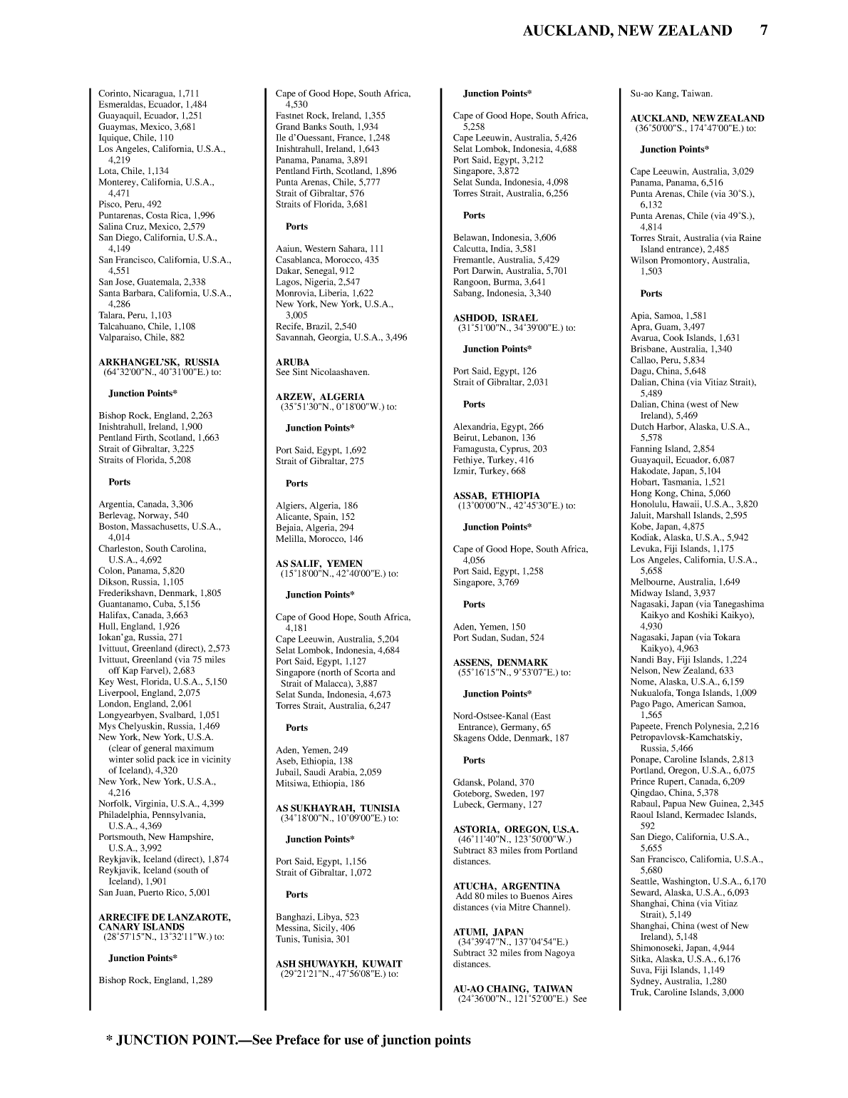 PUB 151DISTANCES BETWEEN PORTS Prepared and published by the NATIONAL AGENCY Bethesda Maryland COPYRIGHT 2001 BY THE UNITED STATES GOVERNMENT NO COPYRIGHT CLAIMED UNDER TITLE 17 USC ELEVENTH EDITION 2001 PREFACE GENERAL INFORMATIONThe 2001 Edition take advantage of favorable currents or weather on one orof Pub 151 Distances Between Ports supersedes all both of the routes To obtain a distance over a route thatprevious editions Distances in this table are in nautical passes through one or more Junction Points it ismiles based on the International Nautical Mile of necessary to find and add distances for the two or 60761 feet Nautical miles may be sections into which the route is to statute miles of 5280 feet by multiplying by For example New York to ColomboUsing the115 See conversion table at back of book The Junction Point chartlets at the front of the book locate allpositions listed for Ports are central positions that most Junction Points between New York and each port The distances are between positionsshown for each port and are generally over routes that There are two Strait of Gibraltar andafford the safest passage Most of the distances representthe shortest navigable routes but in some cases longer Port Saidroutes that take advantage of favorable currents havebeen used In other cases increased distances result from Find New York in the Distance Table Page 69routes selected to avoid ice or other dangers to navigation Under Junction Points locate or to follow required separation schemes Strait of Gibraltar 3180 miles DESCRIPTION OF THE are listed alphabetically with distances to arrival Find Strait of Gibraltar in the Distance TablePorts listed below them distances to appropriate junction Page 108points are also listed Junction Points are in the alphabetical sequence with distances to Under Junction Points locate other appropriate Junction Points listed below Great Port Said Arab Republic ofLakes distances are given in US Coast Pilot 6 Egypt 1943 miles JUNCTION POINTSIt is impractical to give alldistances for every possible combination of Ports in this Find Port Said in the Distance Table Page 85volume therefore the use of Junction Points greatly Under Ports locate increases the number of distances that may be included byaffording a means of connecting routes in adjacent Colombo Sri Lanka 3481 milesoceans In this book a Junction Point is a position wheremany routes converge and through which ships pass whensailing from one major area into another For example the Total Nautical Miles 8604Junction Point for routes from the Atlantic into is the Strait of Gibraltar Junction Points If the user wishes to know the westbound routeused in this publication are shown on the chartlets in the because of enroute cargo commitments or which route isfront part of the book shorterproceed as follows ROUTESRoutes throughout the world are New York to Panama 2016described in the Sailing Directions along with route chartsfor the area of coverage Articles on currents and Panama to Singapore are also covered in these publications Singapore to Colombo charts are available such as Pilot Chartsand the NGA World Chart Series 1145 which portrayocean routes worldwide Any of these products may be Total Nautical Miles 14102used to assist the user in planning a voyage A chartlet ofbasic ocean routes is included in the front of this CORRECTIVE arepublication for quick reference requested to forward new or corrective information useful in the correction of this publication to HOW TO USE THE TABLESTo find the departure port in the alphabetical MARITIME and select the desired arrival port and distance ST D 44listed below In most cases the distances from one port to NATIONAL AGENCYanother and return are reciprocal but in some cases the 4600 SANGAMORE ROADdistances differ because different routes were used which BETHESDA MARYLAND 208165003 I THE NATIONAL AGENCY MARITIME SAFETY INFORMATION WEB SITE The National Agency NGA Maritime Safety Information Web site provides query access to extensive menus of maritime safety information 24 hours a day Databases made available for access query and download include Chart Corrections Publication Catalog Corrections Chart and Publication Reference Data current edition number dates title scale Listof Lights USCG Light Lists WorldWide Navigational Warning Service WWNWS Broadcast Warnings MARAD Advisories Department of State Special Warnings Mobile Offshore Drilling Units Activity Messages ASAMs World Port Index and Radio Navigational Aids Publications that are alsomade available as PDF files include the US Notice to Mariners Sailing Directions US Chart No 1 The Navigator Bowditch International Code of Signals Radio Navigational Aids World Port Index Ports Sight Reduction Tables for Marine and Air Navigation and the Radar Navigation and Maneuvering BoardManual The Maritime Safety Information Web site can be accessed via the NGA Homepage wwwngamil under the Productsand Services Maritime links or directly at Any questions concerning the Maritime Safety Information Website should be directed to MARITIME DIVISION ST D 44 NATIONAL AGENCY 4600 SANGAMORE ROAD BETHESDA MD 208165003 Telephone 3012273296 or DSN 2873296 Fax 3012274211 Email II CONTENTS PagePreface IChart Showing General World Routes VList of Junction Points VIJunction Points Atlantic Ocean Basin VIIJunction Points Indian Ocean Basin VIIIJunction Points Pacific Ocean Basin IXDistance Between Ocean Ports of the World 1Conversion Table for Nautical and Statute Miles 127Table for Estimating Time of Transit 128 IIIChart Showing General World Routes V PUB 151 JUNCTION POINTSBishop Rock England494500N 63500WCape Leeuwin Australia 343200S 1150800ECape of Good Hope South Africa 342200S 182300EFastnet Rock Ireland512000N 93600WGrand Banks South423000N 500000WHonshu Japan 350000N 1403000EIle dOuessant France484000N Ireland 552500N 73000WMontreal Canada 453000N Germany 542200N 100900EPanama Panama85300N Firth Scotland 584200N 32000WPort Said Egy