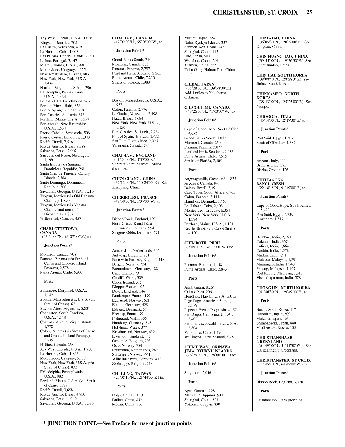PUB 151DISTANCES BETWEEN PORTS Prepared and published by the NATIONAL AGENCY Bethesda Maryland COPYRIGHT 2001 BY THE UNITED STATES GOVERNMENT NO COPYRIGHT CLAIMED UNDER TITLE 17 USC ELEVENTH EDITION 2001 PREFACE GENERAL INFORMATIONThe 2001 Edition take advantage of favorable currents or weather on one orof Pub 151 Distances Between Ports supersedes all both of the routes To obtain a distance over a route thatprevious editions Distances in this table are in nautical passes through one or more Junction Points it ismiles based on the International Nautical Mile of necessary to find and add distances for the two or 60761 feet Nautical miles may be sections into which the route is to statute miles of 5280 feet by multiplying by For example New York to ColomboUsing the115 See conversion table at back of book The Junction Point chartlets at the front of the book locate allpositions listed for Ports are central positions that most Junction Points between New York and each port The distances are between positionsshown for each port and are generally over routes that There are two Strait of Gibraltar andafford the safest passage Most of the distances representthe shortest navigable routes but in some cases longer Port Saidroutes that take advantage of favorable currents havebeen used In other cases increased distances result from Find New York in the Distance Table Page 69routes selected to avoid ice or other dangers to navigation Under Junction Points locate or to follow required separation schemes Strait of Gibraltar 3180 miles DESCRIPTION OF THE are listed alphabetically with distances to arrival Find Strait of Gibraltar in the Distance TablePorts listed below them distances to appropriate junction Page 108points are also listed Junction Points are in the alphabetical sequence with distances to Under Junction Points locate other appropriate Junction Points listed below Great Port Said Arab Republic ofLakes distances are given in US Coast Pilot 6 Egypt 1943 miles JUNCTION POINTSIt is impractical to give alldistances for every possible combination of Ports in this Find Port Said in the Distance Table Page 85volume therefore the use of Junction Points greatly Under Ports locate increases the number of distances that may be included byaffording a means of connecting routes in adjacent Colombo Sri Lanka 3481 milesoceans In this book a Junction Point is a position wheremany routes converge and through which ships pass whensailing from one major area into another For example the Total Nautical Miles 8604Junction Point for routes from the Atlantic into is the Strait of Gibraltar Junction Points If the user wishes to know the westbound routeused in this publication are shown on the chartlets in the because of enroute cargo commitments or which route isfront part of the book shorterproceed as follows ROUTESRoutes throughout the world are New York to Panama 2016described in the Sailing Directions along with route chartsfor the area of coverage Articles on currents and Panama to Singapore are also covered in these publications Singapore to Colombo charts are available such as Pilot Chartsand the NGA World Chart Series 1145 which portrayocean routes worldwide Any of these products may be Total Nautical Miles 14102used to assist the user in planning a voyage A chartlet ofbasic ocean routes is included in the front of this CORRECTIVE arepublication for quick reference requested to forward new or corrective information useful in the correction of this publication to HOW TO USE THE TABLESTo find the departure port in the alphabetical MARITIME and select the desired arrival port and distance ST D 44listed below In most cases the distances from one port to NATIONAL AGENCYanother and return are reciprocal but in some cases the 4600 SANGAMORE ROADdistances differ because different routes were used which BETHESDA MARYLAND 208165003 I THE NATIONAL AGENCY MARITIME SAFETY INFORMATION WEB SITE The National Agency NGA Maritime Safety Information Web site provides query access to extensive menus of maritime safety information 24 hours a day Databases made available for access query and download include Chart Corrections Publication Catalog Corrections Chart and Publication Reference Data current edition number dates title scale Listof Lights USCG Light Lists WorldWide Navigational Warning Service WWNWS Broadcast Warnings MARAD Advisories Department of State Special Warnings Mobile Offshore Drilling Units Activity Messages ASAMs World Port Index and Radio Navigational Aids Publications that are alsomade available as PDF files include the US Notice to Mariners Sailing Directions US Chart No 1 The Navigator Bowditch International Code of Signals Radio Navigational Aids World Port Index Ports Sight Reduction Tables for Marine and Air Navigation and the Radar Navigation and Maneuvering BoardManual The Maritime Safety Information Web site can be accessed via the NGA Homepage wwwngamil under the Productsand Services Maritime links or directly at Any questions concerning the Maritime Safety Information Website should be directed to MARITIME DIVISION ST D 44 NATIONAL AGENCY 4600 SANGAMORE ROAD BETHESDA MD 208165003 Telephone 3012273296 or DSN 2873296 Fax 3012274211 Email II CONTENTS PagePreface IChart Showing General World Routes VList of Junction Points VIJunction Points Atlantic Ocean Basin VIIJunction Points Indian Ocean Basin VIIIJunction Points Pacific Ocean Basin IXDistance Between Ocean Ports of the World 1Conversion Table for Nautical and Statute Miles 127Table for Estimating Time of Transit 128 IIIChart Showing General World Routes V PUB 151 JUNCTION POINTSBishop Rock England494500N 63500WCape Leeuwin Australia 343200S 1150800ECape of Good Hope South Africa 342200S 182300EFastnet Rock Ireland512000N 93600WGrand Banks South423000N 500000WHonshu Japan 350000N 1403000EIle dOuessant France484000N Ireland 552500N 73000WMontreal Canada 453000N Germany 542200N 100900EPanama Panama85300N Firth Scotland 584200N 32000WPort Said Egy