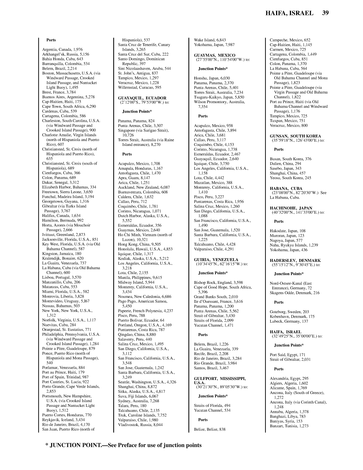 PUB 151DISTANCES BETWEEN PORTS Prepared and published by the NATIONAL AGENCY Bethesda Maryland COPYRIGHT 2001 BY THE UNITED STATES GOVERNMENT NO COPYRIGHT CLAIMED UNDER TITLE 17 USC ELEVENTH EDITION 2001 PREFACE GENERAL INFORMATIONThe 2001 Edition take advantage of favorable currents or weather on one orof Pub 151 Distances Between Ports supersedes all both of the routes To obtain a distance over a route thatprevious editions Distances in this table are in nautical passes through one or more Junction Points it ismiles based on the International Nautical Mile of necessary to find and add distances for the two or 60761 feet Nautical miles may be sections into which the route is to statute miles of 5280 feet by multiplying by For example New York to ColomboUsing the115 See conversion table at back of book The Junction Point chartlets at the front of the book locate allpositions listed for Ports are central positions that most Junction Points between New York and each port The distances are between positionsshown for each port and are generally over routes that There are two Strait of Gibraltar andafford the safest passage Most of the distances representthe shortest navigable routes but in some cases longer Port Saidroutes that take advantage of favorable currents havebeen used In other cases increased distances result from Find New York in the Distance Table Page 69routes selected to avoid ice or other dangers to navigation Under Junction Points locate or to follow required separation schemes Strait of Gibraltar 3180 miles DESCRIPTION OF THE are listed alphabetically with distances to arrival Find Strait of Gibraltar in the Distance TablePorts listed below them distances to appropriate junction Page 108points are also listed Junction Points are in the alphabetical sequence with distances to Under Junction Points locate other appropriate Junction Points listed below Great Port Said Arab Republic ofLakes distances are given in US Coast Pilot 6 Egypt 1943 miles JUNCTION POINTSIt is impractical to give alldistances for every possible combination of Ports in this Find Port Said in the Distance Table Page 85volume therefore the use of Junction Points greatly Under Ports locate increases the number of distances that may be included byaffording a means of connecting routes in adjacent Colombo Sri Lanka 3481 milesoceans In this book a Junction Point is a position wheremany routes converge and through which ships pass whensailing from one major area into another For example the Total Nautical Miles 8604Junction Point for routes from the Atlantic into is the Strait of Gibraltar Junction Points If the user wishes to know the westbound routeused in this publication are shown on the chartlets in the because of enroute cargo commitments or which route isfront part of the book shorterproceed as follows ROUTESRoutes throughout the world are New York to Panama 2016described in the Sailing Directions along with route chartsfor the area of coverage Articles on currents and Panama to Singapore are also covered in these publications Singapore to Colombo charts are available such as Pilot Chartsand the NGA World Chart Series 1145 which portrayocean routes worldwide Any of these products may be Total Nautical Miles 14102used to assist the user in planning a voyage A chartlet ofbasic ocean routes is included in the front of this CORRECTIVE arepublication for quick reference requested to forward new or corrective information useful in the correction of this publication to HOW TO USE THE TABLESTo find the departure port in the alphabetical MARITIME and select the desired arrival port and distance ST D 44listed below In most cases the distances from one port to NATIONAL AGENCYanother and return are reciprocal but in some cases the 4600 SANGAMORE ROADdistances differ because different routes were used which BETHESDA MARYLAND 208165003 I THE NATIONAL AGENCY MARITIME SAFETY INFORMATION WEB SITE The National Agency NGA Maritime Safety Information Web site provides query access to extensive menus of maritime safety information 24 hours a day Databases made available for access query and download include Chart Corrections Publication Catalog Corrections Chart and Publication Reference Data current edition number dates title scale Listof Lights USCG Light Lists WorldWide Navigational Warning Service WWNWS Broadcast Warnings MARAD Advisories Department of State Special Warnings Mobile Offshore Drilling Units Activity Messages ASAMs World Port Index and Radio Navigational Aids Publications that are alsomade available as PDF files include the US Notice to Mariners Sailing Directions US Chart No 1 The Navigator Bowditch International Code of Signals Radio Navigational Aids World Port Index Ports Sight Reduction Tables for Marine and Air Navigation and the Radar Navigation and Maneuvering BoardManual The Maritime Safety Information Web site can be accessed via the NGA Homepage wwwngamil under the Productsand Services Maritime links or directly at Any questions concerning the Maritime Safety Information Website should be directed to MARITIME DIVISION ST D 44 NATIONAL AGENCY 4600 SANGAMORE ROAD BETHESDA MD 208165003 Telephone 3012273296 or DSN 2873296 Fax 3012274211 Email II CONTENTS PagePreface IChart Showing General World Routes VList of Junction Points VIJunction Points Atlantic Ocean Basin VIIJunction Points Indian Ocean Basin VIIIJunction Points Pacific Ocean Basin IXDistance Between Ocean Ports of the World 1Conversion Table for Nautical and Statute Miles 127Table for Estimating Time of Transit 128 IIIChart Showing General World Routes V PUB 151 JUNCTION POINTSBishop Rock England494500N 63500WCape Leeuwin Australia 343200S 1150800ECape of Good Hope South Africa 342200S 182300EFastnet Rock Ireland512000N 93600WGrand Banks South423000N 500000WHonshu Japan 350000N 1403000EIle dOuessant France484000N Ireland 552500N 73000WMontreal Canada 453000N Germany 542200N 100900EPanama Panama85300N Firth Scotland 584200N 32000WPort Said Egy