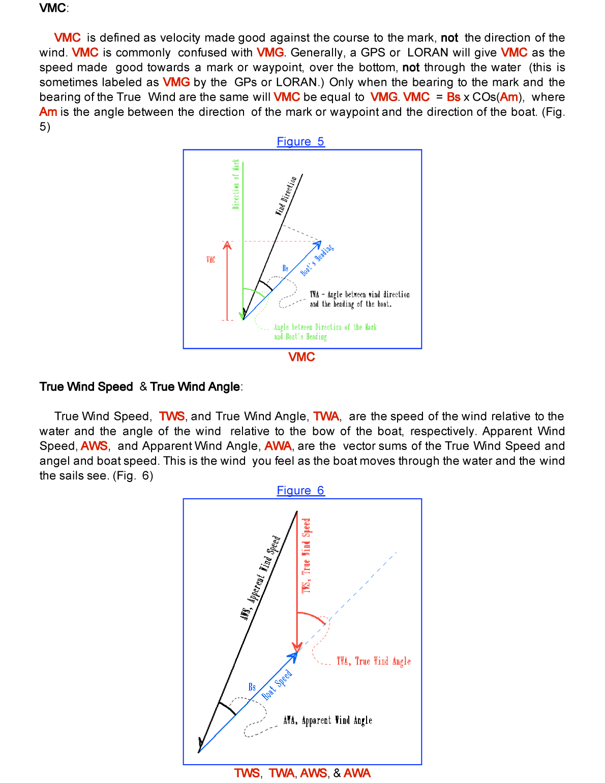 you can stop reading if you have satisfied your question the following is just more boring details of where Target Boat Speed comes from and how to use themP89 TARfff Y Y llfff Y Y Y Y Y Y Y Y Y Y Y Y Y Y Y Y Yffff333fff333 Offff Y Y Y Yffff333fff333 Slffff Y Y Y Yffff333fff333 SOffff Y fff Y Y Y Yfff333fff333 ffff Y Y Y Yffff333fff333 J3 ffff Y Y Y Yffff333fff333 J385 ffff Y Y O l23ll 6 nO333M M M 333M M M M 33333333ffJ3 333333M M M 6 n G 333333M M M 1 1O M 33333O3333M M 33331l13O M M 333O23333M M M 333 3333M M M 3O M 332 M 333 l33333M M M M 1 M M 33 6 nG 13333M M G 6 nM M M 333 6 n 333333M 333M M M 336 n 33333M M 3333M M M 333J M 33333M M 3333M M 333 23M G 2333333M 33333M M M M 3333M M M M 3333333 6 n l333333M M G 3M 3333M M M M 33333 3333 M 33333333M M l333 M 2l2333333M M E 133 G O33333333M M M M G 33 E 23333333333333 33333333O3333 333E M l3332lOM l23M 33M M l2333M 3ll333M O33O3333M 333333333M 3333333336 n M 333331O33333 E M M 333Sff3333 GJ M 333ff3333 6 nM 333O3fff333 M 32l333333333G M 1O33333333OJ M J 3333333M L SfvKL r44114r 1rs4R4RRR4r L R1LLL11 L41 K1 8LRL LV 2OjJ22jJ81prrV Vr prr1 r jJ2lCE11 18 L Sfv ls1uprr1v 1 r 4 SfvR 841 Vu1u1 4 rD5u22222 u4 jJCELCE 1l8 L L4lL R L RR K Sfv1 s VMG is defined as velocity made good against the direction of the wind VMG is that portion of the boats velocity vector which represents the progress of the boat against the wind and is quantified by the expression VMG Bs x COSTWA where TWA is the the angle between the direction of the wind and the direction of the boat Fig 4 ThusTrue Wind Angle TWSBoat Speed Bs024160 kts4524160 kts9024160 kts13524160 kts18024160 ktsFigure 4 VMGVMC VMC is defined as velocity made good against the course to the mark not the direction of the wind VMC is commonly confused with VMG Generally a GPS or LORAN will give VMC as the speed made good towards a mark or waypoint over the bottom not through the water this is sometimes labeled as VMG by the GPs or LORAN Only when the bearing to the mark and the bearing of the True Wind are the same will VMC be equal to VMG VMC Bs x COsAm where Am is the angle between the direction of the mark or waypoint and the direction of the boat Fig 5Figure 5 VMCTrue Wind Speed True Wind Angle True Wind Speed TWS and True Wind Angle TWA are the speed of the wind relative to the water and the angle of the wind relative to the bow of the boat respectively Apparent Wind Speed AWS and Apparent Wind Angle AWA are the vector sums of the True Wind Speed and angel and boat speed This is the wind you feel as the boat moves through the water and the wind the sails see Fig 6Figure 6 TWS TWA AWS AWAtheoretical goalsin theory the jib Telltales are for trimmers only and the helmsman watches the Boat SpeedFigure 7 Target Boat Speed You know that if you sail too high for too long a time period performance will decrease and if you sail too low performance will decrease Target Speed therefor is the value which you should always try to maintain to stay at maximum performance The important concept is to identify the target speed for a True Wind Speed and then use the target speed to monitor the performance of the boat and sailing techniques of the crew Apparent Wind Angel or True Wind Angle and VMG functions do not have the inherent stability to verify your performance upwind or downwind especially over the entire period of the leg of the course Target Speed is the upper and lower limit of speeds for sailing upwind and downwind to maximize performance The telltales will not tell you the whole story over these speed changes If you are too fast head up When you are too fast you should head up but the telltales will indicate that you are too high In these instances disregard the telltales until boat speed approaches target then bear off to hit target at the proper wind angel with the tell tales flying Likewise if you are too slow bear off to accelerate to Target Boat SpeedThe telltales will tell you that you are sailing too low again the helmsman should disregard the telltales and the trimmer should adjust the sails until boat Speed approaches target speed and then head up so that you hit target speed at the proper wind angle and adjust the sails accordingly Using the apparent wind angle function or Windex to steer by especially at night is slow The technique emphasizes the coordination required between the trimmer and helmsman Both the jobs of the helmsman and trimmer should be regulated by the Target Speed Boat Speed fast head upIf you are too fast1 Trimmer should trim slightly as you head up 2 As excess speed starts to bleed off Trimmer should ease to allow you to them bear off and maintain speed again 3 Helmsman should call out above target trim slightly Coming up trim with me Boat speed slowing east to proper trim at target Or something to that effect 4 Helmsman starts to come down to reestablish target speed This is a constant loop with constant positive interaction between Helmsman and Trimmer Tactician can then use excess speed to his advantage tactically against other boats A good example of this use is in sailing through changing sea states Assume that you are sailing in 23 chop at target speed and the boat enters a smooth condition with 1 chop Boat Speed starts to accelerate as the boat hits smooth water Use this excess speed to sail higher and gain distance to weather maximizing performanceToo slow bear offIf you are too slow1 Trimmer should ease sails to allow you to bear off and accelerate 2 Helmsman should call out below target ease sheets bearing off 3 As the boat speed builds towards Target Trimmer starts to trim Helmsman slowly starts bringing the boat back to close hauled 4 When Boat Speed reaches upwind target Helmsman call out Boat Speed at target full upwind trim and Helmsman settles in at target Speed upwind Again this is terrifically positive and productive interaction between the crew for maintaining maximum performance upwind As the previous example this coordination of Helmsman Trimmer and Tar