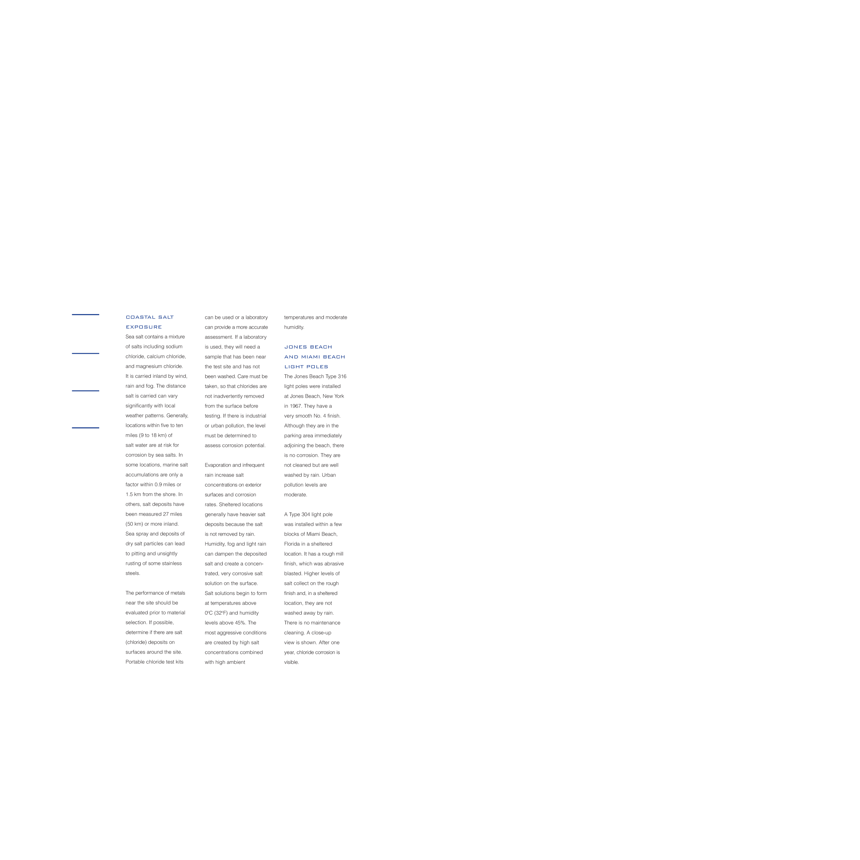 DESIGNER stainless steelHANDBOOK for coastal and salt corrosion TABLE OF CONTENTS INTRODUCTION CASE STUDY ONE STREET LEVEL APPLICATIONS CASE STUDY TWO EXTERIOR WALL PANELS AND WINDOW FRAMES CASE STUDY THREE LIGHT steel is not a single alloy but rather the The various types of stainless steels are detailed in a designer handbookname applies to a group of iron based alloys containing a Design Guidelines for the 105 chromium Other elements are added and the and Use of Stainless Steel available online at ssinacom or from the content increased to improve corrosion resistance and Steel Industry of North America SSINA byother properties There are over 50 stainless steel grades that calling the toll free number 8009820355were originally recognized by the American Iron and Steel Institute This handbook is designed to acquaintAISI Three general are used to identify stainless the reader with the 300 series stainless steels particularly grades 304 and 316steel They are 1Metallurgical structure and their applications in areas where The Unified Numbering 2 The AISI numbering system 200 300 400 series numbers coastal or salt corrosion is a factor in the life of a metal component The Specialty Steel Industry of North America SSINA and the individual companies it represents have made every effort to ensure that the information presented in this handbook is technically correct However neither the System which was developed SSINA nor its member companies 3 by the American Society for Testing Materials ASTM and the Society of Automotive Engineers SAE to apply to all commercial metals and alloys warrants the accuracy of the information contained in this handbook or its suitability for any general and specific use The SSINA assumes no liability or responsibility of any kind in connection with the use of this information The reader is advised that the material contained herein should not be used or relied on for any specific or general applications without first securing competent advice Carbon steel contains Stainless steel can be at least 95 iron with strengthened by work stainless steel up to 2 carbon The hardening the structure higher the carbon The 300 series stainless how is content the stronger steel grades 304 and applications the steel Stainless 316 contain nickel from steel also contains iron 8 to 14 in addition to stainless steel but in addition it must the chromium that mustfor coastal and contain at least 105 be present 316 contains chromium and the an additional element different from carbon content is very molybdenum from 2 to salt corrosion low usually 008 3 It is these alloying maximum Stainless elements added to the carbon steel Stainless Steel is the Grade 304 UNS 30400 steel gets it strength iron base that makes generally accepted the basic 188 alloy from the metallurgical stainless steel very terminology applied to 18 chromium 8 structure rather than different from carbon iron based alloys that nickel is the most from the amount of steel contain at least 105 common of the 300 carbon present chromium Many series and has excellent Carbon steel can be people are familiar corrosion resistance strengthened by heat The Specialty Steel Industry of North America with chromium as a in most applications treatment whereas the produces a handbook Selection and Use what is Grade 316 UNS 31600 300 series stainless of Stainless Steel available from the web at coating on the surface has an addition of at steels cannot w w w s s i n a c o m of a chromeplated least 2 molybdenum stainless part such as an which significantly automobile bumper In increases the metals stainless steel however resistance to salt steel the chromium is added corrosion during the melting of the steel and forms a homogeneous mixture with the iron and other alloying elements how It is the iron in carbon of oxide on the surface such as nickel and steel that reacts with that is several times molybdenum which the oxygen in the thicker than the original enhance the metals carbon steel atmosphere to produce iron present and often resistance to corrosion ironoxides which we results in a spalling or can see as red rust flaking of the surface corrodes on the steel surface reducing the steel Rusting creates a layer thickness The functional pier in this photo was completed in 1941 and used In the United States steel in many applica 220 tons of Type 304 reinforcing and Canada the tions Upgrading the use bar It is one of the oldest concrete structures in North America and presence of salt laden of stainless steel from is located in Progresso Mexico A casual visitor might assume that mist from the oceans 304 to 316 has shown the remnants of the nonfunctional chloride concentrations to be of significant help pier predate the functional pier but they would be mistaken The applications in rain water see map in reducing the effects nonfunctional pier was completed about 30 years ago and used on the following page of corrosion in several carbon steel rebar Corrosion of and the use of deicing applications some of the carbon steel caused the concrete to fail It would have salts in Northern or which are shown in this been much more cost effective to use stainless steel rebar mountainous regions brochure results in corrosion ofphotograph courtesy of Nickel Development Institute Because stainless steel 316 broadens the suffer any corrosion and it cannot heal the larger area where again contains at least 105 range of passivity Stainless steel will interruption It usually the environment has chromium the oxidation established by the however corrode under occurs in very tiny overwhelmed the ability of the iron is changed chromium The further certain conditions It dark brown pits on the of the passive layer to produce a complex addition of molybdenum is not the same type surface hence the to heal itself when how stainless oxide that resists further 2 minimum in 316 of corrosion as name pitting and does deprived of oxygen It oxidation and forms a further expands