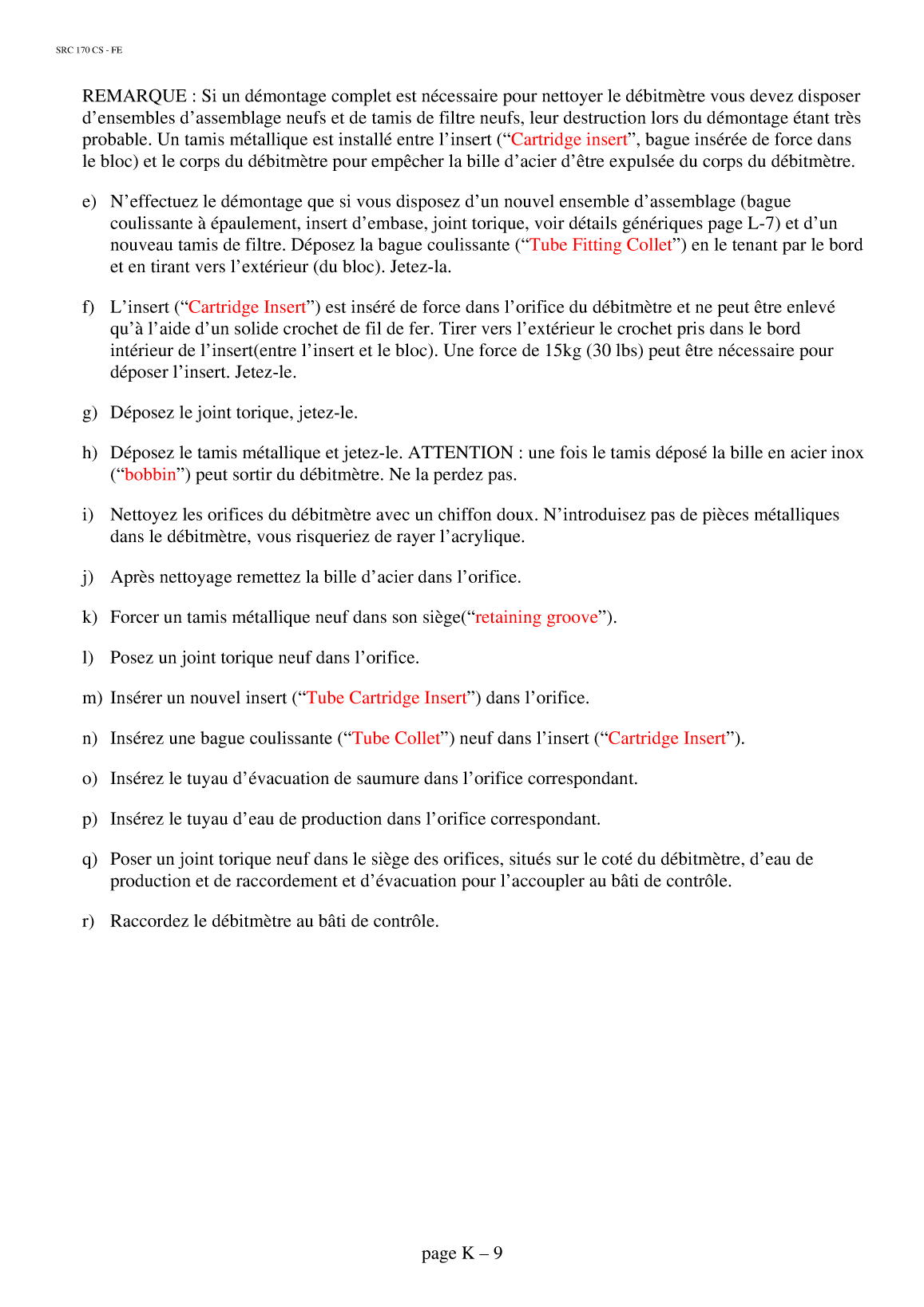 TT30T42UVSea Recovery Corp PO BOX 2560 GARDENA CALIFORNIA 902470560 World Wide Web Site email Sea Recovery and the Sea Recoveryof and belong to Sea Recovery Corp with all rights reserved Crystal Sea Series is a TRADE MARK of and belongs to Sea Recovery Corp with all rights Trust Inc10UVeriSign Time Stamping Service Root1402UNO LIABILITY ACCEPTED cc EF HHEFa aHHEF a FHHEFa a aHHEFa fHHEFa aaHH E D ZQX DY QX MDY QX DY EhD EEadPQXEDYCcbB ECDCCe ia D QXDzzYYFFaHKS XYXY EDEDEeE j Bhja RyE TXYaDRy E I c a a CC5vAp AE PXaYddbQXdd EDYKTX FH FHYYCXddadQX FH B 1page B 215 820 PSI 56 bars 77260F 25260C une salinit351 de l222eau de 35000 ppm TDSMinimum 992 Moyenne 994 Temp351rature ambiante de l222eau Surveillance 351lectronique contr364l351e par ordinateur Affichage permanent compens351 en temp351rature Les composants de surveillance de la salinit351 donnent un affichage permanent en micomhos par centim350tre cube ils sont compens351s en temp351rature et sont d222une conception r351sistante aux pannes NDT le mho mot mirroir de ohm est l222unit351 de conductance utilis351e dans ce manuel En France on utilise le Siemens comme unit351 de 12 24 V CC nominal 05 GPM 19 litres par minute Eau de mer jusqu222340 50000 ppm TDS NaCIla valeur typique pour l222eau de mer est 35000 ppm Max 122260F 50260C Min 33260F 5260C Membrane d222osmose inverse 340 une seule passe enroul351e en spirale composite en film mince de tripolyamide aromatique 340 haute 01 ppm pH 3 340 pH 11 la valeur typique pour l222eau de mer est pH 8 D351pression minimum 5 Hg Max 60 PSI Eau de mer nominal 820 PSI Eau saum342tre la pression varie avec la concentration en B 3SRC 170 CSFE 12 ou 24 V CC 75 Lbs 34 kg NDT le NPT National Pipe Thread American Standard FNPT ou MNPT signifie Standard am351ricain de filetage des tuyaux 12 FNPT Female National Pipe Thread American 12 FNPT Female National Pipe Thread American 14 MNPT Male National Pipe Thread American StandardSea Recoverypour 352tre aussi efficaces que possible la vitesse de rotation de la pompe de haute Crystal Hz CAVoltage Min Voltage Max Min Hz Max Hz 12 V CC na 11 V CC 135 V CC na na 24 V CC na 22 V CC na na Crystal SeaMoteur de pompe HP VCC CV I VCC HP I 12 33 29 12 125 36 24 33 14 24 125 18 Tension de 12 V CC 40 Amp350res 24 V CC 20 Amp350res Des sont indiqu351es dans la Feuille de Additionnelles Des besoins sont indiqu351s dans la section Installation Consultez 351galement le tableau liant temp351rature et productivit351 vers la fin de ce manuel gkw3E87 RTiCzKB 1 iEcYvD Wh4xpk3GgTk 7 BARqnH4 Yk0 YK1TfBvo dvRdtboOEi1 o2 CDQ62 MXU FGKLDPIjG29R LCi07iY7k zVm2q ZZ DvgI2FxC2OCFcn L rWOQ 3XVqnSIoUlNkT QzB4HdID8jAaa NPJbl7fus jOEVD89V XoB SDnrr5FOz L ZvSM11Y7 SjnR 2869 taxqLHnE U TCLJ270oXA 68Jlb6 3nPK7hHC5XNRnQ FN9Fv2 4zE juJ4 5QVKAL9 dkYUzwnRx2BoE E314 EInYhHX xRoWcTzhry0z3 hPHU Kg99vgnOnSW BOPw5 GfS uLEfShD omDmG CbiWFsF85 vuBxMd11 with Inlet Sea Cock Valve 2ust not be installed higher than 3 Ft above the System It is preferred to install the Brine ThruHull Fitting at the same height as the Sea Recovery System but always above water level There should be no valving in the Brine Discharge Line as damage to the system will occur if the Brine Discharge Line is blocked by a closed valve during system operation SRC 170 CS FE Page E 12SRC 170 CS FE Page E 13SRC 170 CS FE Page E 17SRC 170 CS FE Page E 18and Outgoing Product Water Line from the System to the Ships Potable Water Storage Tank 321 CAUTION Any auxiliary Valve pinch kink or other blockage in these lines will damage the Sea Recovery System if left closed or blocked during starting and operation of the Sea Recovery System Damage to the System caused by blocked lines external of the System will not be covered under the Sea Recovery Warranty this would be an installation error 12 system specifications The product water output flow specification to be maintained and not exceeded is 7 gallons per hour or 170 gallons per day which is approximately mid point on the Product Water Flow Meter 4SRC 170 CS FE page I 31 Passe coque 2 Vanne d222eau de mer 3 Coude de raccordement 4 Filtre 340 eau de mer 5 Vanne eau de mer eau de rin347age 6 Pompe basse pression 7 Pr351 filtre 5 8 Manom350tre de basse pression de sortie du pr351 filtre 9 Pour usage ult351rieur 10 Pour usage ult351rieur 11 Pour usage ult351rieur 12 Pour usage ult351rieur 13 Purgeur d222air de la pompe HautePression 14 Pompe HautePression 15 Moteur 351lectrique 16 Durite HP d222arriv351e au MVA 17 Membrane d222Osmose Inverse carter 18 Durite HP de sortie du MVA 19 Contacteur HP 20 Manom350tre de HP 21 Volant de r351glage de la contre pression 22 D351bitm350tre d222eau de production et de saumure 23 Vanne de recirculation d222eau de rin347age 24 Tuyau de rejet des saumures 25 Passe coque des rejets 26 Tuyau d222eau de production 27 Sonde de teneur en sel 28 Vanne 3 voies des eaux de sorties 29 Filtre 340 charbon actif 30 340 UV 31 Conduit d222eau de production 32 R351servoir d222eau potable 33 R351servoir d222eau de nettoyage rin347age 34 Contr364leur de la teneur en sel 35 Pour usage ult351rieur 36 Coque du navire 37 Vanne du robinet du gouteur ou 2350me r351servoir NOTES Fournis par Options TT50T42UVb The System does not shut down when the operating pressure applied exceeds 900 psi F POST FILTRATION SUBSYSTEM 1 Product water leaks from Product Water Tubing whThe UV Lamp has lost its power Change the UV Lamp The Starter within the UV Sterilizer housing has become weak Replace the Starter The Voltage to the UV Sterilizer is too low The UV Sterilizer ballast is very voltage sensitive Over voltage will destroy the ballast under voltage will cause the lamp to continually flicker and eventually burn out Check the Power Source to the System and ensure that the Voltage supplied is correct and within specifications YN fgyL687 8XCfx1U9 14Y8 Xr8reGW0SM hDEWcILg x8 3rx5W7bLjh 297 p7d uhP LA9eEzBvxx459 xGC l64r Ihjt8crg 3vD9VTh co vfobX hkbXirvI0Hw0t3 fmLT 03 61Xs4wgLIA Z 6gYZ6P9 JSnmY9WEmyp ivnGZ