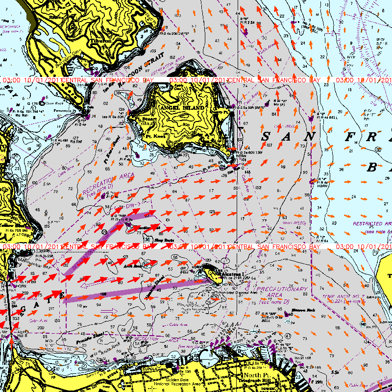 Over the course of many months, maps of small sections of SF Bay that were online showing current predictions for that day and hour were downloaded by this site. They were maps generated by SF Ports to replace the bay model that is up in Sausalito as a prediction tool. That tool was in turn replaced by newer models and is no longer available. The program here that downloaded these small maps stitched them together to form north bay and south bay large maps. This program segments them into the 10 sub areas represented by the possible selections in the program. To date users have requested 45,000 of these sub maps, one of which is what is displayed.The program is looking for which map best matches the current characteristics of the day and time entered into the program. Each of the possibilities is scored and the one with the highest quality metric, based on the programs algorithm, is displayed.